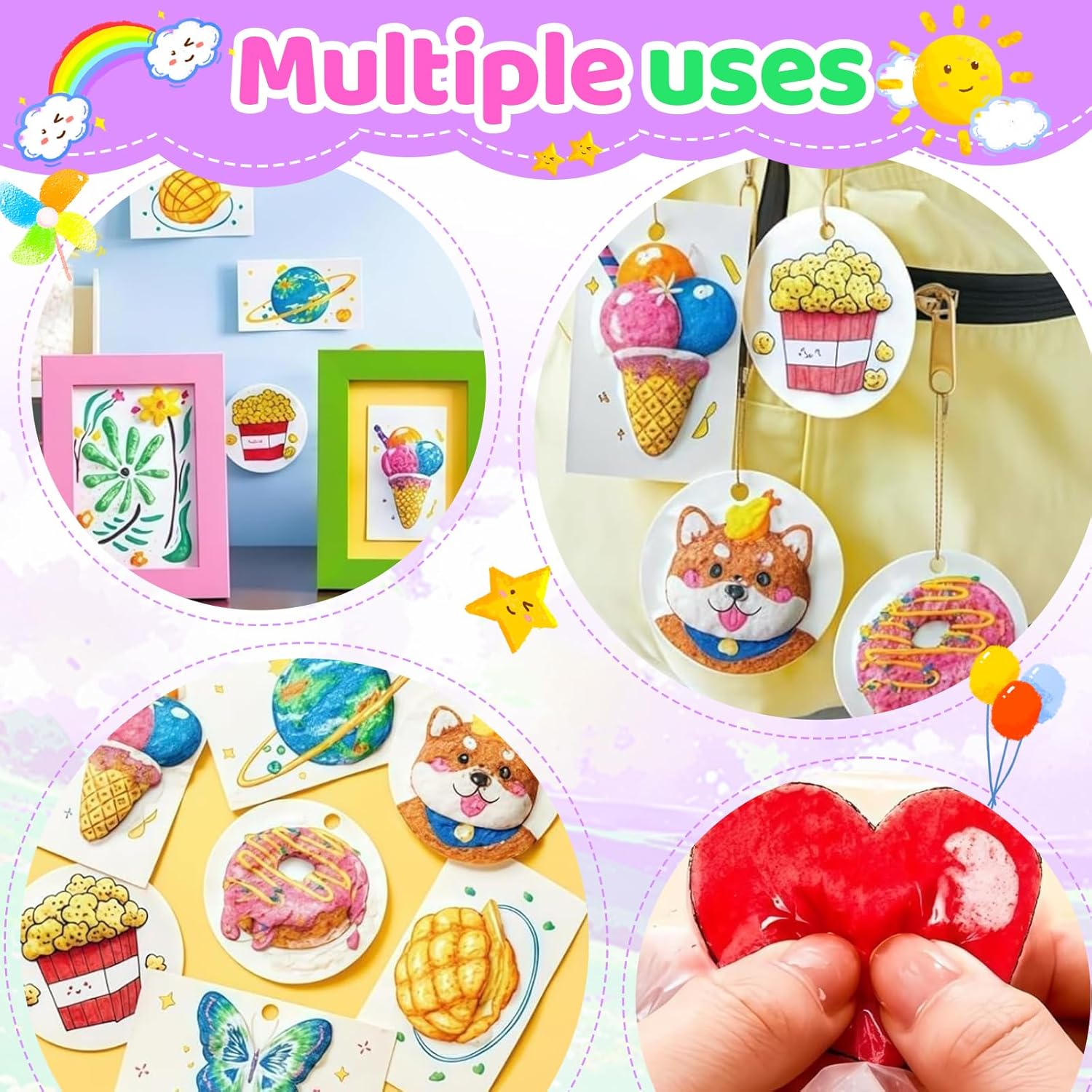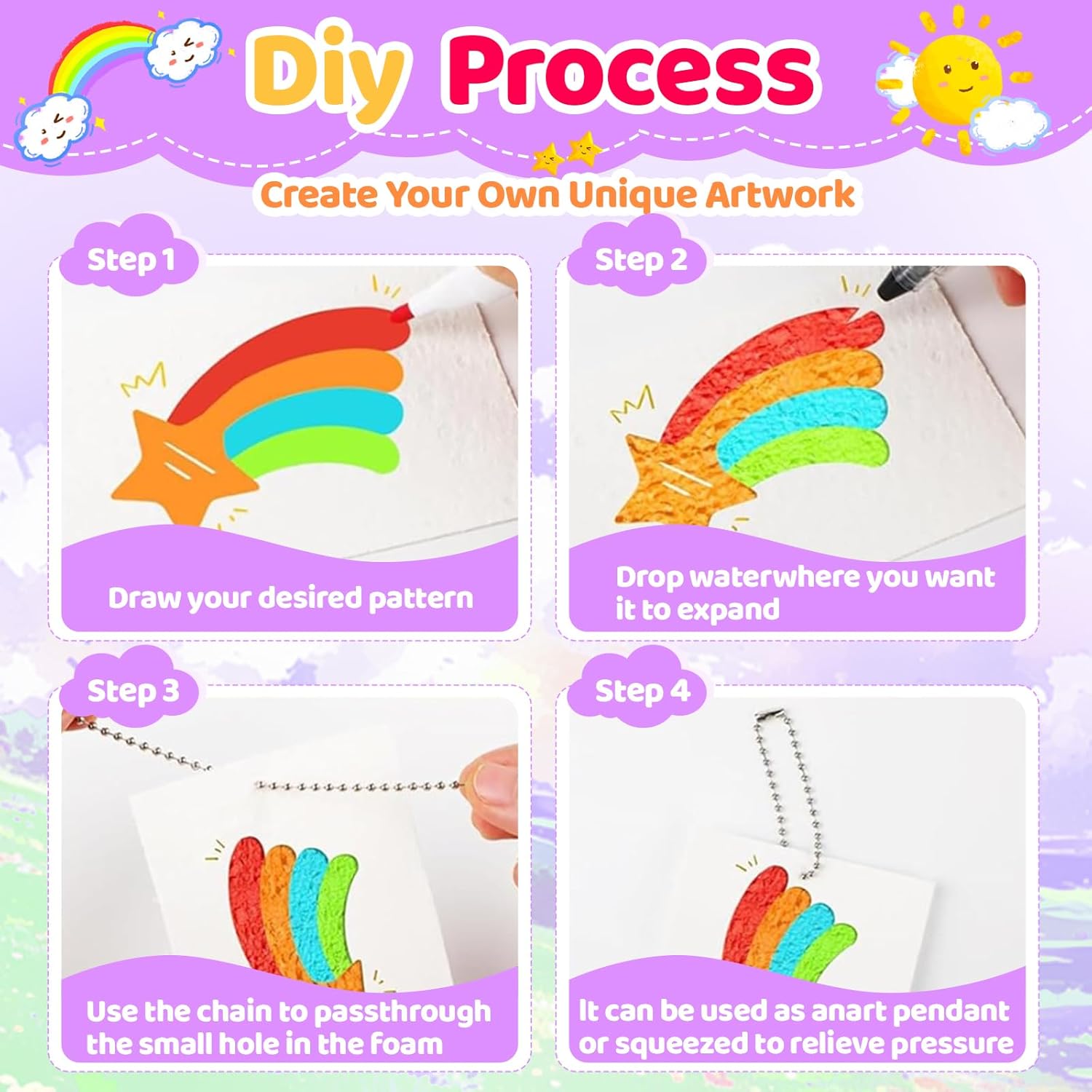 Confezione inclusa: Magic Paint contiene 10 fogli di carta espansa testurizzata, 1 set con 12 pennarelli colorati, 10 collane di perline, 3 matite acquerellabili con punta morbida (grande, media, piccolo) e 1 mini cavalletto. In questo modo è possibile progettare secondo i vostri desideri. Materiali speciali: basta disegnare su carta, immergere una penna bagnata nell'acqua e il design si allunga come per magia. Questo speciale materiale in schiuma reagisce all'acqua e dona alla tua opera d'arte un divertente effetto 3D. Facile da usare: disegna, colora o timbra il tuo disegno su carta o qualsiasi superficie e poi inumidisci la penna con un po' d'acqua per trasformare istantaneamente l'arte piatta in un capolavoro strutturato in rilievo, senza bisogno di attrezzi speciali. Regali creativi: con questa carta spugnosa è possibile creare lavori artigianali, timbri, poster, decorazioni natalizie o regali personalizzati. Il soffice effetto 3D migliora notevolmente la trama di album di ritagli, decorazioni per feste e regali personalizzati e rende unici i tuoi regali! Ampia gamma di applicazioni: perfetto per artigianato, progetti scolastici, pittura, timbratura e creazione di biglietti di auguri o poster personalizzati. Questa carta è compatibile con tutti gli strumenti di disegno, basta aggiungere acqua e sperimentare la magia.