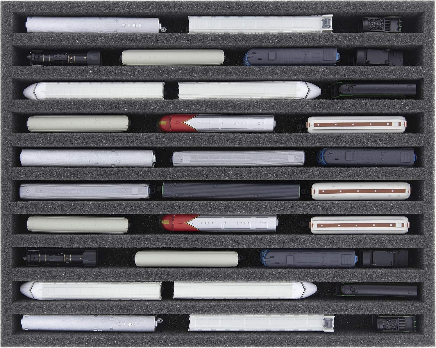 Scatola di immagazzinamento Feldherr FSLB040 incl. inserto in schiuma con 10 slot per modellismo ferroviario in scala Z. Per lo stoccaggio protetto e il trasporto sicuro di treni e vagoni. Il set è composto da una scatola di immagazzinaggio FSLB040, un inserto in schiuma a grandezza naturale per modellini ferroviari in scala Z e il topper in schiuma abbinato. L'inserto è suddiviso in 10 scomparti, fatti su misura per i modellini ferroviari in scala Z, in posizione eretta. Ognuno dei 10 scomparti è lungo 325 mm x largo 17 mm x profondo 25 mm. In uno stesso scomparto è possibile riporre diversi treni e carrozze uno accanto all'altro. I distanziatori sono disponibili separatamente (HS025A002). I modelli sono conservati in modo sicuro tutt'intorno. La schiuma di alta qualità li protegge in modo affidabile e permanente da danni e usura, come graffi e sfaldamenti della vernice. La scatola di immagazzinamento è realizzata in cartone rivestito a doppia parete e quindi non solo è piacevolmente leggera, ma anche particolarmente resistente agli strappi e stabile. 👉 Le figure e i componenti del gioco mostrati sono solo per confronto di dimensioni e non sono inclusi. I modelli stampati in 3D possono presentare piccole imperfezioni. Le immagini del prodotto mostrano possibili risultati finali.
