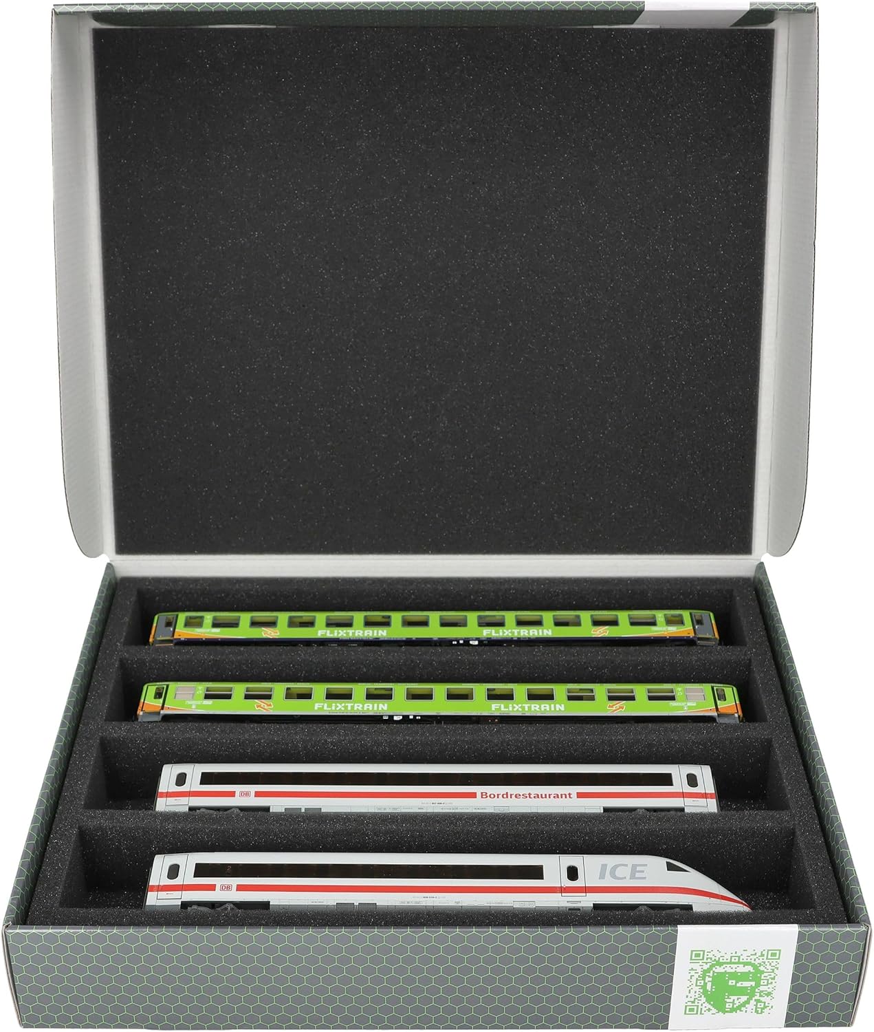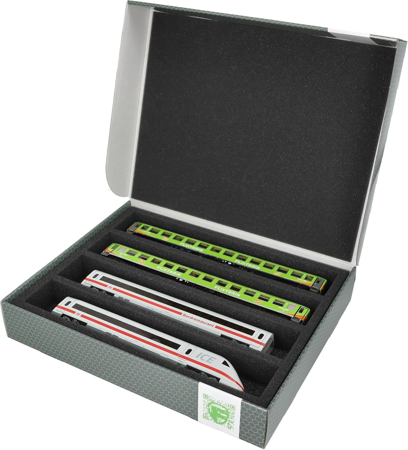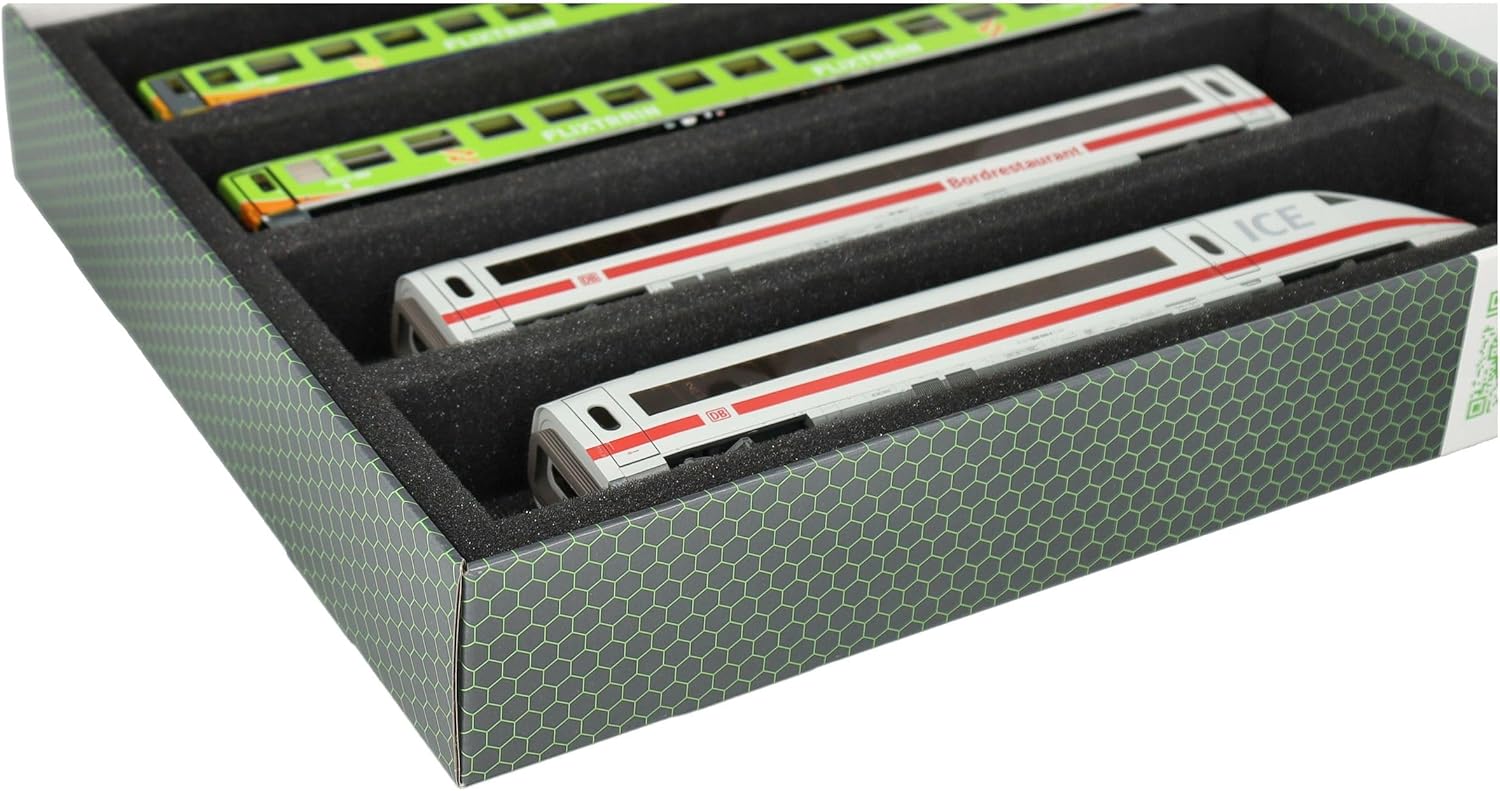 Scatola di immagazzinamento Feldherr FSLB055 con inserto in schiuma e 4 slot per modellismo ferroviario in scala H0. Per conservare, presentare e trasportare in sicurezza i vostri treni e vagoni. Il set è composto da una scatola di immagazzinaggio FSLB055, un inserto in schiuma a grandezza naturale per modellini ferroviari in scala H0 e il topper in schiuma abbinato. L'inserto è diviso in 4 scomparti, fatti su misura per i modellini ferroviari in scala H0, in posizione distesa. Ognuno dei 4 vani misura 320 mm di lunghezza x 55 mm di larghezza x 40 mm di profondità. In uno scomparto è possibile riporre diversi treni e carrozze uno accanto all'altro. I distanziatori sono disponibili separatamente (HS040A002, HS020A001). I modelli sono conservati in modo sicuro tutt'intorno. La schiuma di alta qualità li protegge in modo affidabile e duraturo da danni e usura, come graffi e sfaldamenti della vernice. La scatola di stoccaggio è realizzata in cartone rivestito a doppia parete e quindi non solo è piacevolmente leggera, ma anche particolarmente resistente agli strappi e stabile. 👉 Le figure e i componenti del gioco mostrati sono solo per confronto di dimensioni e non sono inclusi. I modelli stampati in 3D possono presentare piccole imperfezioni. Le immagini del prodotto mostrano possibili risultati finali.