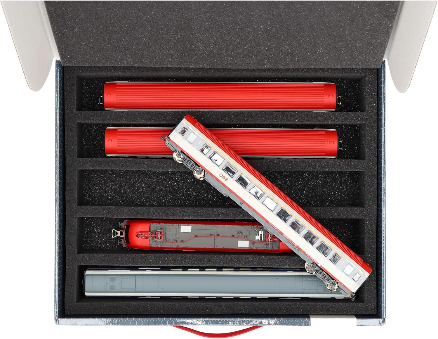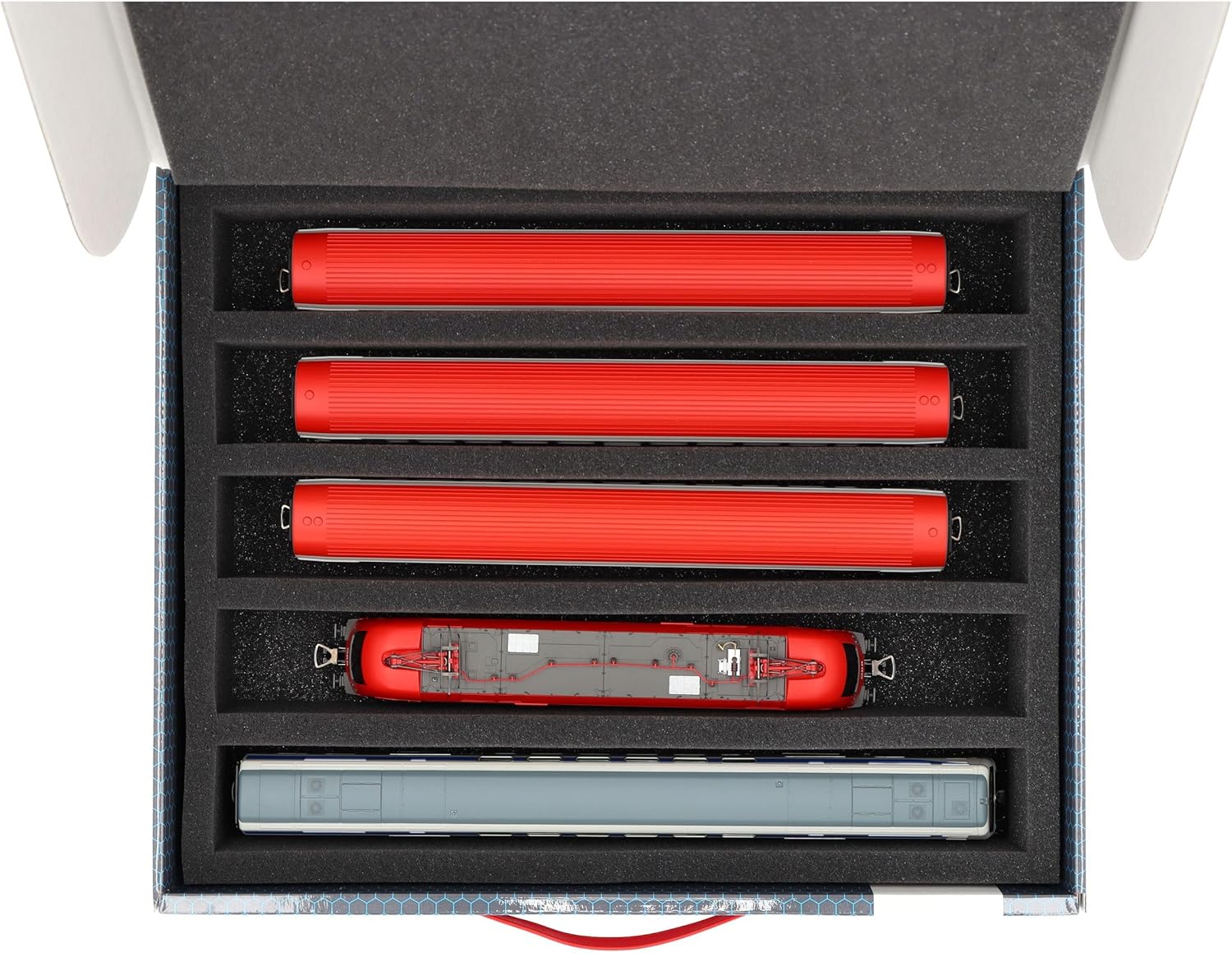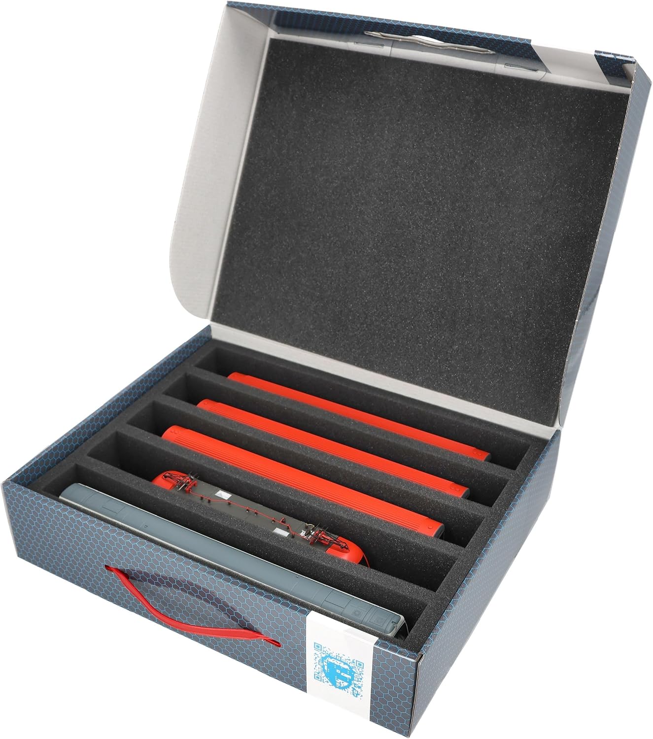 Scatola di immagazzinamento Feldherr FSLB075 con vassoio in gommapiuma e 5 slot per modellismo ferroviario in scartamento H0. Per conservare e trasportare in sicurezza treni e vagoni. Il set è composto da una scatola di immagazzinaggio FSLB075, un inserto in schiuma a grandezza naturale per modellini ferroviari in scartamento H0 e il topper in schiuma abbinato. L'inserto è diviso in 5 scomparti, fatti su misura per i modellini ferroviari in scartamento H0, in posizione eretta. Ognuno dei 5 scomparti è lungo 320 mm x largo 40 mm x profondo 55 mm. In uno stesso scomparto è possibile riporre diversi treni e carrozze uno accanto all'altro. I distanziatori sono disponibili separatamente (HS040A002). I modelli sono conservati in modo sicuro tutt'intorno. Sono protetti in modo affidabile e permanente dalla schiuma di alta qualità contro i danni e l'usura, come i graffi e la vernice che si sfalda. La scatola di immagazzinamento con maniglia di trasporto è realizzata in cartone rivestito a doppia parete e quindi non solo è piacevolmente leggera, ma anche particolarmente resistente agli strappi e stabile. 👉 Le figure e i componenti del gioco mostrati sono solo per confronto di dimensioni e non sono inclusi. I modelli stampati in 3D possono presentare piccole imperfezioni. Le immagini del prodotto mostrano possibili risultati finali.