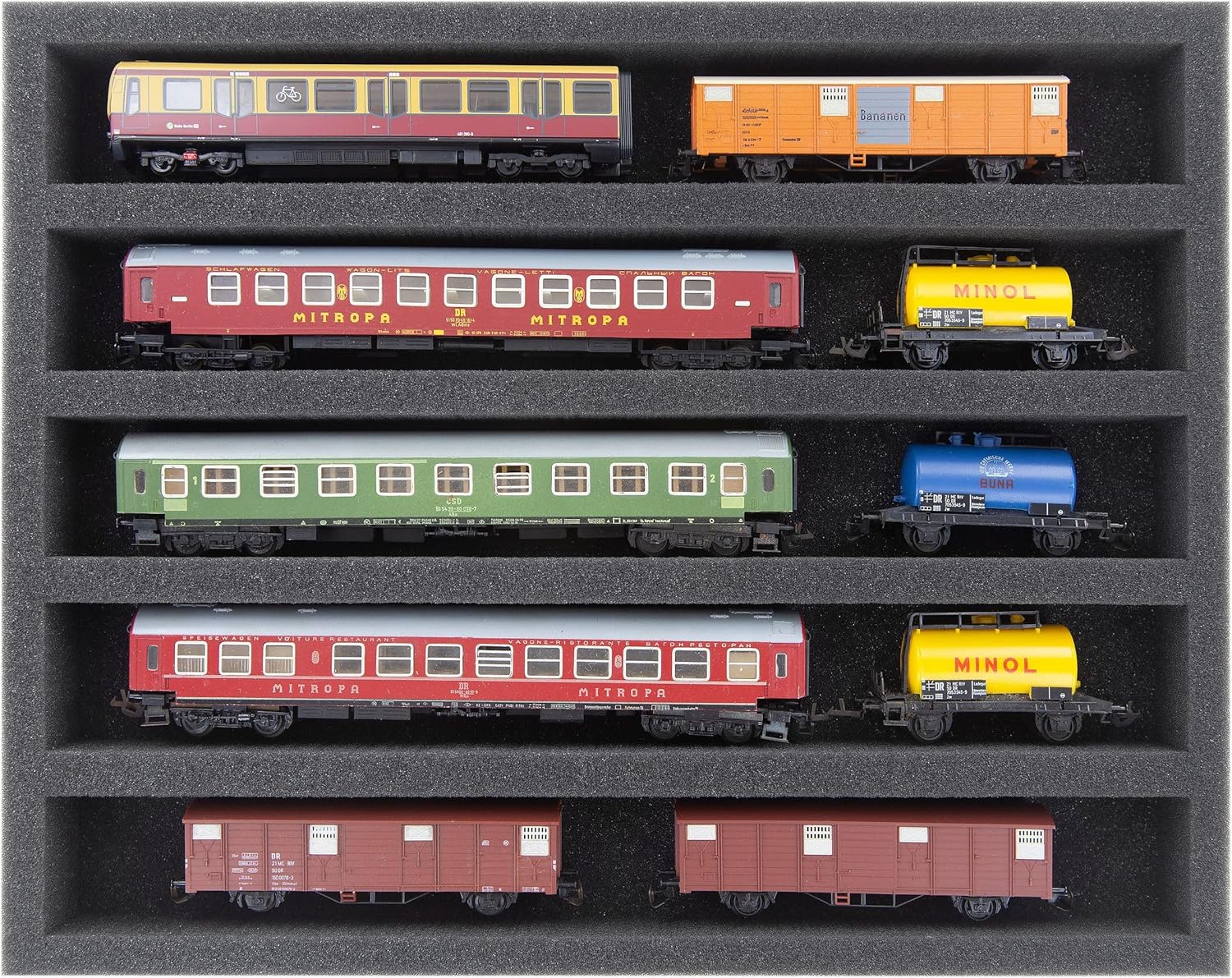 Scatola di immagazzinamento Feldherr FSLB040 con inserto in schiuma e 5 slot per modellismo ferroviario in scala TT. Per conservare, presentare e trasportare in sicurezza i vostri treni e vagoni. Il set è composto da una scatola di immagazzinamento FSLB040, un inserto in schiuma a grandezza naturale per modellini ferroviari in scala TT e il topper in schiuma abbinato. L'inserto è suddiviso in 5 scomparti, fatti su misura per i modellini ferroviari in scala TT, in posizione distesa. Ognuno dei 5 scomparti è lungo 320 mm x largo 40 mm x profondo 30 mm. In uno scomparto è possibile riporre diversi treni e carrozze uno accanto all'altro. I distanziatori sono disponibili separatamente (HS040A003). I modelli sono conservati in modo sicuro tutt'intorno. La schiuma di alta qualità li protegge in modo affidabile e permanente da danni e usura, come graffi e sfaldamenti della vernice. La scatola di immagazzinamento è realizzata in cartone rivestito a doppia parete e quindi non solo è piacevolmente leggera, ma anche particolarmente resistente agli strappi e stabile. 👉 Le figure e i componenti del gioco mostrati sono solo per confronto di dimensioni e non sono inclusi. I modelli stampati in 3D possono presentare piccole imperfezioni. Le immagini del prodotto mostrano possibili risultati finali.