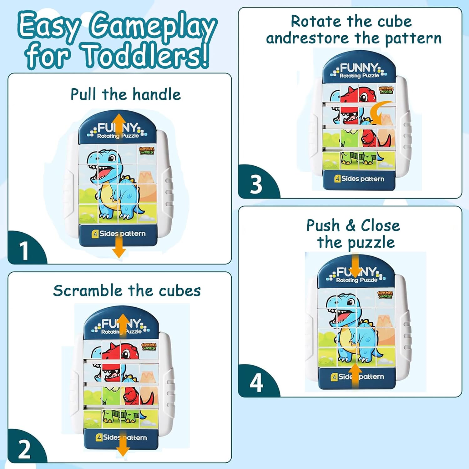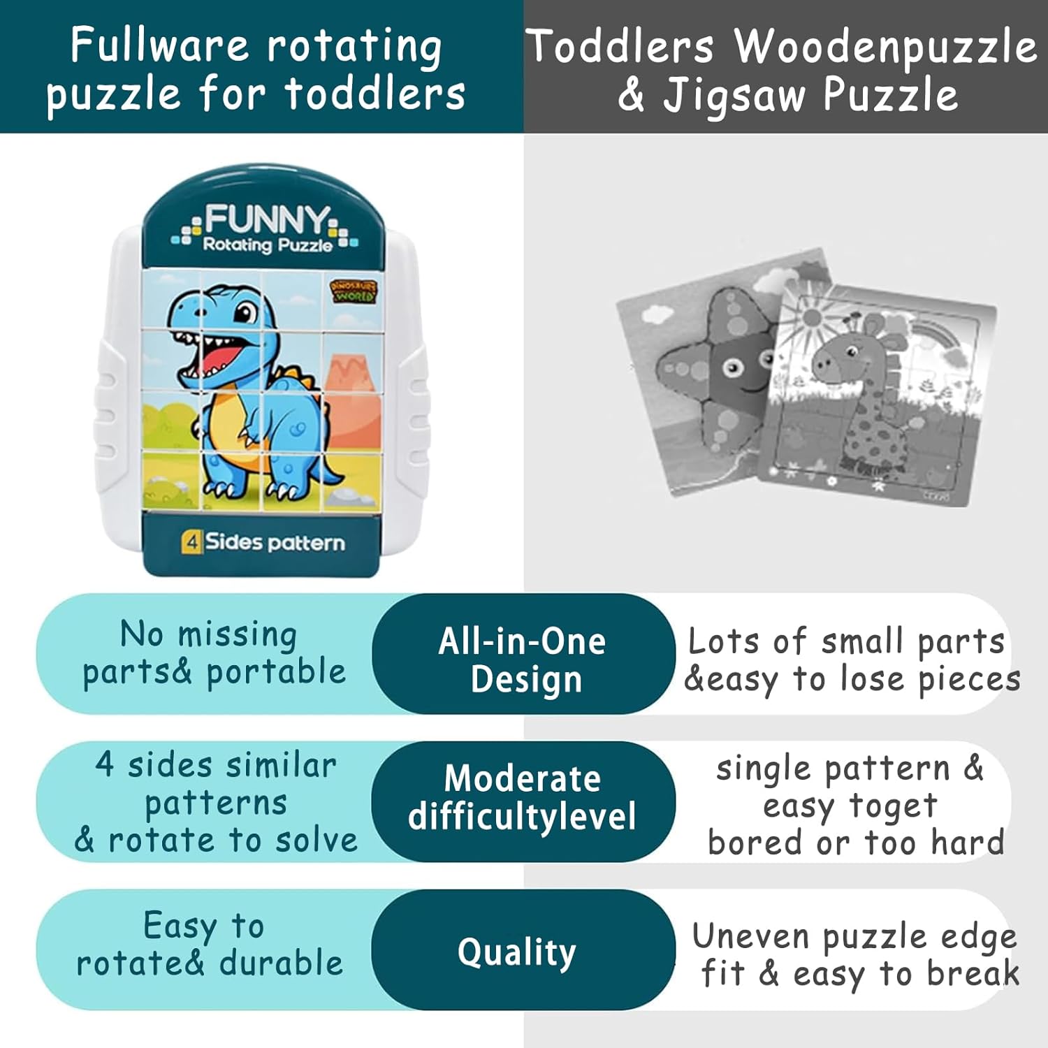 🧩【Divertente Puzzle Rotante 3D】 L'interessante puzzle rotante è composto da 16 pezzi che possono essere combinati in 4 modelli. I bambini devono ruotare 16 blocchi e posizionarli nella posizione corretta, aiuta a migliorare l'intelligenza dei bambini 🧩【100% Sicuro per i Bambini】 Realizzato in plastica ABS di alta qualità, resistente, atossica e priva di BPA, i bordi lisci non feriranno le dita dei bambini. Puoi lasciare che i tuoi bambini giochino in tutta tranquillità. Inoltre, grazie al design integrale, i puzzle Montessori per bambini non rischiano di perdere pezzi 🧩【Giochi di Educativi Montessori】 Il nostro puzzle rotante ha 4 motivi simili. Non solo si divertirà per ore a ruotare i pezzi del puzzle nella posizione corretta, ma migliorerà anche la coordinazione occhio-mano, la percezione delle immagini e le capacità di pensiero logico 🧩【Giocattoli da Viaggio Portatili】 le dimensioni dei puzzle educativi sono 15.5x 2.5x 12.5cm, dimensioni ridotte, facile da trasportare. Quando viaggi in aereo o in macchina, puoi tirarlo fuori in qualsiasi momento per far giocare i tuoi bambini. Molto adatto per viaggi in famiglia 🧩【Regali per Bambini】Questo simpatico puzzle di dinosauri dei cartoni animati è divertente ed educativo e sviluppa molteplici abilità. I modelli divertenti e i colori vivaci diventeranno rapidamente i preferiti del tuo bambino. Puoi regalarli a bambini e bambine per Natale, compleanni e feste