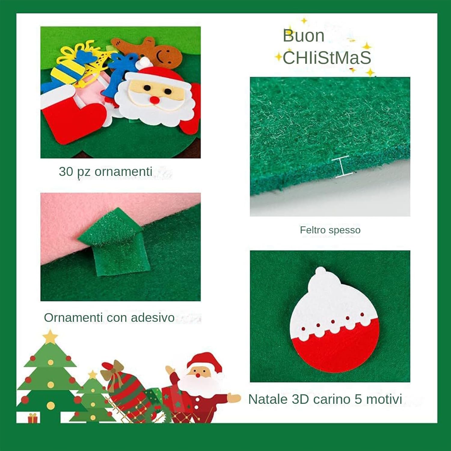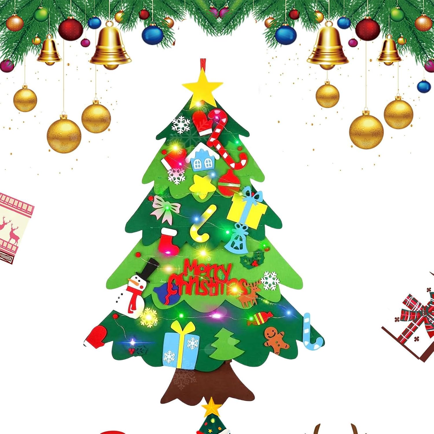Creatività sbloccata: lascia che l'immaginazione dei tuoi figli si scateni con questo albero di Natale fatto a mano per i bambini. Questa attività incoraggia la creatività, migliora l'immaginazione e sviluppa flessibilità, aprendo la strada a un'esperienza natalizia divertente e appagante Uso ampio: il nostro albero di Natale per bambini è meraviglioso per aggiungere un tocco di spirito natalizio a qualsiasi stanza. Misurando 39,4 per 27,6 pollici, è adatto per decorare pareti, porte, vivai, aule, soggiorno, sala giochi e camere da letto. I bambini adoreranno organizzare le decorazioni rimovibili Presente premuroso: questo ha sentito l'albero di Natale per i bambini è un modo incredibile per promuovere le capacità di sviluppo indispensabili. Si unisce a tuo figlio mentre migliora efficacemente la loro destrezza manuale, coordinazione per gli occhi a mano, capacità motorie e riconoscimento del colore. Rafforza il tuo con tuo figlio questo Natale con un regalo pratico ma pieno di divertimento Aspetto accattivante: con le sue vibranti decorazioni staccabili tra cui Babbo Natale, Snowmen e altro ancora, questo albero di Natale è meraviglioso per creare un'atmosfera e visivamente accattivante per le vacanze Felvo robusto: realizzato in materiale in feltro sicuro e robusto con ganci saldamente cuciti, il nostro albero di Natale per bambini con una serie di luci da 3 metri che non cadrà facilmente nemmeno nelle mani dei bambini e corre su 2 batterie AA non incluse, creando un ambiente incantevole per le vacanze