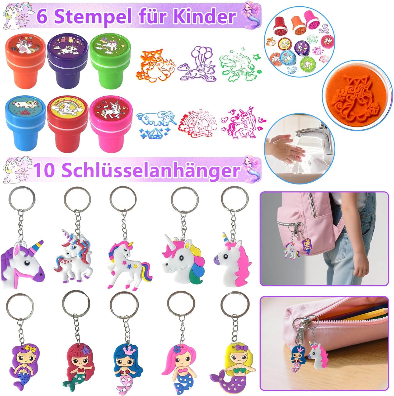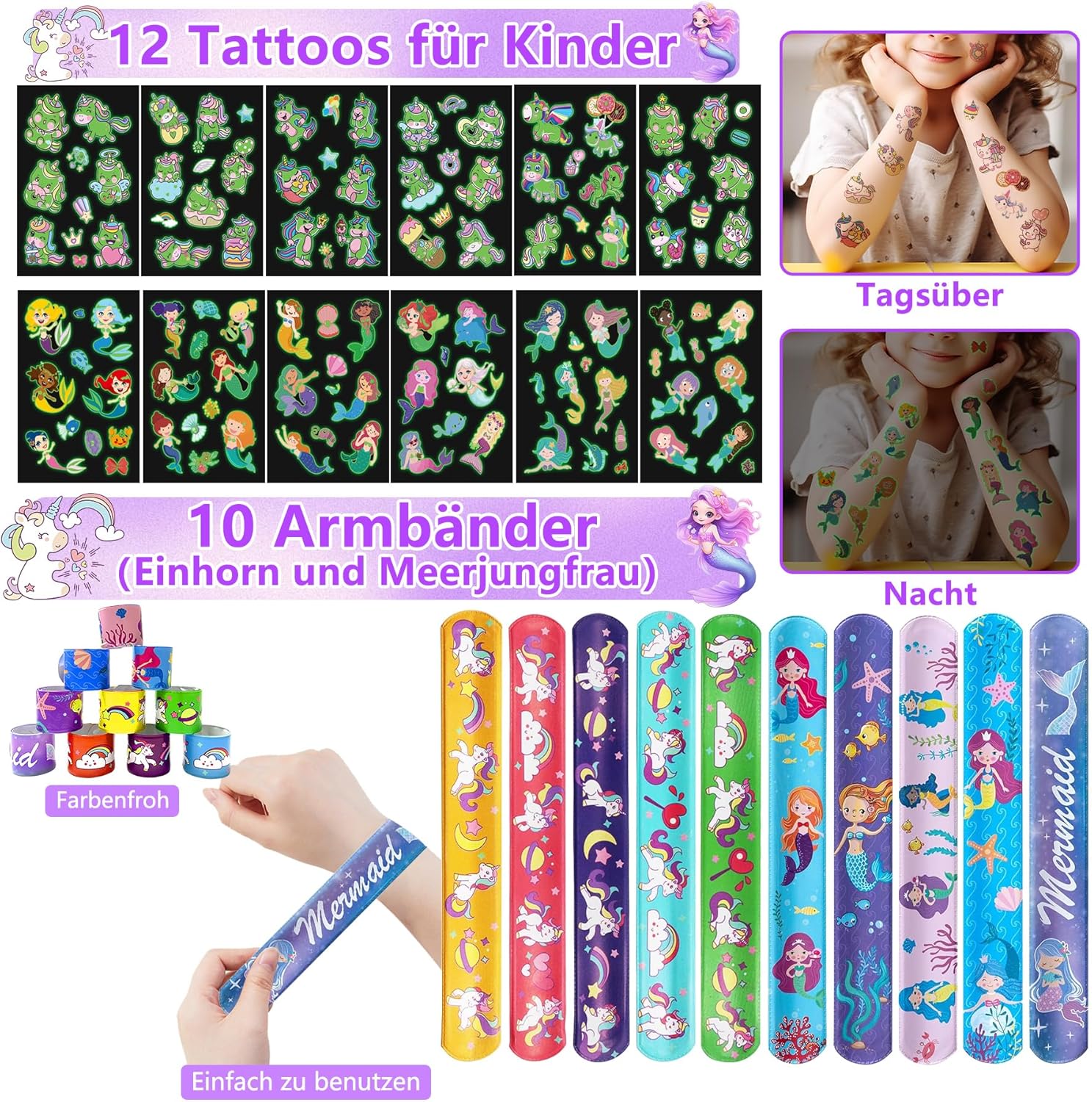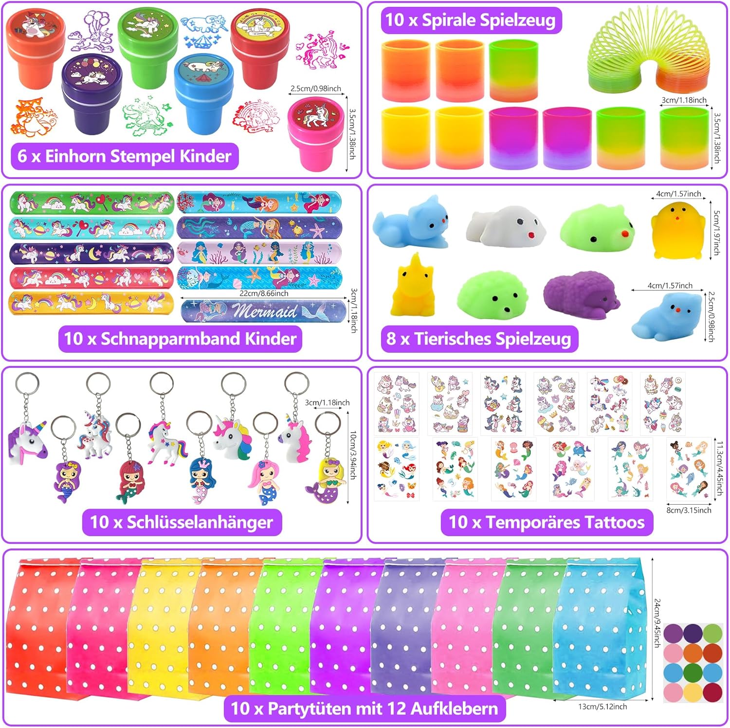 【Decorazione di compleanno con sirena di unicorno】FEMBW offre regali per feste con un tema di unicorno e sirena per i compleanni delle ragazze. Il set per bomboniere da 66 pezzi include 10 portachiavi, 10 giocattoli a spirale, 12 adesivi per tatuaggi che si illuminano al buio, 10 braccialetti a scatto, 10 sacchetti di carta, 6 francobolli, 8 animali di peluche e confezioni di cartoni animati. Questo è un fantastico regalo a sorpresa per 3 4 5 6 7 8 9 anni. 【Design carino e interessante】 Il design unico della sirena e dell'unicorno, i colori vivaci e i design vari attirano l'attenzione dei bambini. Con i peluche i bambini possono rilassare il loro nervosismo stringendoli. Interessanti giocattoli a molla si espandono e si contraggono per allenare i movimenti delle mani. 【Adesivi luminosi per tatuaggi】 Dopo l'irradiazione in un luogo luminoso o buio, gli adesivi per tatuaggi per bambini si illuminano, il che è molto popolare tra i bambini. Lo schema è vario e non si ripete. Ci sono anche francobolli per decorare articoli di cancelleria, quaderni, libri, ecc. 【Piccoli regali per bambini】Sacchetti di carta colorati per feste, puoi mettere i giocattoli nei sacchetti uno per uno e distribuirli ai bambini. Grazie al design opaco, i bambini possono scegliere le borse in modo casuale, aggiungendo più divertimento e sorpresa. 【Materiale di alta qualità】 I pacchetti per feste di unicorno sono realizzati in plastica di alta qualità, borsa di stoffa e materiale in gomma, bellissimo motivo, stampa chiara, nessun odore, bordi lisci e senza sbavature, perfetti per i bambini.
