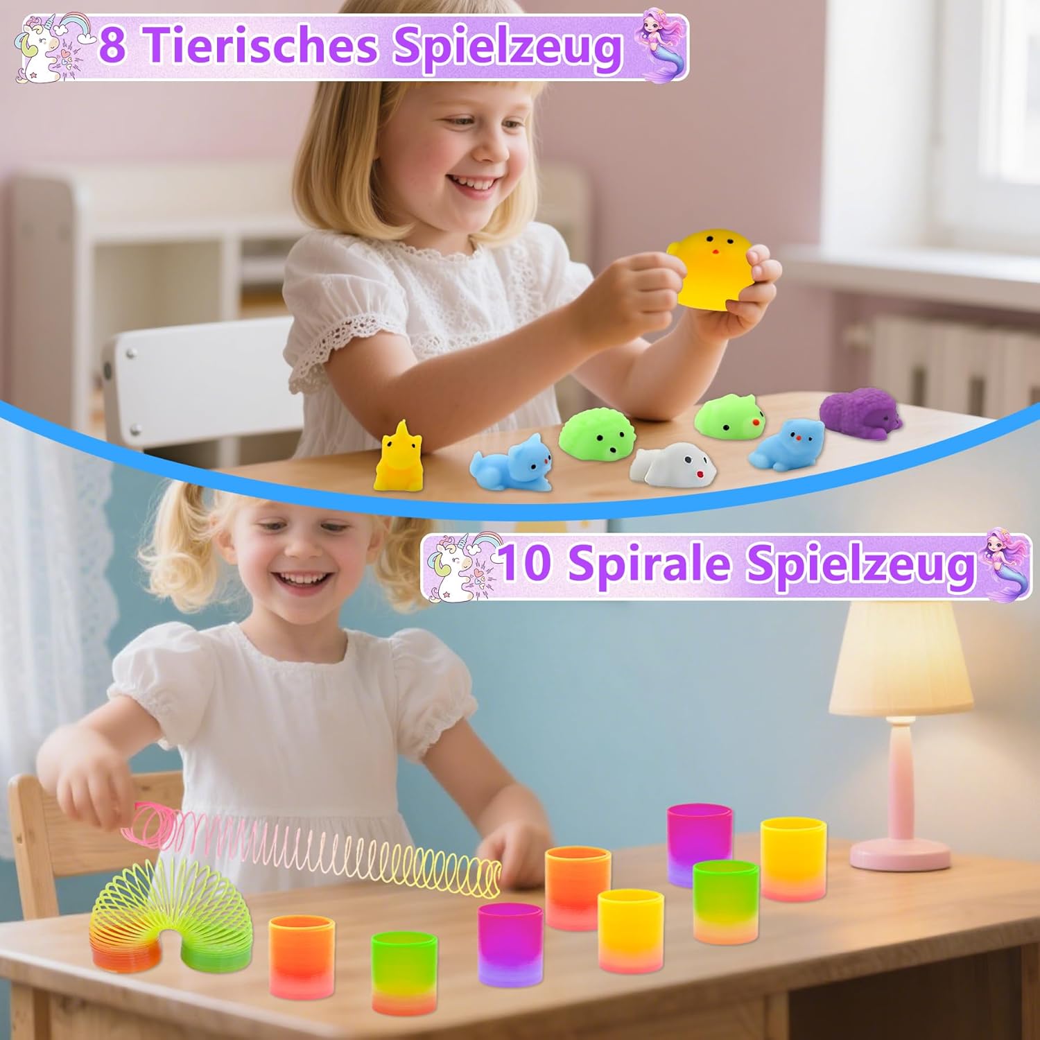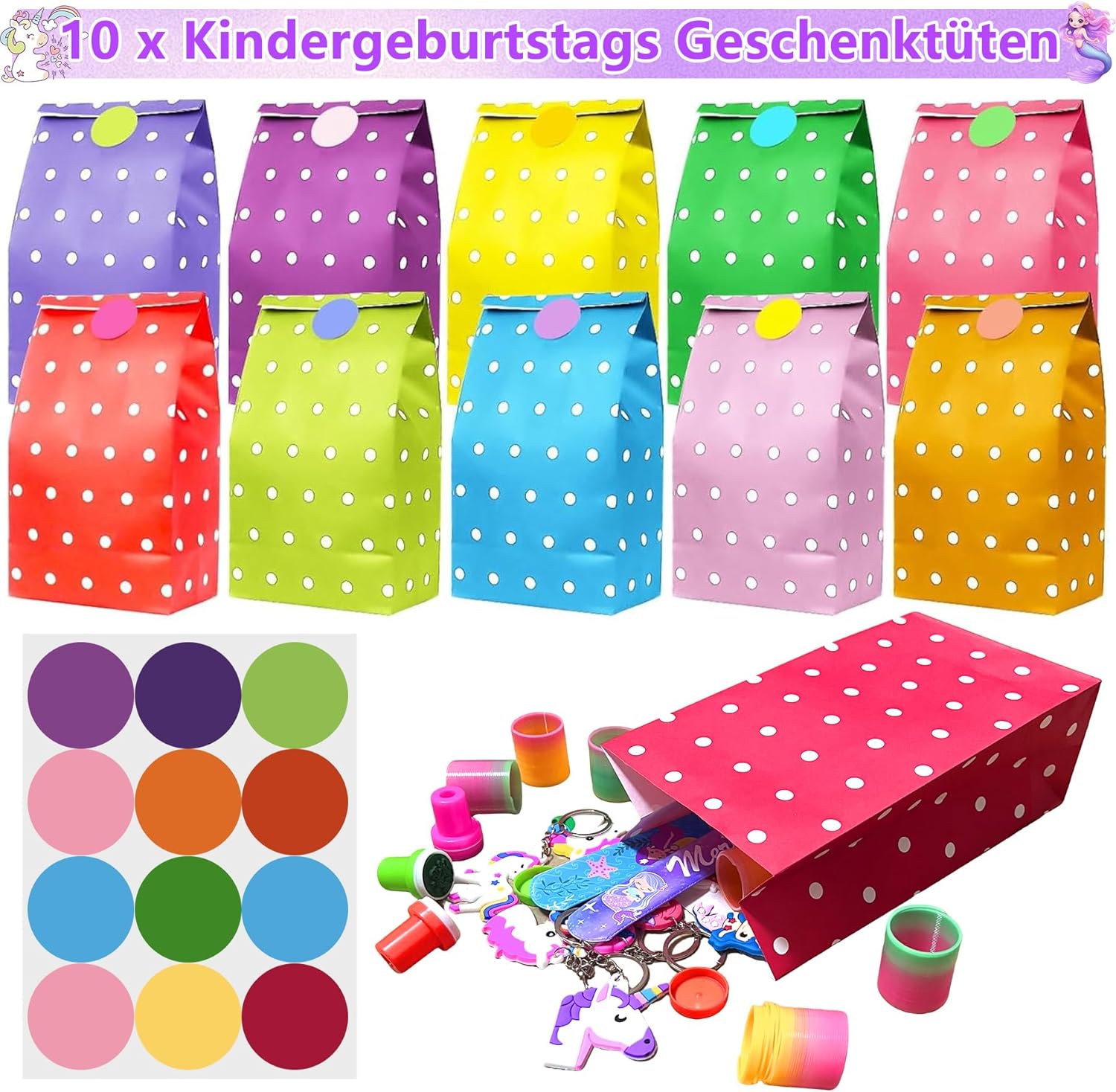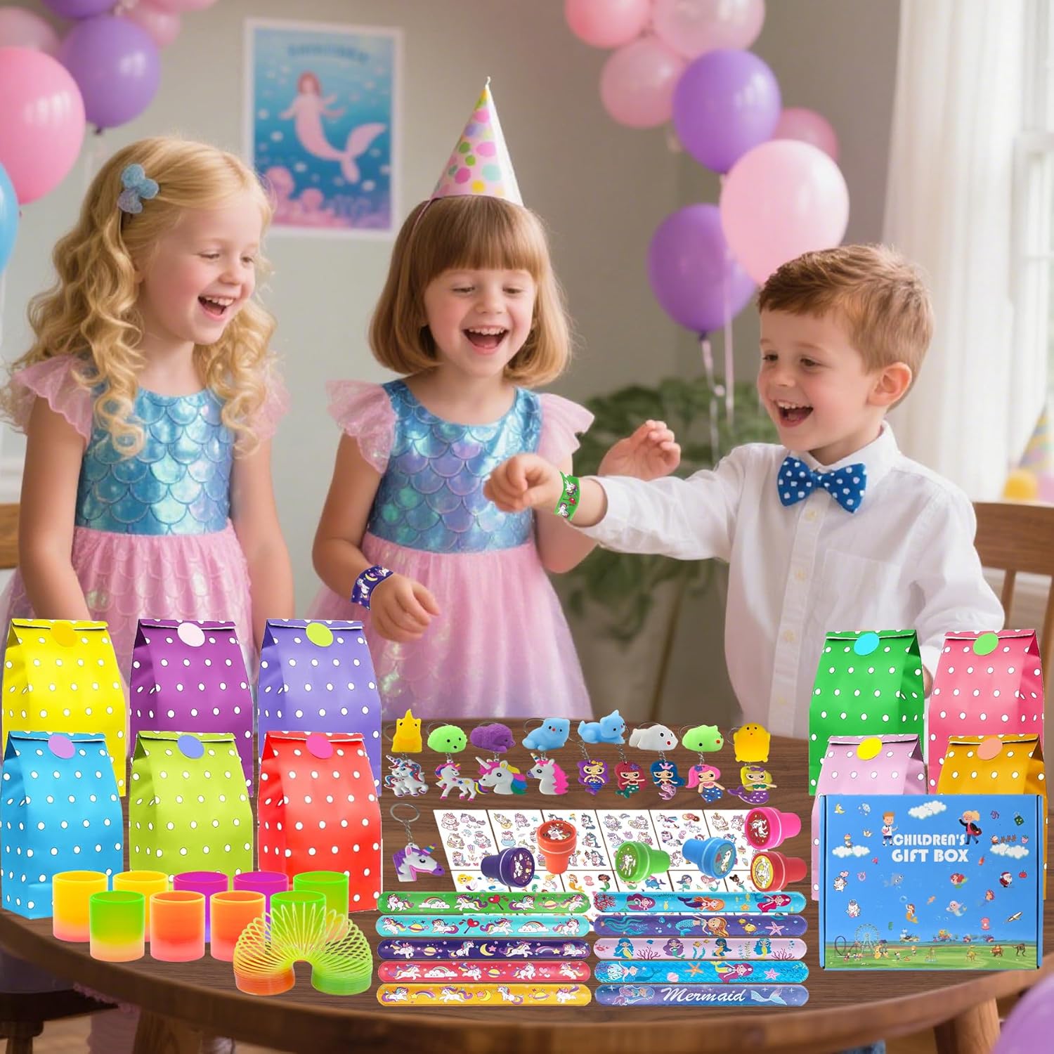 【Decorazione di compleanno con sirena di unicorno】FEMBW offre regali per feste con un tema di unicorno e sirena per i compleanni delle ragazze. Il set per bomboniere da 66 pezzi include 10 portachiavi, 10 giocattoli a spirale, 12 adesivi per tatuaggi che si illuminano al buio, 10 braccialetti a scatto, 10 sacchetti di carta, 6 francobolli, 8 animali di peluche e confezioni di cartoni animati. Questo è un fantastico regalo a sorpresa per 3 4 5 6 7 8 9 anni. 【Design carino e interessante】 Il design unico della sirena e dell'unicorno, i colori vivaci e i design vari attirano l'attenzione dei bambini. Con i peluche i bambini possono rilassare il loro nervosismo stringendoli. Interessanti giocattoli a molla si espandono e si contraggono per allenare i movimenti delle mani. 【Adesivi luminosi per tatuaggi】 Dopo l'irradiazione in un luogo luminoso o buio, gli adesivi per tatuaggi per bambini si illuminano, il che è molto popolare tra i bambini. Lo schema è vario e non si ripete. Ci sono anche francobolli per decorare articoli di cancelleria, quaderni, libri, ecc. 【Piccoli regali per bambini】Sacchetti di carta colorati per feste, puoi mettere i giocattoli nei sacchetti uno per uno e distribuirli ai bambini. Grazie al design opaco, i bambini possono scegliere le borse in modo casuale, aggiungendo più divertimento e sorpresa. 【Materiale di alta qualità】 I pacchetti per feste di unicorno sono realizzati in plastica di alta qualità, borsa di stoffa e materiale in gomma, bellissimo motivo, stampa chiara, nessun odore, bordi lisci e senza sbavature, perfetti per i bambini.