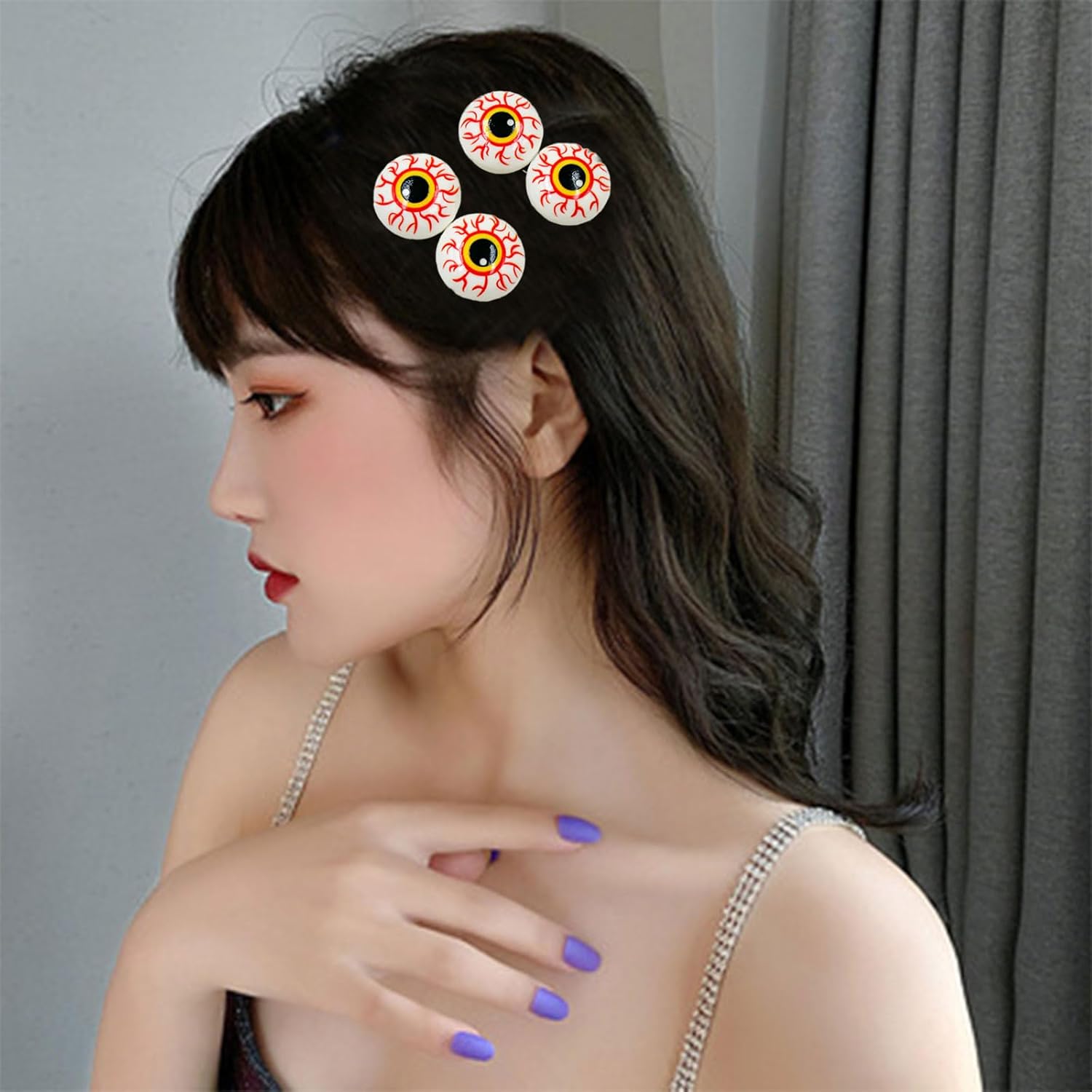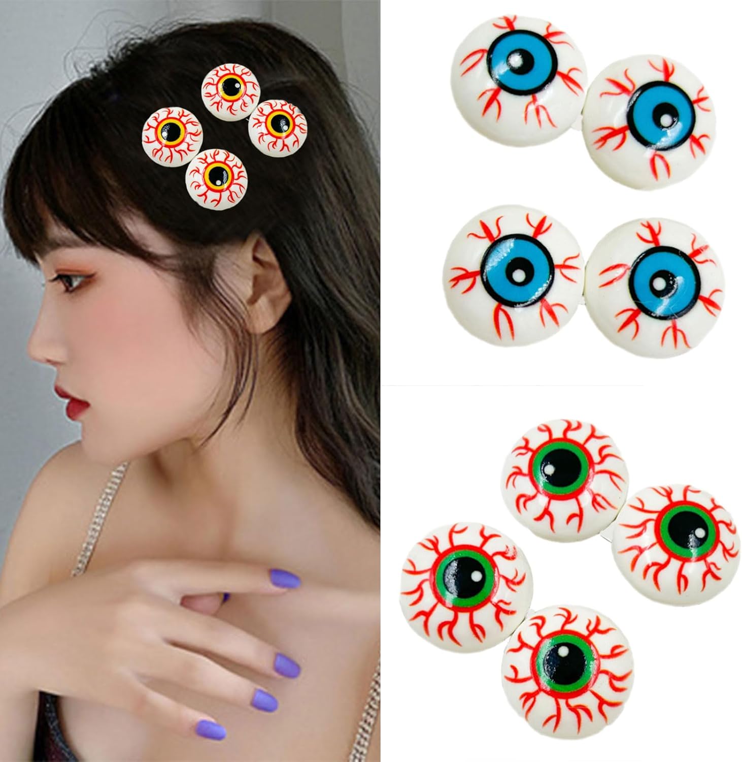 Migliora il tuo look di Halloween con questo fermaglio per capelli a forma di bulbo oculare, realizzato in resina leggera e lega per un accessorio pratico ma confortevole che aggiunge un tocco moderno ai costumi garantendo al contempo la vestibilità. Un design unico a bulbo oculare, questo fermaglio per capelli tiene saldamente vari tipi di capelli, uso prolungato durante eventi festivi. Per gli appassionati di costumi, cosplayer e famiglie alla ricerca di accessori sicuri ma taglienti, adatti per bambini dai 3 anni in su e adulti per mostrare stili audaci a feste o oggetti di scena fotografici. Distinguiti a carnevali di Halloween, matrimoni a tema horror o convegni con questo pezzo accattivante che completa cappelli da strega, abiti e ensemble punk senza sforzo. Design con bulbi oculari a tema Halloween, unici e accattivanti, leggeri e facili da trasportare, comodi da indossare, non scivolano facilmente