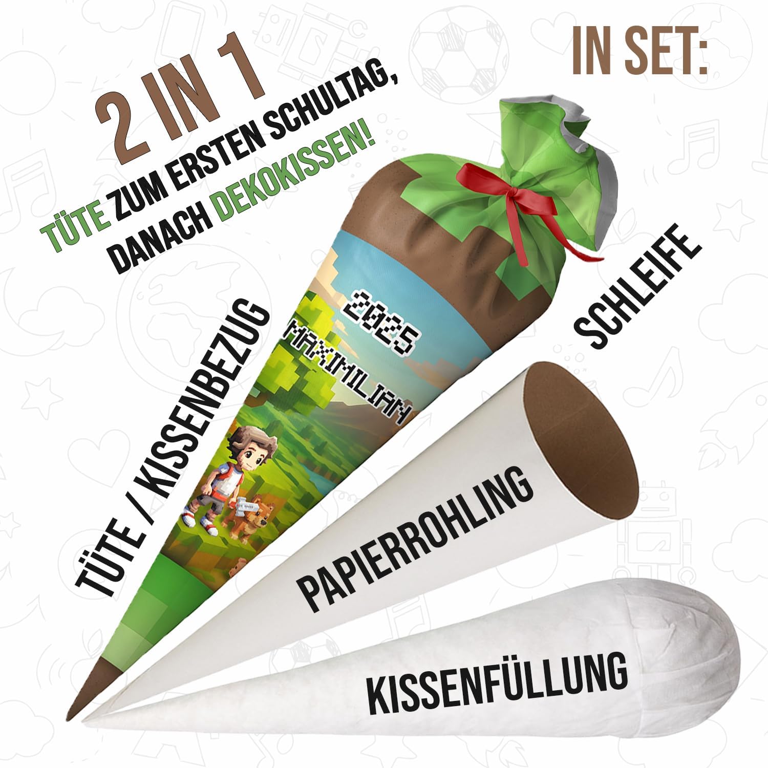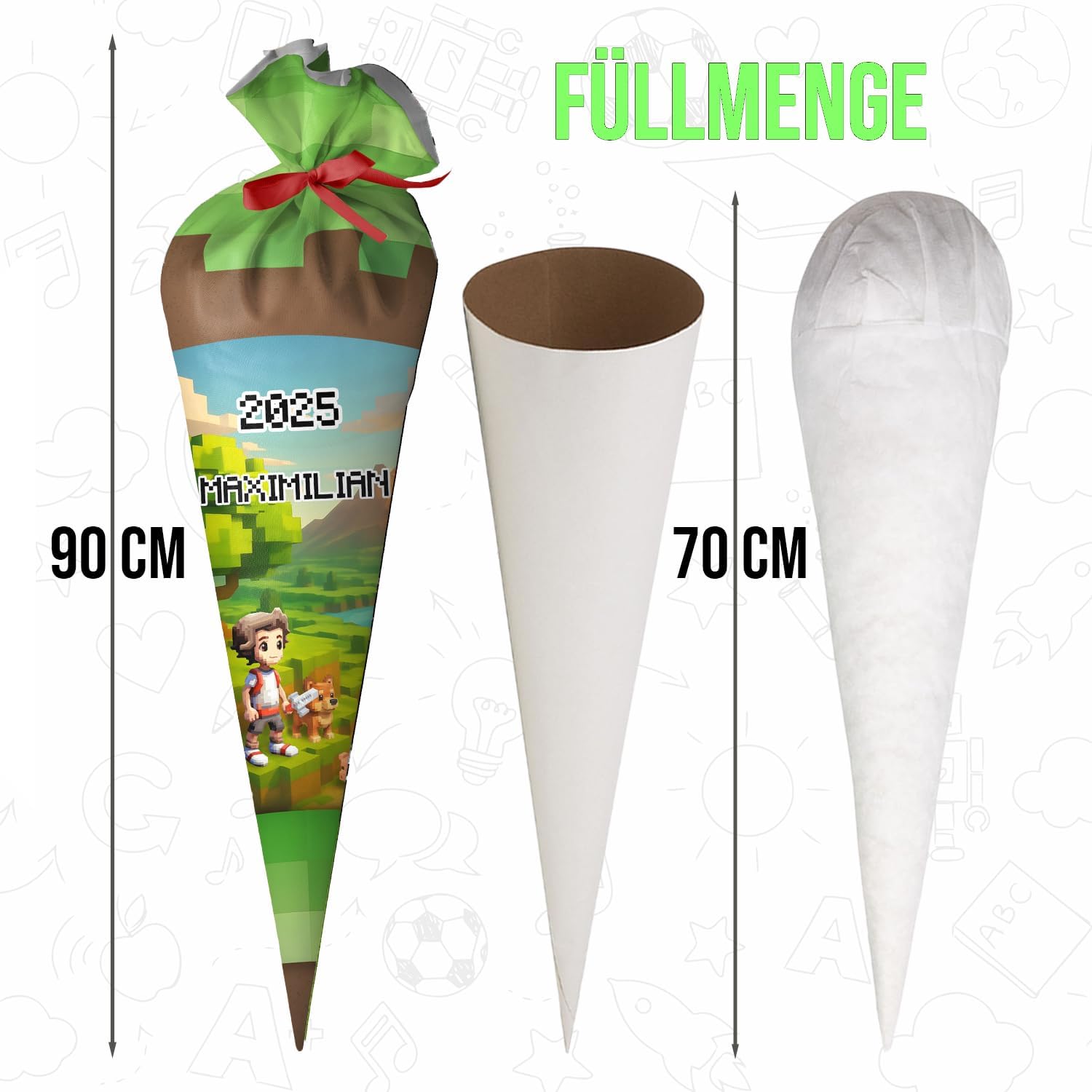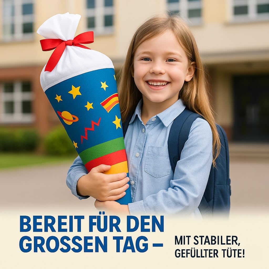 Il cono della scuola è realizzato in tessuto 100% poliestere. All'interno è presente un cartone tondo e un'imbottitura a sfera in fibra cava di poliestere removibile. Il tuo bambino potrà poi utilizzare la borsa come cuscino! Rimetti semplicemente le palline di fibra cava, fai un fiocco e il gioco è fatto. La borsa ha 70 cm da riempire (questa è anche la dimensione del cartoncino) + tessuto in alto che si può annodare con un fiocco. Il cinturino fa parte del kit. Il colore dell'arco verrà inviato a caso. Il sacchetto di caramelle è personalizzato con il nome del bambino. Basta fare clic su "Personalizza ora", inserire il nome e aggiungere al carrello! Nel nostro negozio troverai gli accessori scolastici adatti per l'inizio della scuola del tuo bambino, ad es. valigette, borse sportive e molto altro.