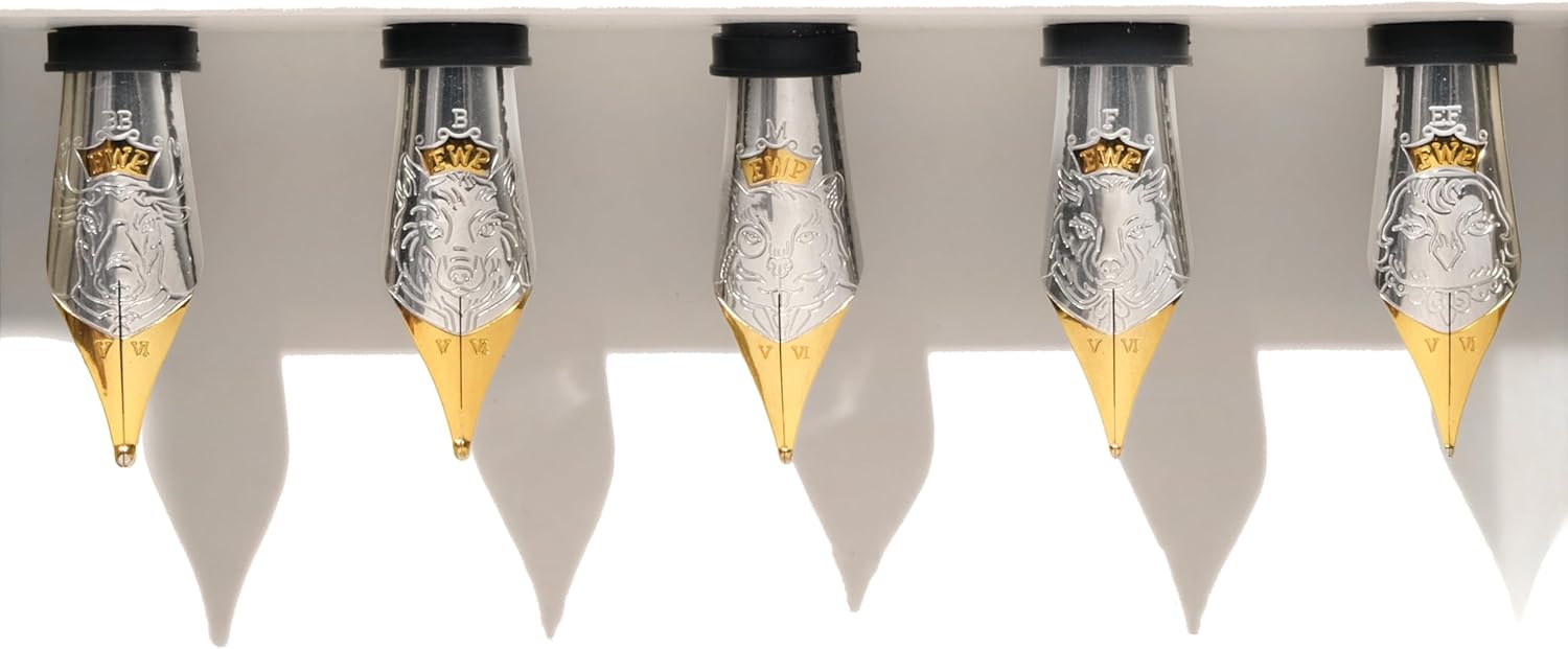 N. 6 pennini in acciaio bicolore rettificati personalizzati di dimensioni standard Sistema di pennini intercambiabili con alloggiamento in stile Jowo Disponibile in EF, F, M, B e BB Compatibile con tutti gli strumenti di scrittura Ferris Wheel Press che utilizzano il nostro pennino n. 6 di dimensioni standard