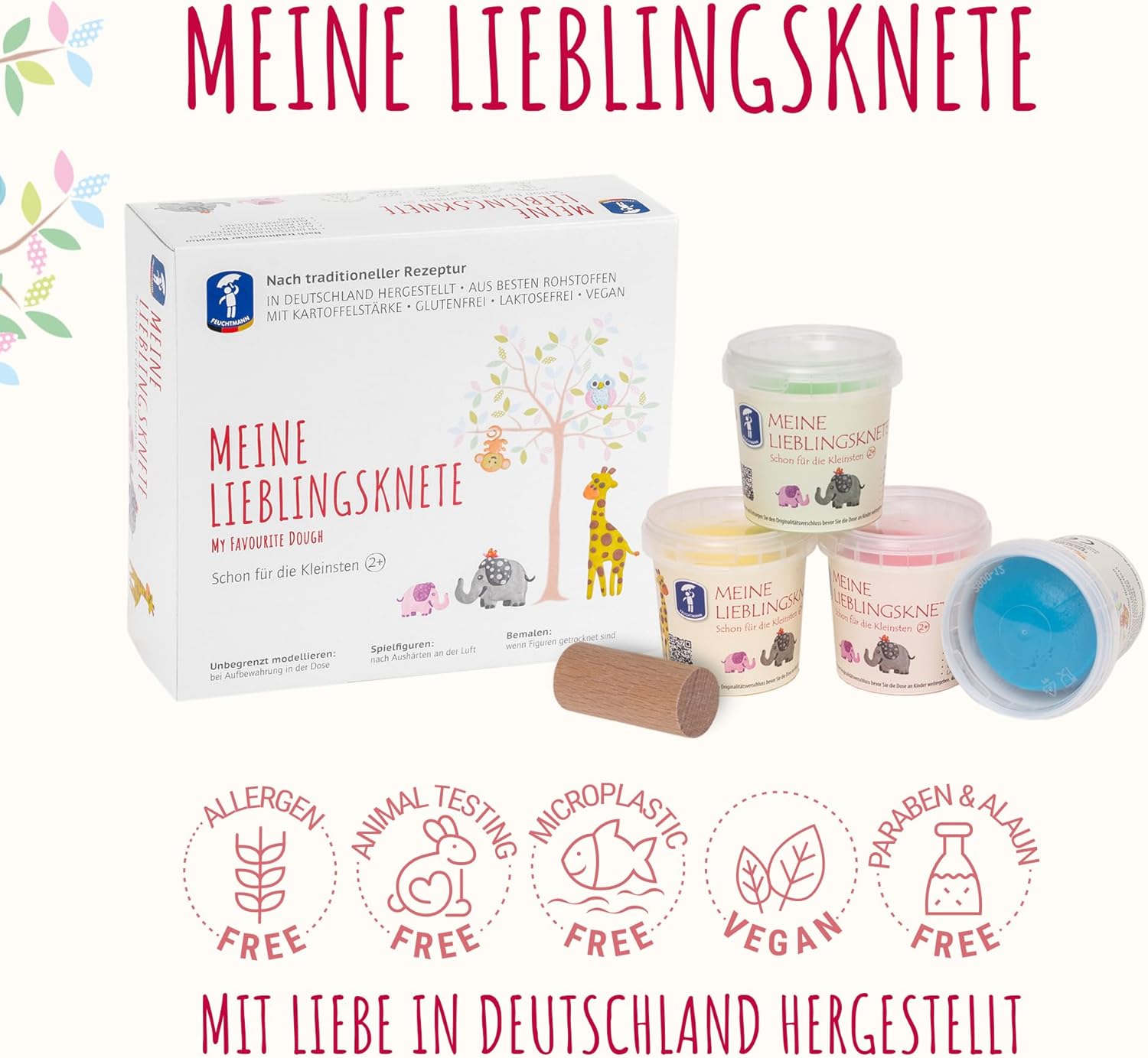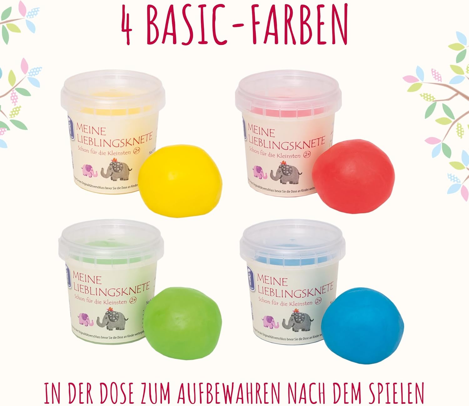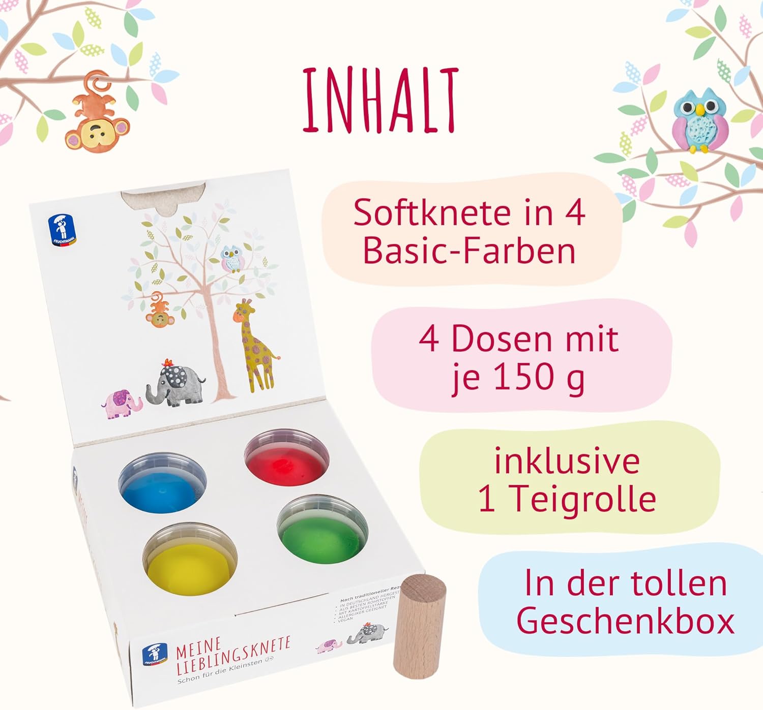 Pasta da modellare asciugante all'aria, dipinta e miscibile Contenuto: 4 scatole da ca. 150 g di pasta da modellare nei colori blu, rosso, verde e giallo e un mattarello in legno di faggio Qualità "Made in Germany", da materie prime sane come la fecola di patate Nota per chi soffre di allergie: senza glutine (senza farina), senza proteine, senza arachidi, senza lattosio, lavabile Allena le capacità motorie che affinano i sensi, diventa creativo - Adatto a bambini dai 2 anni Sesso target: unisex