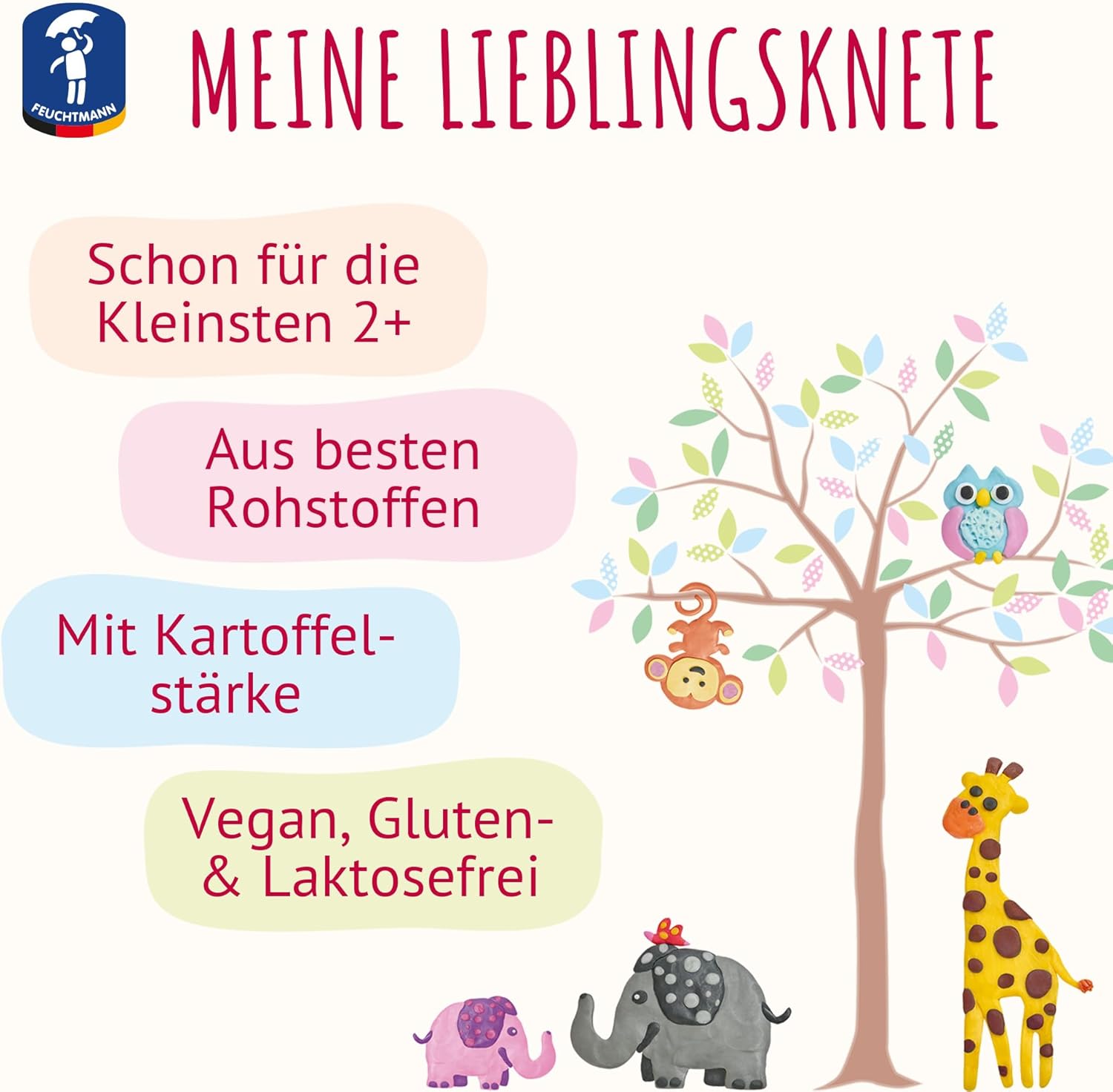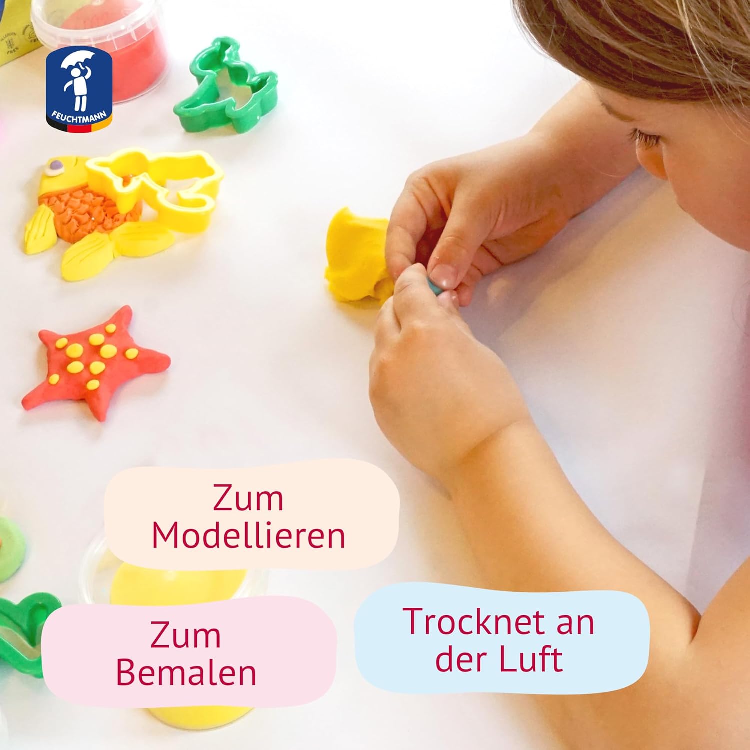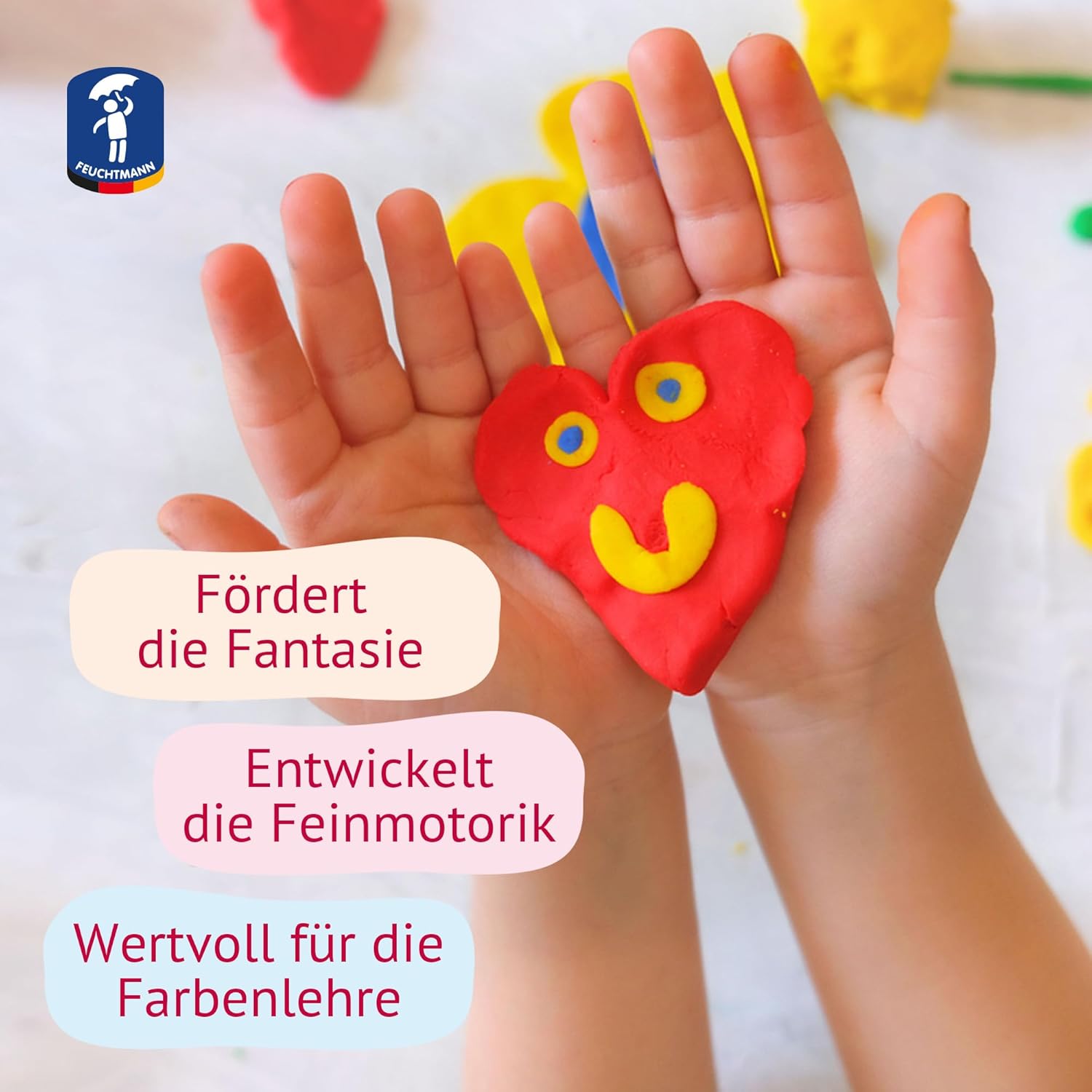Pasta da modellare asciugante all'aria, dipinta e miscibile Contenuto: 4 scatole da ca. 150 g di pasta da modellare nei colori blu, rosso, verde e giallo e un mattarello in legno di faggio Qualità "Made in Germany", da materie prime sane come la fecola di patate Nota per chi soffre di allergie: senza glutine (senza farina), senza proteine, senza arachidi, senza lattosio, lavabile Allena le capacità motorie che affinano i sensi, diventa creativo - Adatto a bambini dai 2 anni Sesso target: unisex