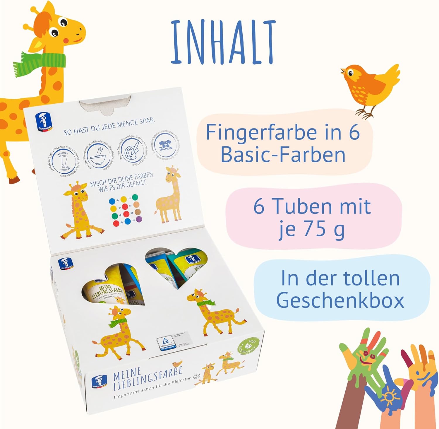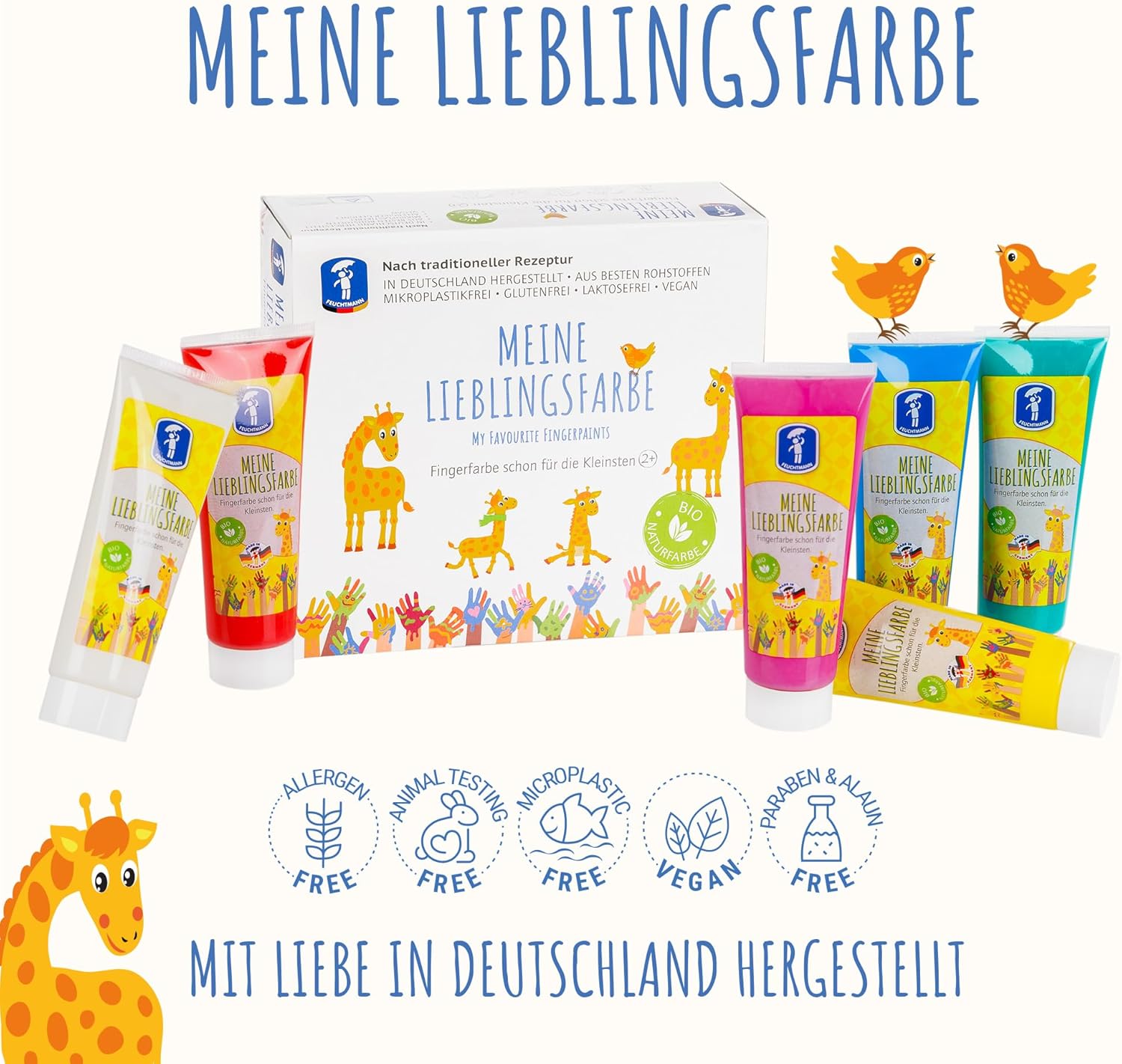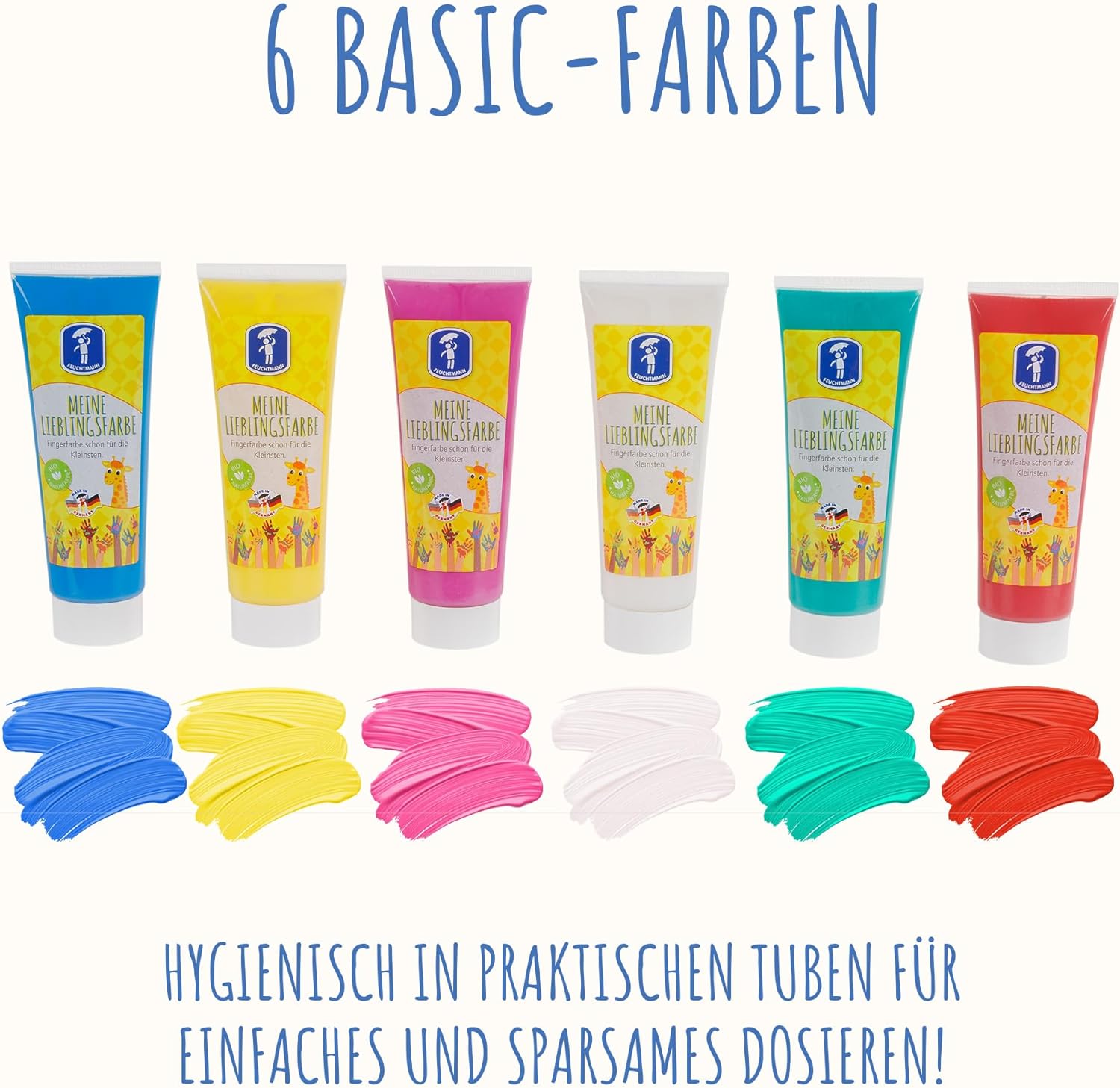 Meine Lieblingsfarbe - Fingermalfarben Contenuto: 6 tubetti da 75 g ciascuno nei colori blu, bianco, giallo, verde, rosa e rosso Qualità Made in Germany Si tratta di colori naturali biologici Per bambini dai 2 anni in su