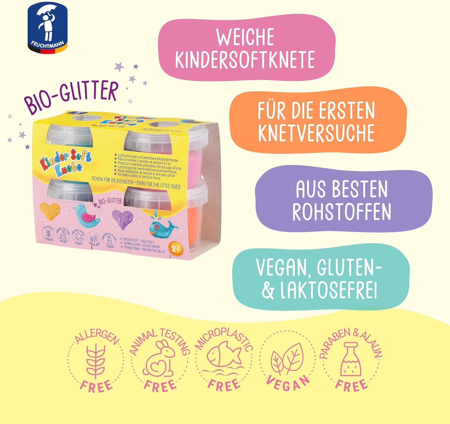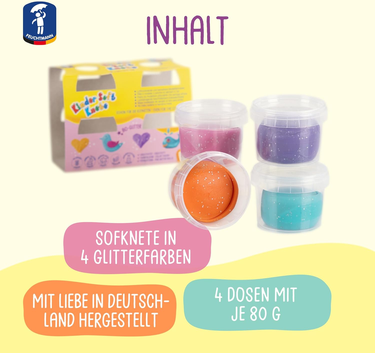 KNETSPASS: pasta morbida Feuchtmann per bambini, 4 x 80 g, argilla modellabile ad asciugatura all'aria e verniciabile, per bambini dai 2 anni in su. Morbido: argilla meravigliosamente morbida che entusiasma soprattutto i bambini. La pasta morbida Feuchtmann per bambini è perfetta per il fai da te, per i primi tentativi di impastare ed è ideale per la pressa per impastare. Creativo: già i bambini a partire dai 2 anni possono sviluppare le loro capacità motorie e creatività con i bambini con la pasta morbida. Può essere modellato, miscelato, asciugato all'aria e persino dipinto! Sicuro: solo con ingredienti biologici di alta qualità come l'amido di patate. La sicurezza incontra qualità, sostenibilità e trasparenza. Conforme ai più elevati requisiti ed è testato da laboratori indipendenti! Innocuo: vegano, senza glutine, senza lattosio, senza proteine e senza arachidi. Pertanto assolutamente innocuo anche per chi soffre di allergie. Prodotto in Germania con le migliori materie prime