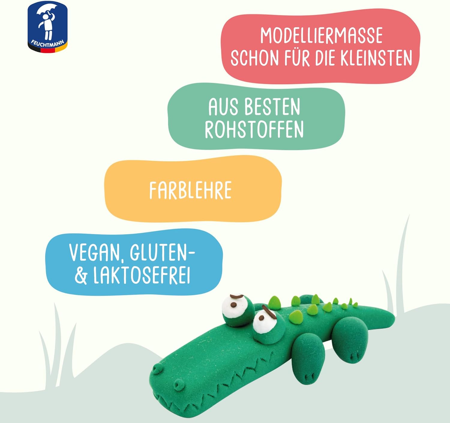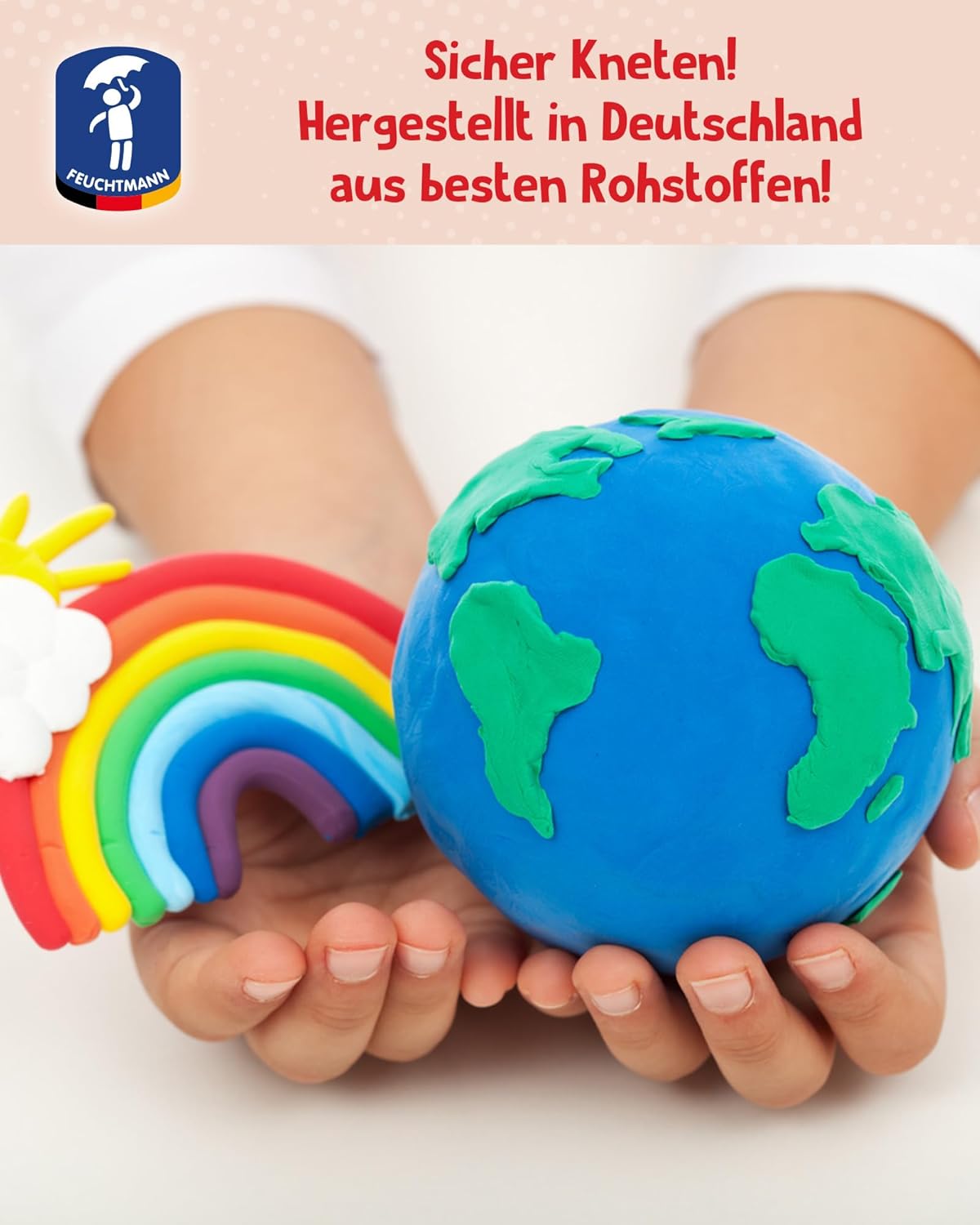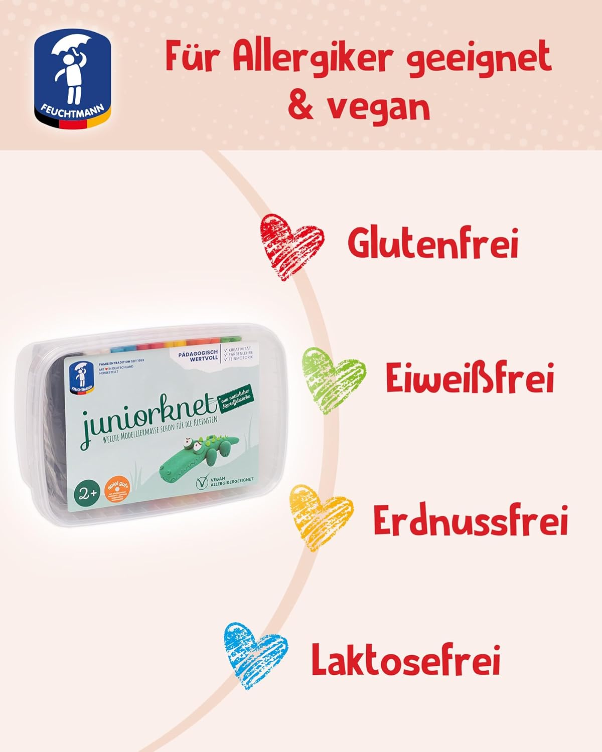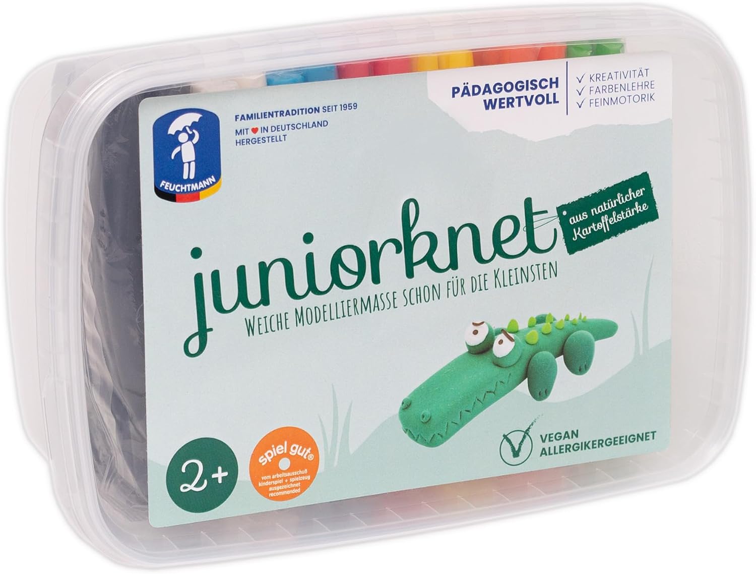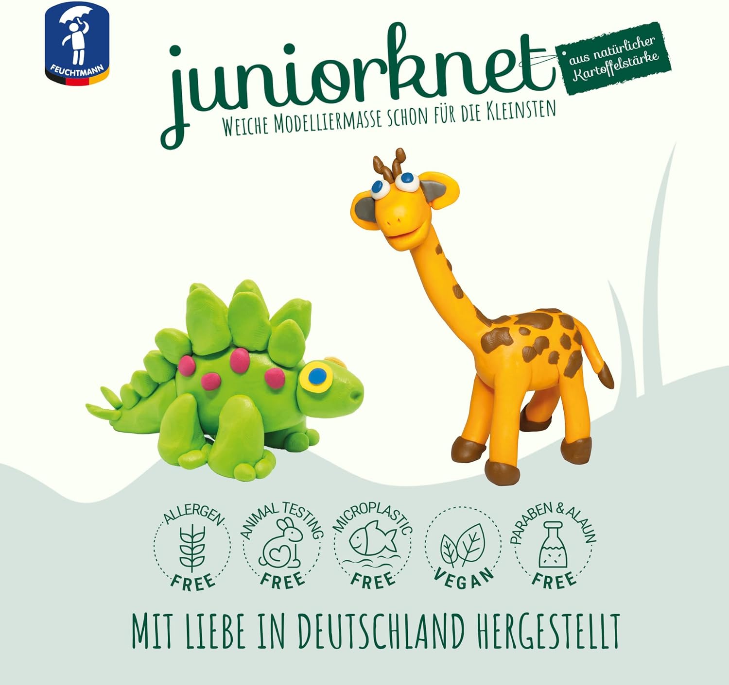 COLORATO: impasta in modo particolarmente colorato con i bastoncini non essiccanti di Feuchtmann JUNiORKNET! I colori intensi si rivolgono a tutte le età e sono un successo all'asilo o a casa. MORBIDO: La pasta da modellare JUNIORKNET è particolarmente facile da lavorare grazie all'amido che contiene. Basta impastare, stendere, ritagliare e modellare: le figure che crei appaiono quasi tridimensionali! Nessuna seccatura, ciò significa che potrai goderti la pasta da modellare JUNIORKNET per molto tempo! SICURO: Feuchtmann JUNiORKNET è realizzato con le migliori materie prime in Germania e soddisfa i più alti standard di qualità. PULITO: JUNiORKNET non è solo divertente e facile da lavorare, ma è anche facile da rimuovere da tessuti, tappeti, ecc.! SICURO: l'impasto vegano JUNIORKNET è privo di glutine, proteine, arachidi e lattosio! Quindi assolutamente sicuro per chi soffre di allergie! Adatto dai 2 anni in su.