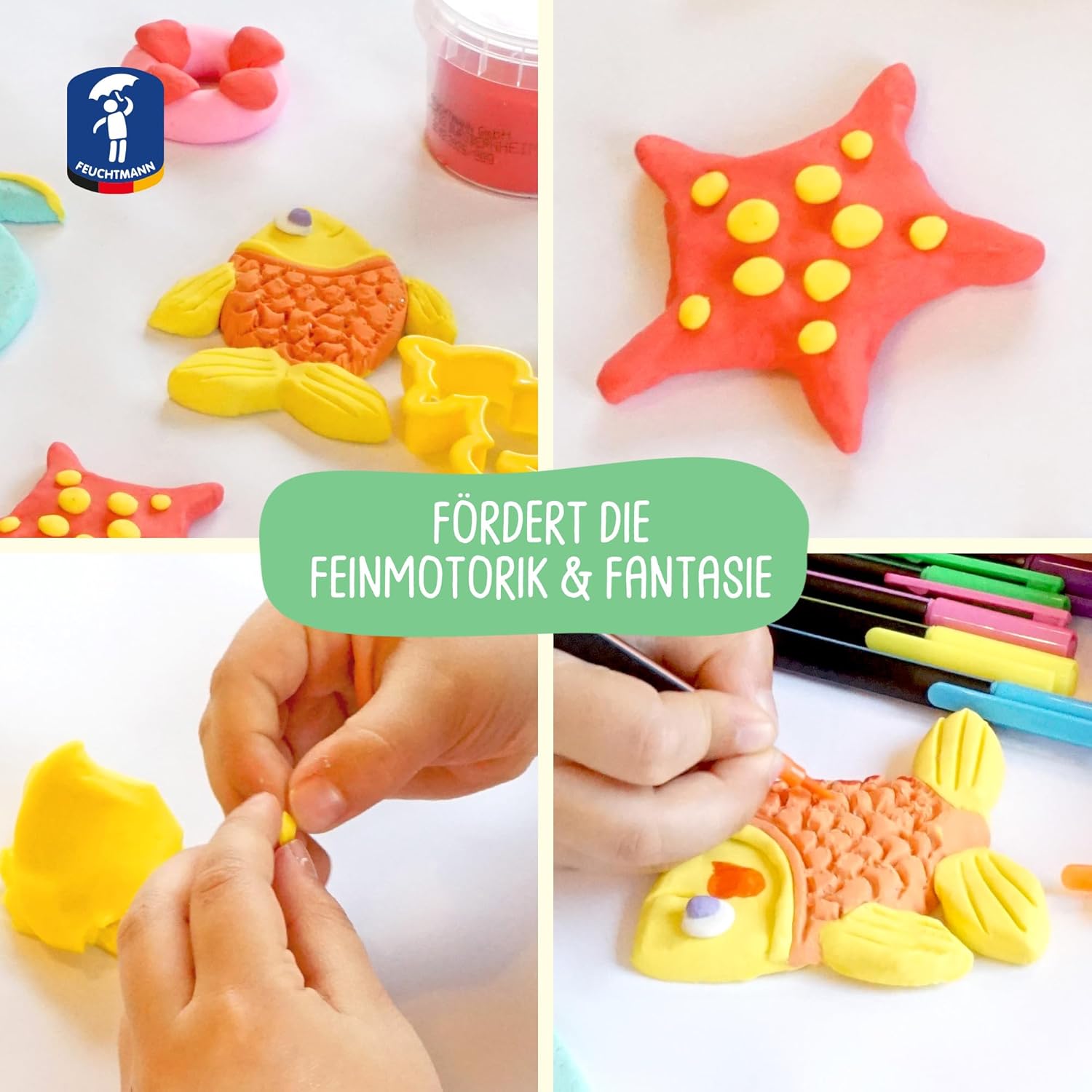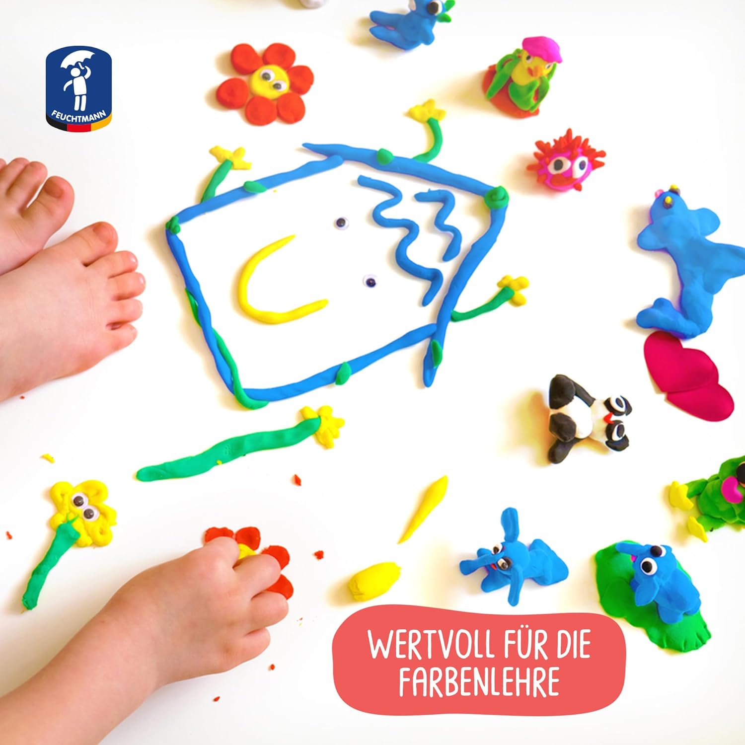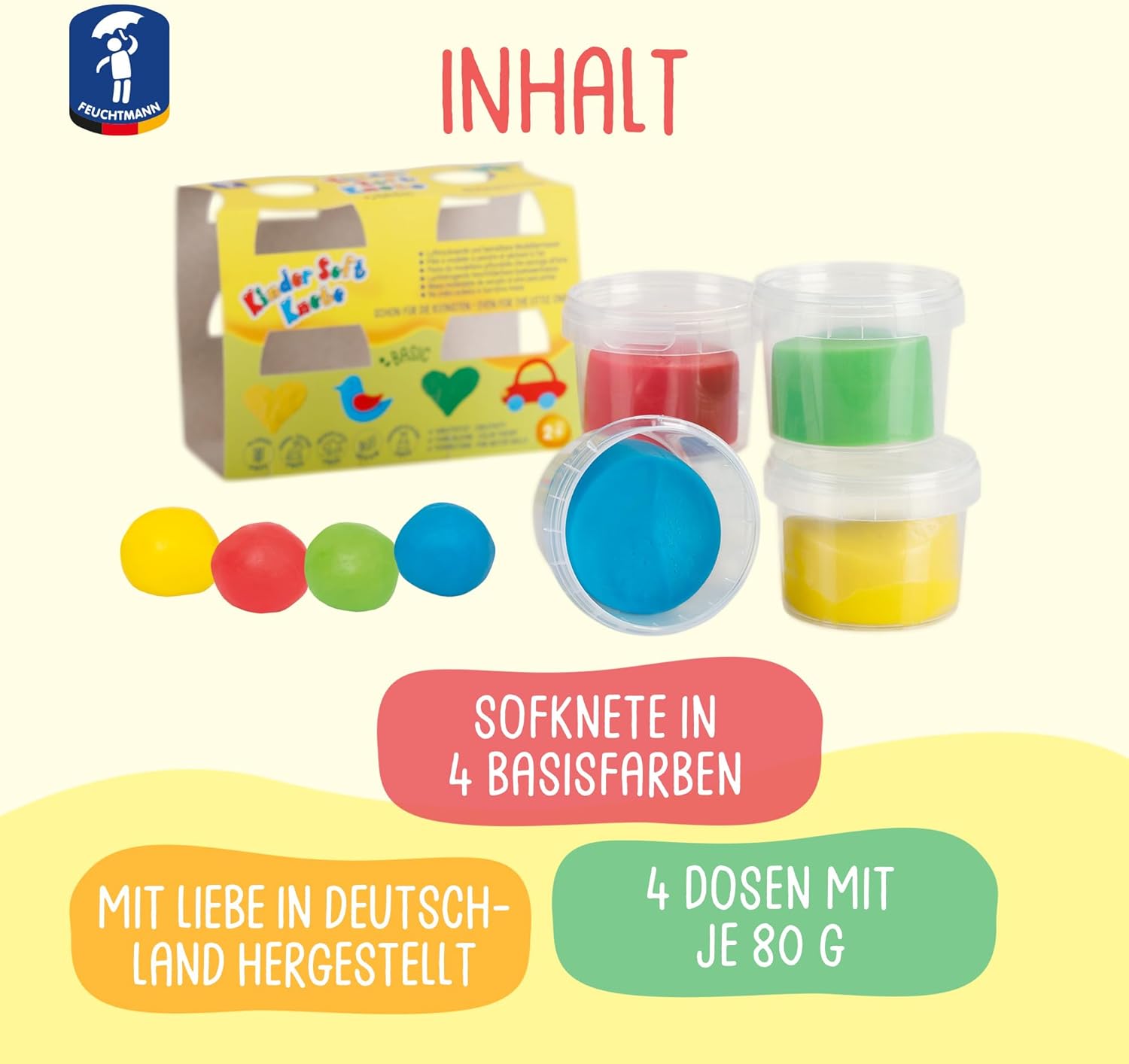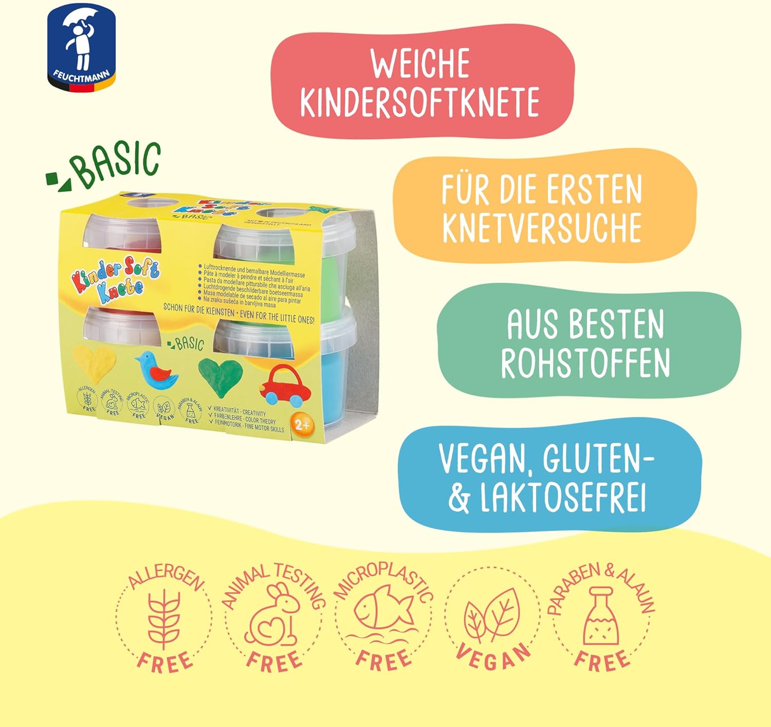 DIVERTIMENTO IMPASTO: Feuchtmann KIDS SOFT KNETE 4 x 80 g di pasta da modellare essiccabile all'aria e verniciabile per bambini dai 2 anni in su. SOFT: pasta da modellare meravigliosamente morbida, particolarmente apprezzata dai bambini piccoli. Il Feuchtmann KINDER SOFT KNETE è perfetto per l'artigianato, per i primi tentativi di impastare ed è ideale per l'impastatrice. CREATIVO: i bambini dai 2 anni in su possono sviluppare le loro capacità motorie e creatività con KINDER SOFT KNETE. Può essere scolpito, miscelato, asciugato all'aria e persino dipinto! SICURO: solo con ingredienti biologici di alta qualità come la fecola di patate! La sicurezza incontra qualità, sostenibilità e trasparenza. Soddisfa i requisiti più elevati ed è testato da laboratori indipendenti! SICURO: vegano, senza glutine, senza lattosio, senza proteine e senza arachidi! Quindi assolutamente sicuro per chi soffre di allergie! Prodotto in Germania con le migliori materie prime!