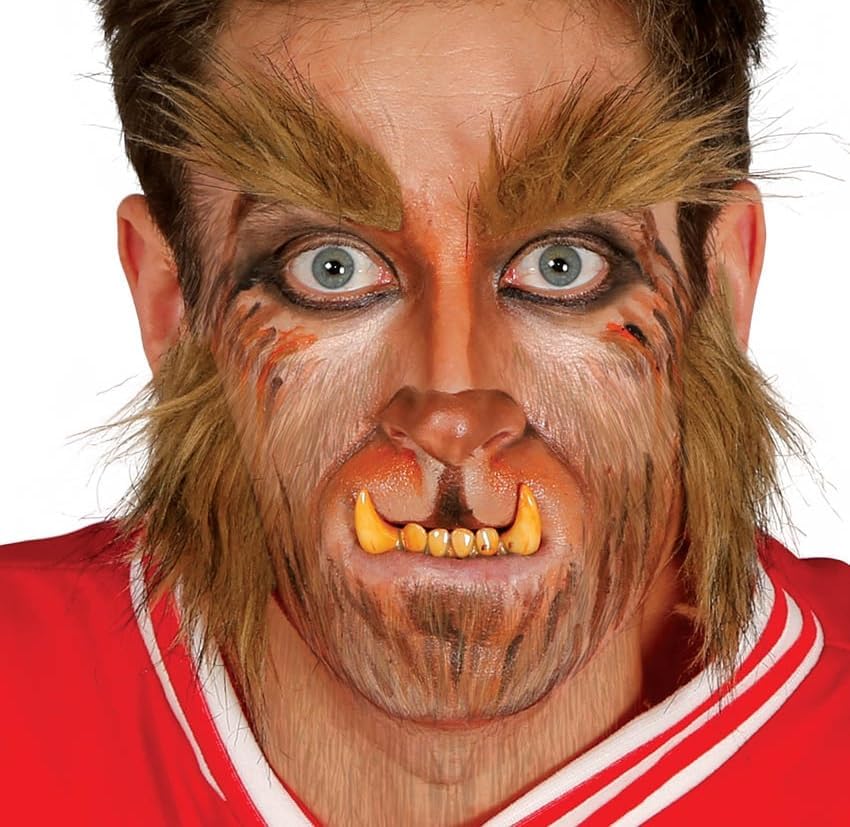 Patillas y cejas para disfraz de hombre lobo. Tienen un aspecto muy logrado en la imitación a pelo. Es un pelo con varias tonalidades que da aspecto real. Lo compré pensando en un niño y lo veo algo grande. Se puede aprovechar igualmente, pero me da la sensación que le tapa demasiado la cara. Viene con una pequeña tira, como de pegamento, que no se si será suficiente para adherir bien a la piel. Ideal para Halloween, aunque aún lo tenemos sin probar. Edito: Después de probarlo en Halloween, le sientan buen en la cara del niño. No le tapan demasiado y son muy originales. Lo que sí, es que la cinta es muy difícil de quitar. Si no lo haces bien, le arrancas el celo. Tiene una cinta muy pequeña y le pusimos más de doble cara. Aún y así, una demo se despegó.