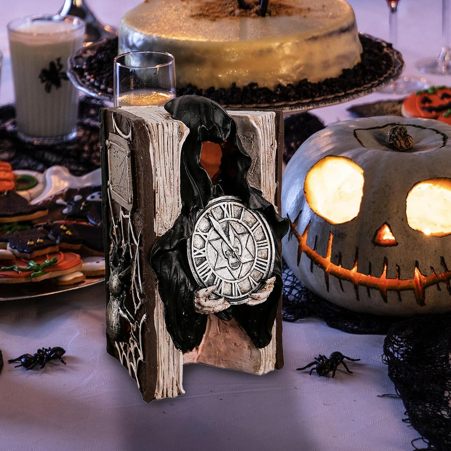 Atmosfera misteriosa: sviluppa un accattivante effetto luminoso al buio utilizzando la luce LED fantasma, che trasforma qualsiasi ambiente in uno scenario misteriosamente attraente e crea un'atmosfera incomparabile. Ispirazione creativa: affascinante figura macabra come elemento decorativo. Idea regalo perfetta per gli amanti delle tradizioni natalizie spettrali. Elegante oggetto da collezione per sofisticate decorazioni di Halloween. Atmosfera inquietante: questo elemento decorativo di Halloween in resina combina un libro dei fantasmi con una statua di teschio realistica. Il libro luminoso crea un'atmosfera mistica ed è ideale per decorazioni autunnali stranamente belle in soggiorni o giardini. Ampia gamma di usi: la figura completa le decorazioni delle feste a tema e funge da attraente decorazione gotica. Può essere utilizzato come oggetto da collezione su una libreria o come supporto stagionale per una casa stregata. Costruzione stabile: questa replica dettagliata di un libro antico sotto forma di scultura scheletrica è realizzata in durevole ecoresina di qualità museale: un oggetto da collezione durevole e resistente al colore, nonché un oggetto decorativo per presentazioni stagionali o per tutto l'anno.