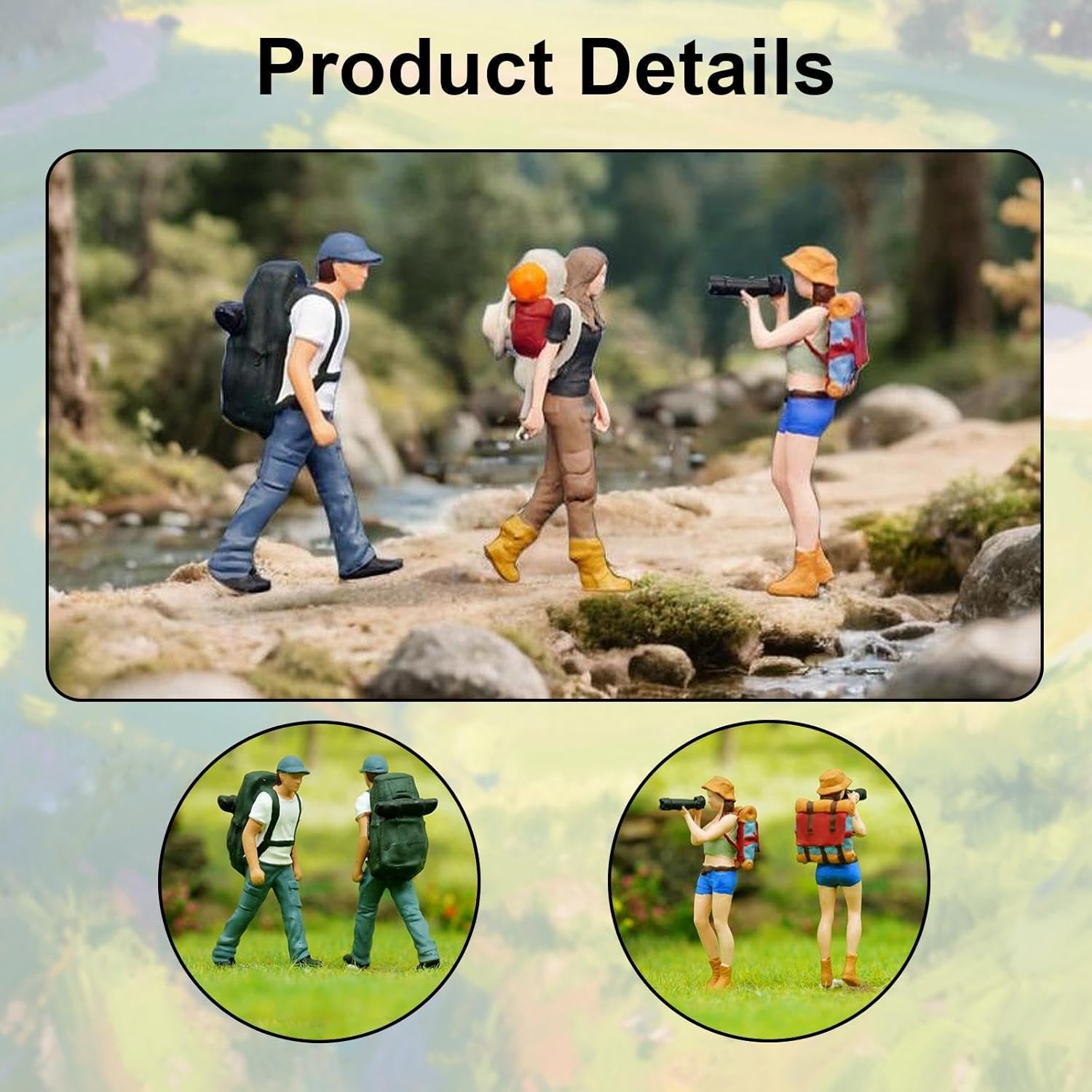 Realismo in scala 1:64: figure dettagliate in miniatura di persone escursionistiche creano autentiche scene di avventura all'aperto per paesaggi modello e display diorami Struttura in resina resistente: realizzate in resina robusta con dettagli raffinati, queste figure dipinte resistono alla rottura per un uso duraturo in vari contesti Applicazione versatile: adatto per modelli architettonici, accessori per case delle bambole, layout di treni, display desktop e composizione di scene fotografiche Varie posizioni e generi: include diversi tipi di figure con diverse pose da trekking con personaggi maschili e femminili per creare diverse scene Selezione della confezione opzionale: scegli tra set di 3 o 4 figure in miniatura per soddisfare le tue esigenze specifiche del progetto e le esigenze della popolazione delle scene