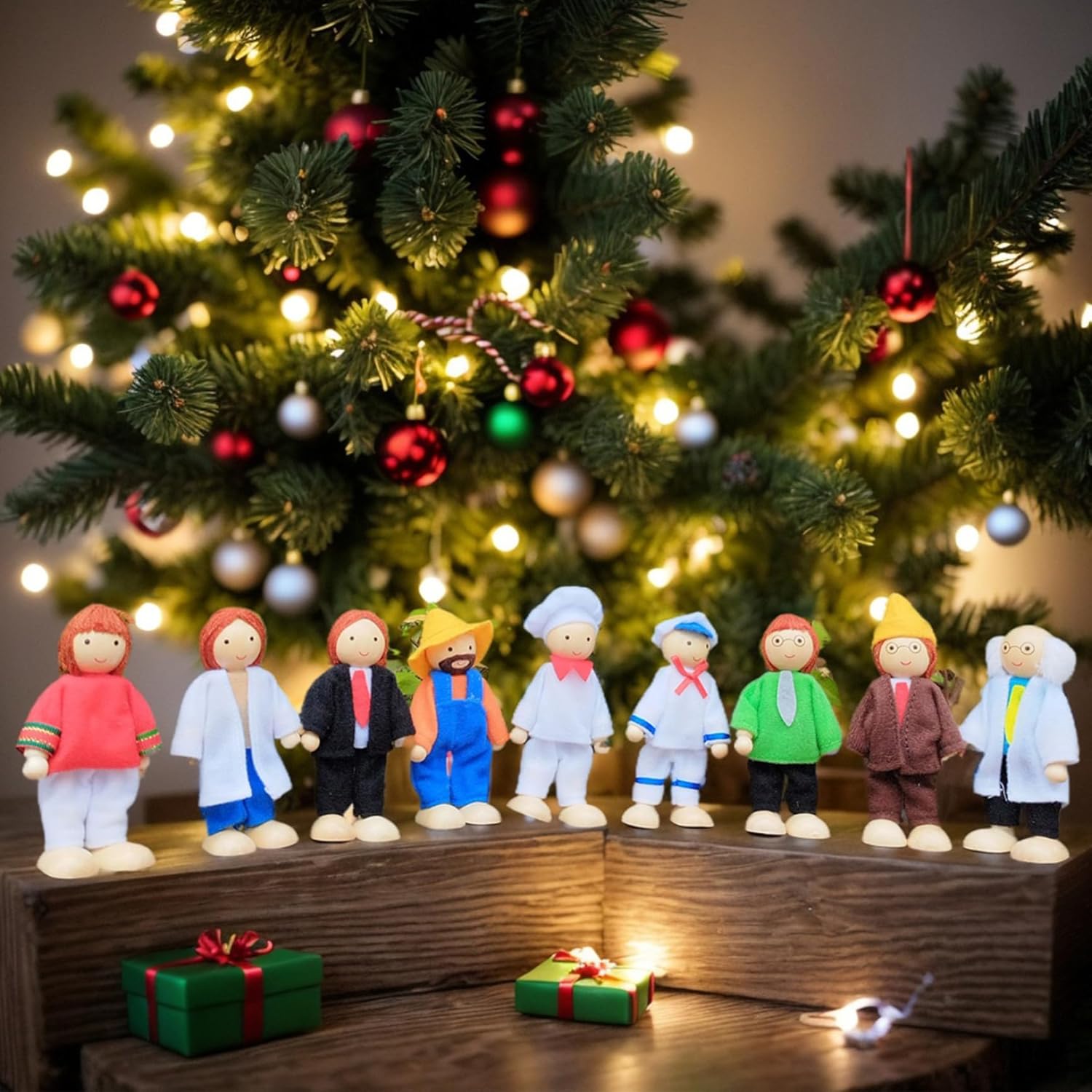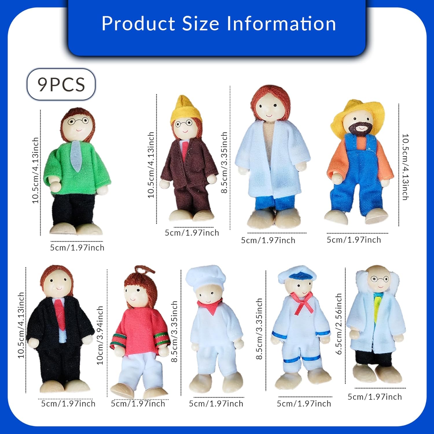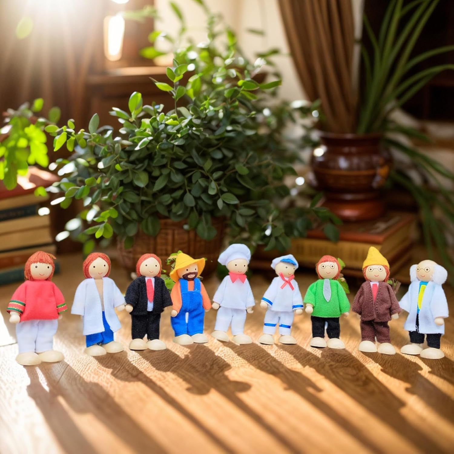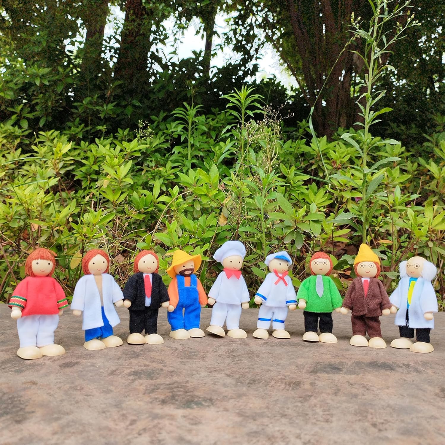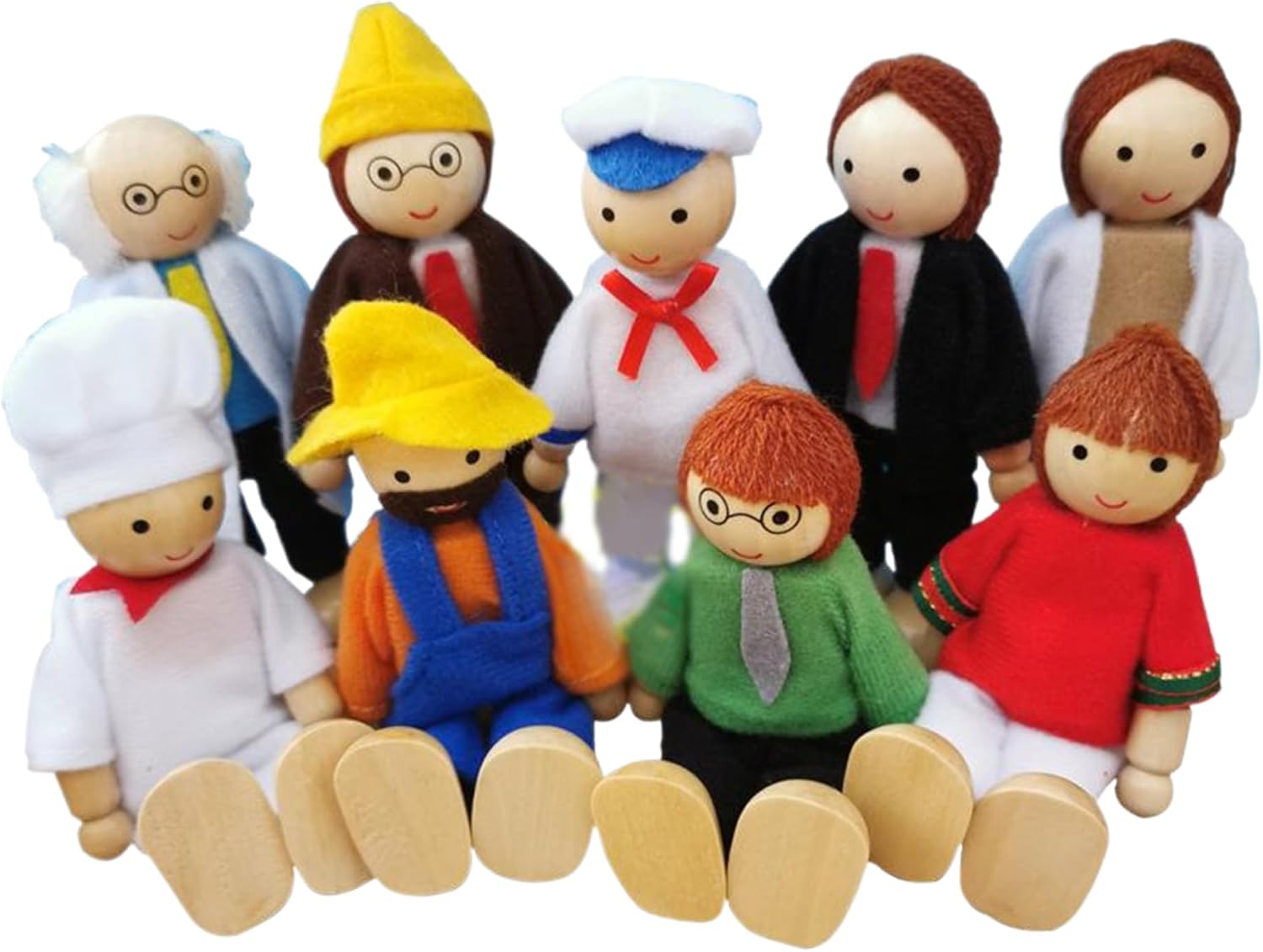 Tempo di gioco educativo: questo giocattolo versatile incoraggia lo sviluppo completo del linguaggio, dell'immaginazione e delle abilità sociali, rendendolo un prezioso strumento educativo che ispira la creatività e migliora la cognizione sociale. Figure snodabili: ogni figura è dotata di mani e piedi mobili, consentendo ai bambini di creare pose dinamiche come seduti, in piedi o piegati, aggiungendo una funzionalità interattiva alle loro avventure di gioco. Set di personaggi diversificato: il set comprende 9 affascinanti personaggi, da uno chef a uno scienziato, che rappresentano varie professioni, consentendo ai bambini di esplorare diverse scene professionali e arricchire la narrazione della loro casa delle bambole. Artigianato superiore: realizzate in legno di lunga durata con bordi lisci e vernici atossiche, queste figure di case delle bambole in legno danno priorità alla sicurezza e alla durata, garantendo ore di gioco fantasioso per i tuoi piccoli. Estetica adorabile: con i loro dolci sorrisi e i morbidi vestiti, queste figure in legno sono progettate per affascinare i giovani cuori, rendendole l'aggiunta perfetta a qualsiasi stanza dei giochi o casa delle bambole.
