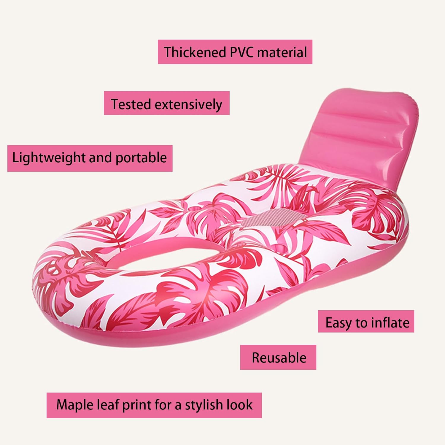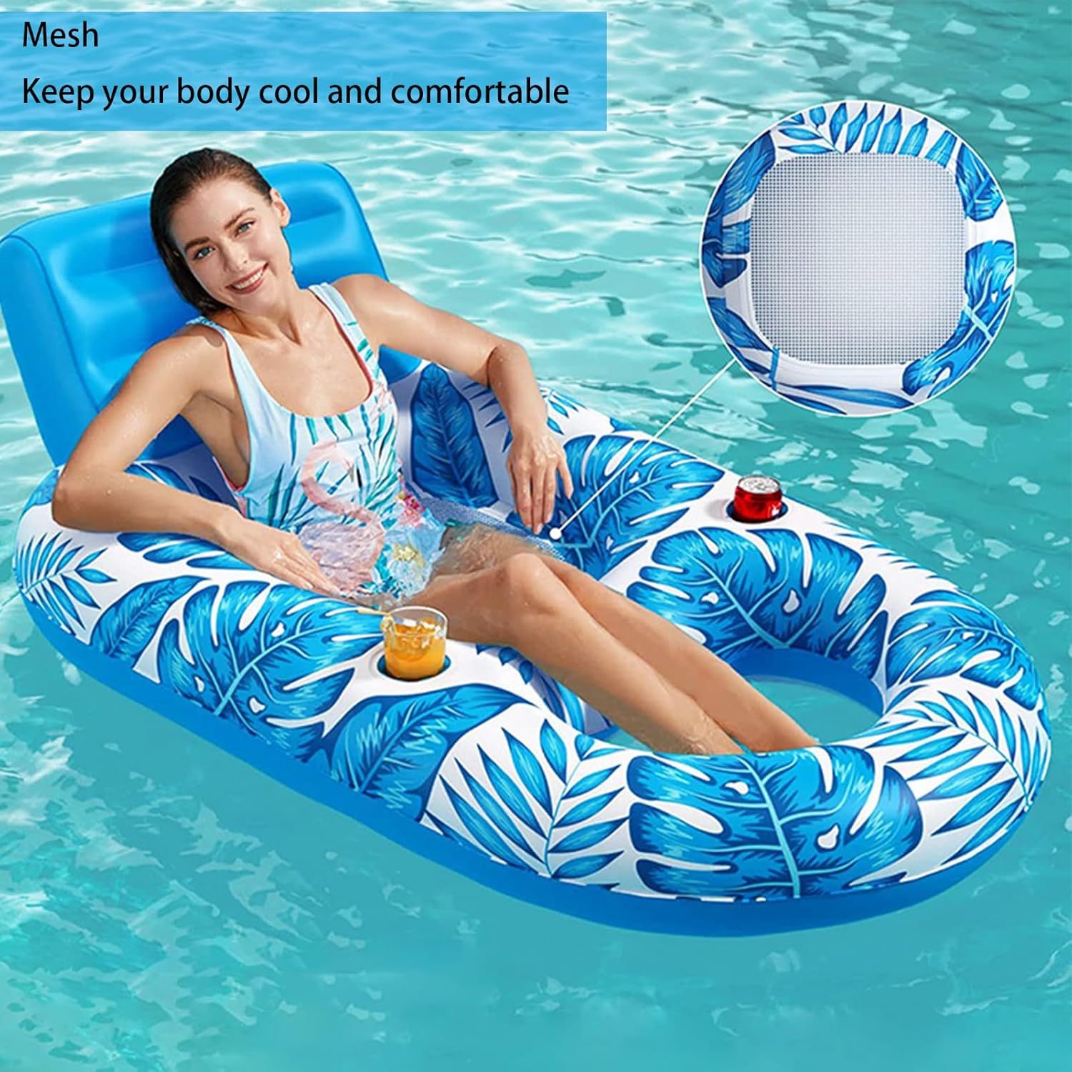 【Materiale PVC ispessito】 Questa zattera gonfiabile è realizzata in PVC ispessito con una stampa a foglia d'acero per un aspetto elegante ed elegante. Il materiale è stato ampiamente testato per la durata e la resistenza all'usura. 【Design a maglie】 Il sedile a maglie di questo lettino per l'acqua è traspirante e non pungente, permettendoti di posizionare i piedi e le gambe direttamente nell'acqua per un tuffo rinfrescante. 【Design premuroso】 Questa zattera per adulti presenta porta a coppa su entrambi i lati per bevande fredde, permettendoti di placare la tua sete mentre galleggia e rilassarti sull'acqua. 【Sedile a forma di U】 Il sedile a forma di U di questa zattera offre una sensazione comoda, sicura e accogliente. 【Facile da gonfiare】 La dimensione compatta di questa zattera quando sgonfiato consente di essere ripiegato per un uso ripetuto. È facile gonfiarsi e portatile.