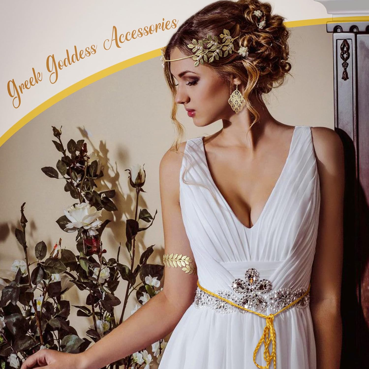 Finrezio Set di Accessori per Costume da dea Greca per Donna Fascia per Capelli a Forma di Foglia Bracciale per Bracciali Pendenti per Matrimonio Toga Party
