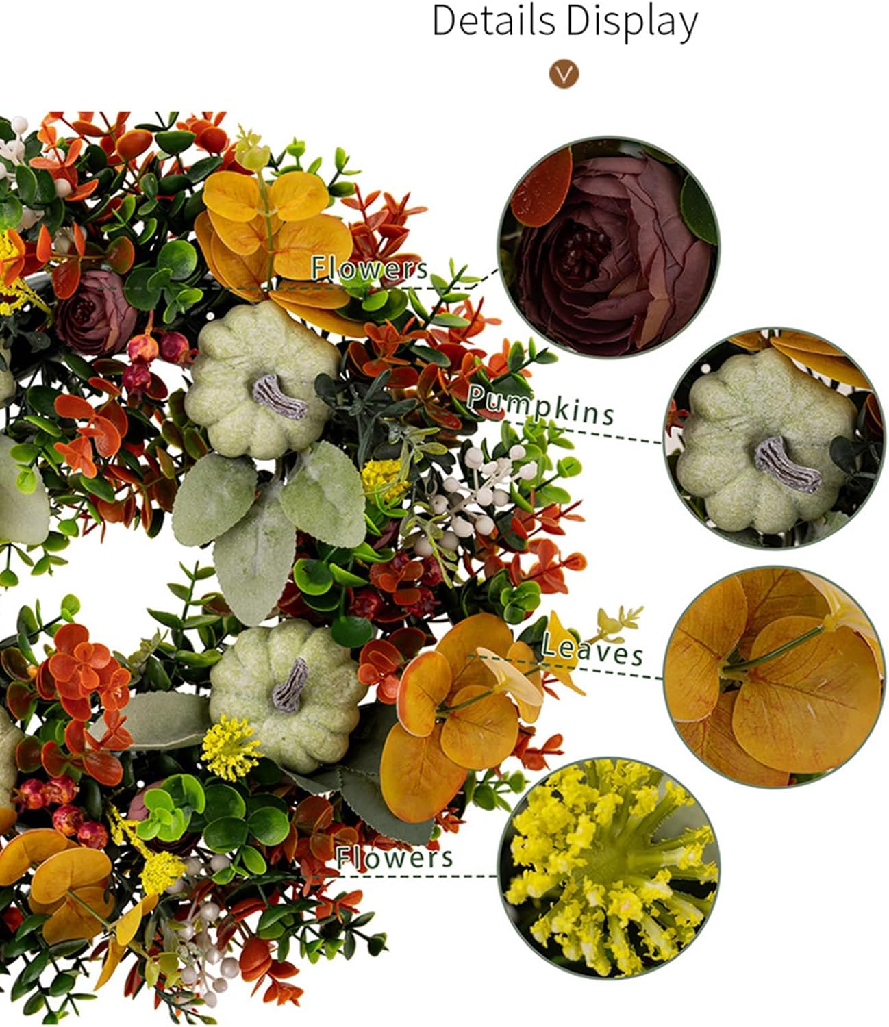 Realizzata con materiali plastomeri, questa robusta ghirlanda presenta un ricco mix di fiori e accenti di zucca, meticolosamente progettata per mantenere il suo colore brillante e l'aspetto realistico anno dopo anno Questa ghirlanda non solo funge da bel punto in qualsiasi spazio, ma è anche un regalo elegante per amici e amanti che cercano di migliorare le loro decorazioni stagionali Appendi questo delicato accessorio alla porta d'ingresso, alla parete o alla finestra per sollevare istantaneamente l'arredamento della casa e accogliere gli ospiti alle tue riunioni e feste del Ringraziamento Adatta a coloro che apprezzano la tradizione del festival, questa ghirlanda è una necessità per le famiglie che cercano di creare un ambiente caldo e invitante durante le vacanze Abbraccia l'autunno con la nostra corona autunnale, una meravigliosa combinazione di fiori selvatici artificiali e zucca che cattura le essenze della festa del raccolto, adatta per la celebrazione del Ringraziamento