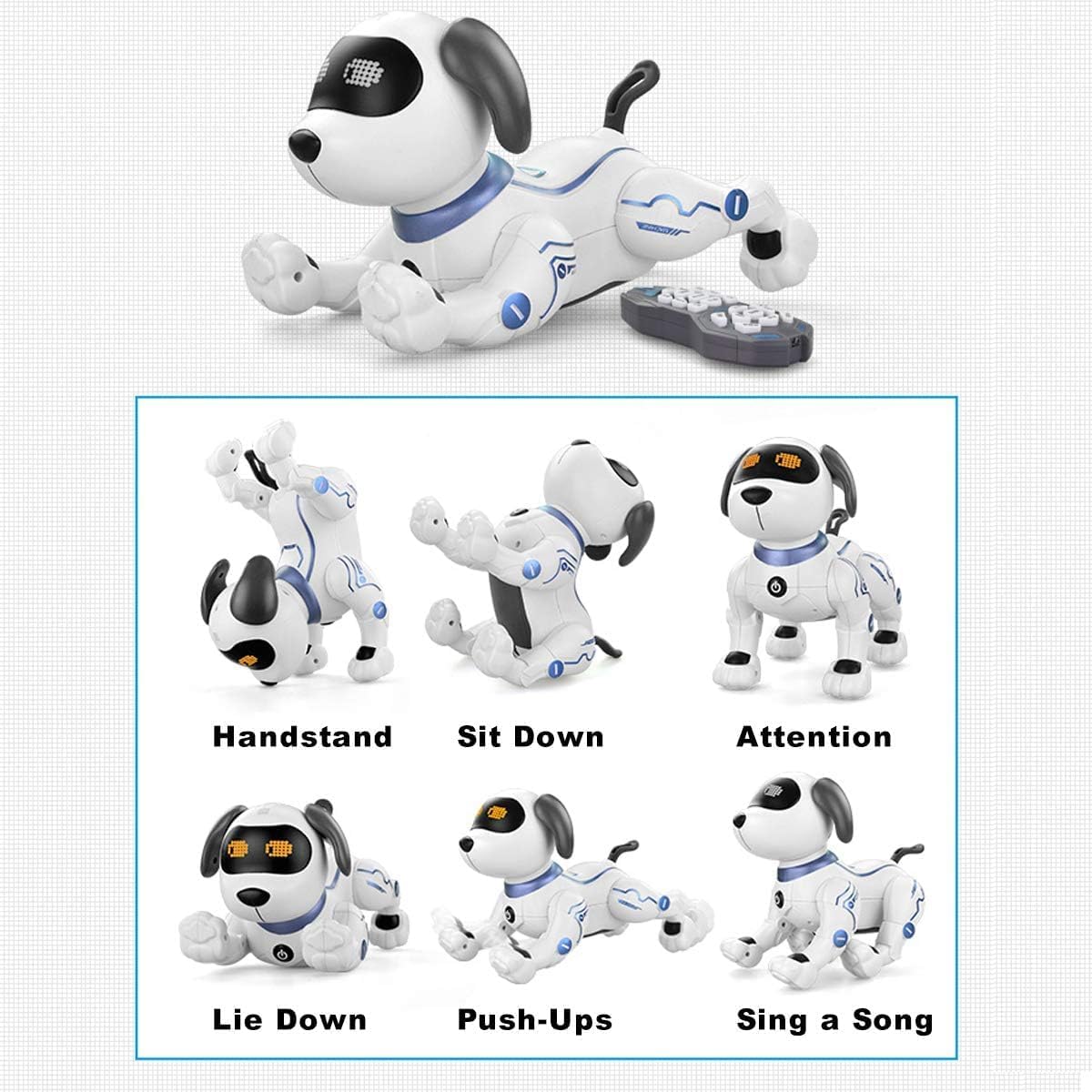 Materiale di sicurezza per cani robotici: questo cane giocattolo è realizzato in plastica ABS di alta qualità, è sicuro per i bambini e non contiene componenti tossici. I vostri bambini possono giocare con esso senza preoccuparsi, materiale malsano Telecomando Robotic Dog: controllo vocale (7 comandi), andare avanti, demo, stand della mano, flessioni, sedersi, accovacciarsi, rabbia. Tutte le azioni possono essere controllate dal controller. È un ottimo regalo per cani telecomandato per bambini Giocattolo per bambini in modalità programmabile: impostiamo diverse azioni per questo cane giocattolo, è possibile impostare diverse combinazioni di azioni tramite il telecomando 【Animale domestico elettronico ballante e cantante】Questo cane robot può ballare con la musica, può eseguire diverse azioni al ritmo della musica per rendere felici i vostri bambini. Quando i tuoi figli sono soli, questo cane giocherà meglio con loro Giocattolo interattivo per cani: abbiamo installato un sensore sotto il mento del cane. Se tocchi il mento, il cane eseguirà le azioni appropriate per mostrare la sua gioia, rabbia o timidezza