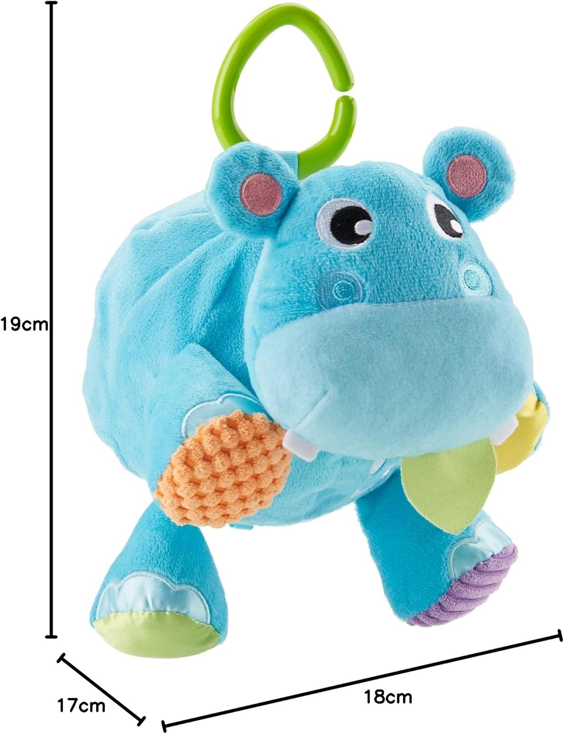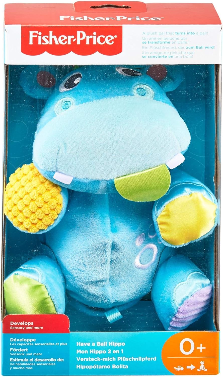 2 giochi in 1 L'Ippo-Palla Soffice con tessuti morbidi e satinati Rivolta l'ippopotamo per trasformarlo in una palla Gancio rimovibile per appendere e portare il gioco in giro Suoni divertenti