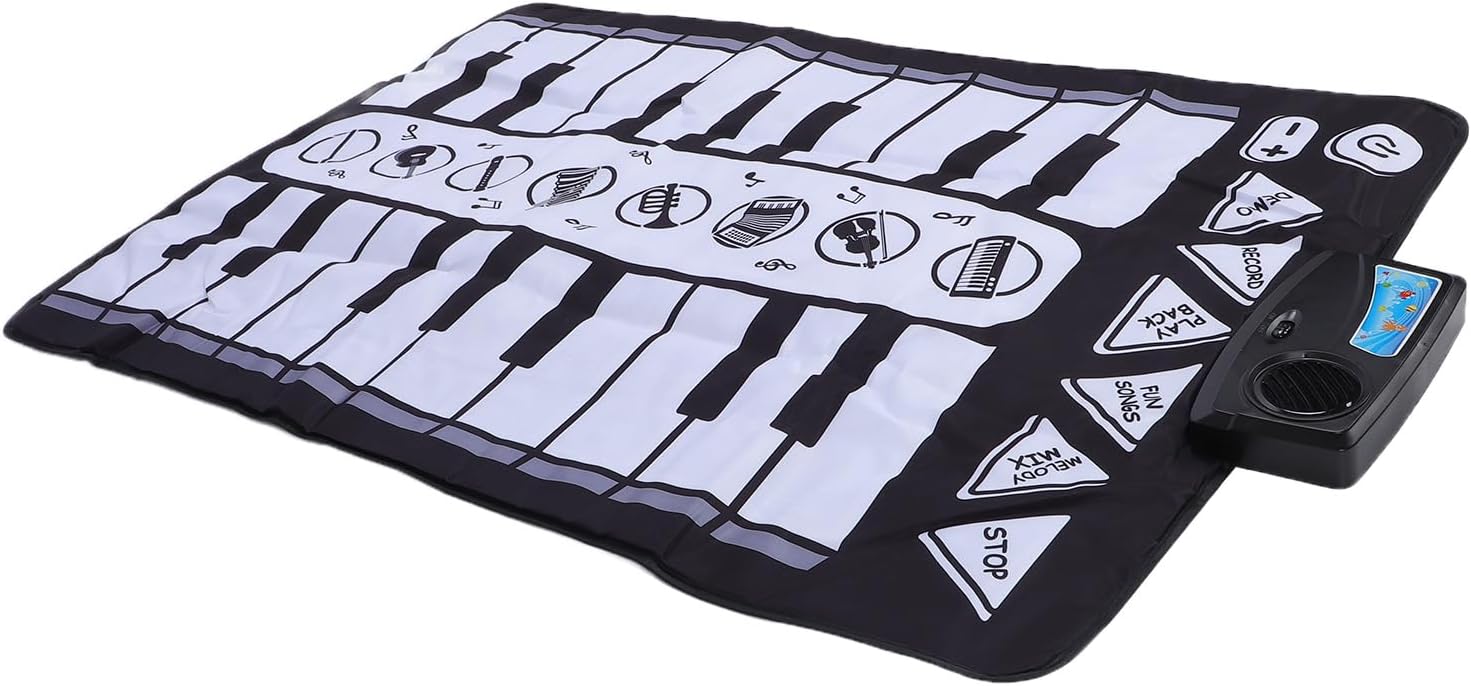 Pianoforte giocattolo con 4 modi di suonare, note musicali realistiche, versi di anatra e mucca, canzoni e frasi per l'apprendimento precoce Premi gli 8 tasti numerati per attivare luci, canzoni e suoni Fai scorrere il cursore per passare da una modalità all'altra Maniglia facile da trasportare per portare il giocattolo con te ovunque Per bambini da 6 mesi a 3 anni