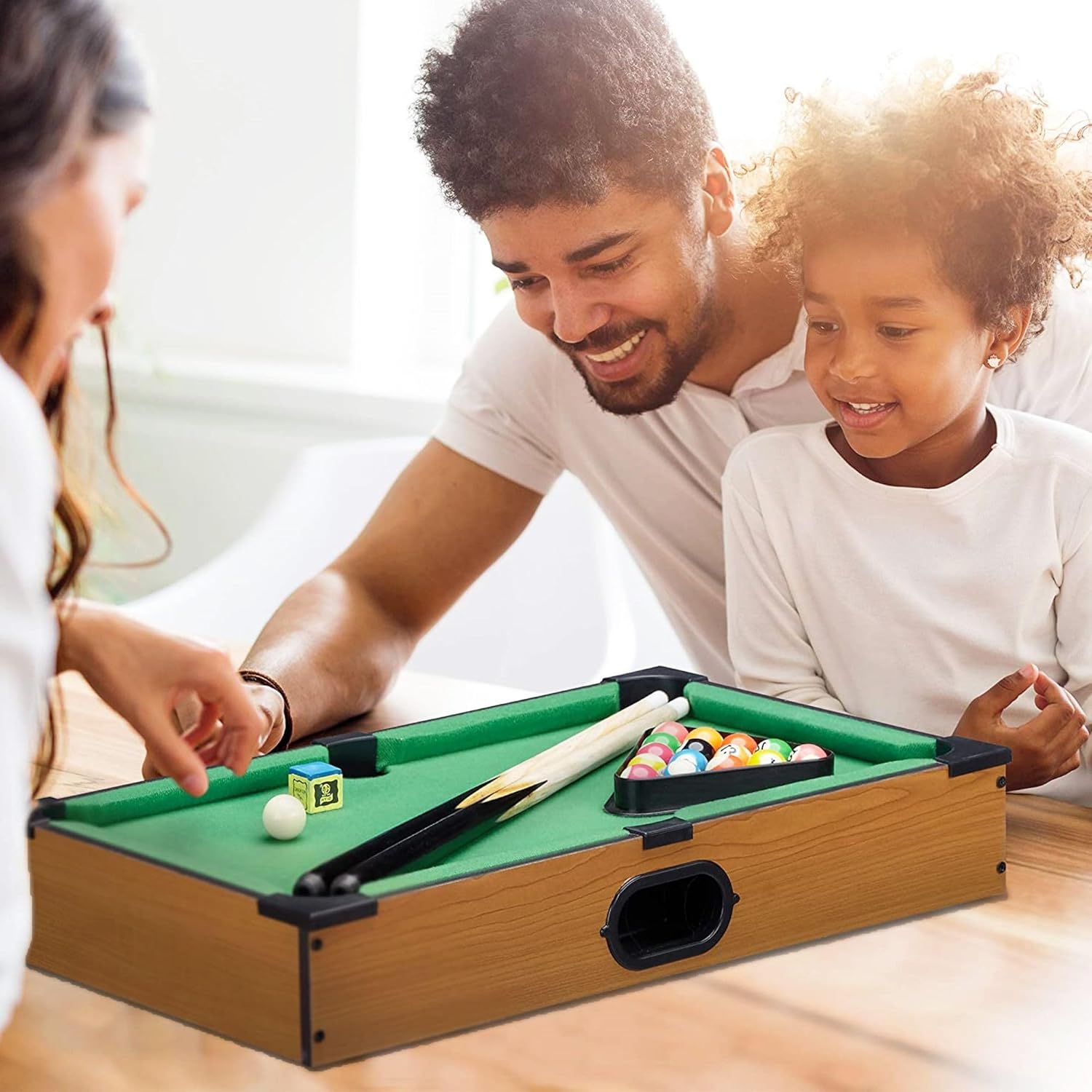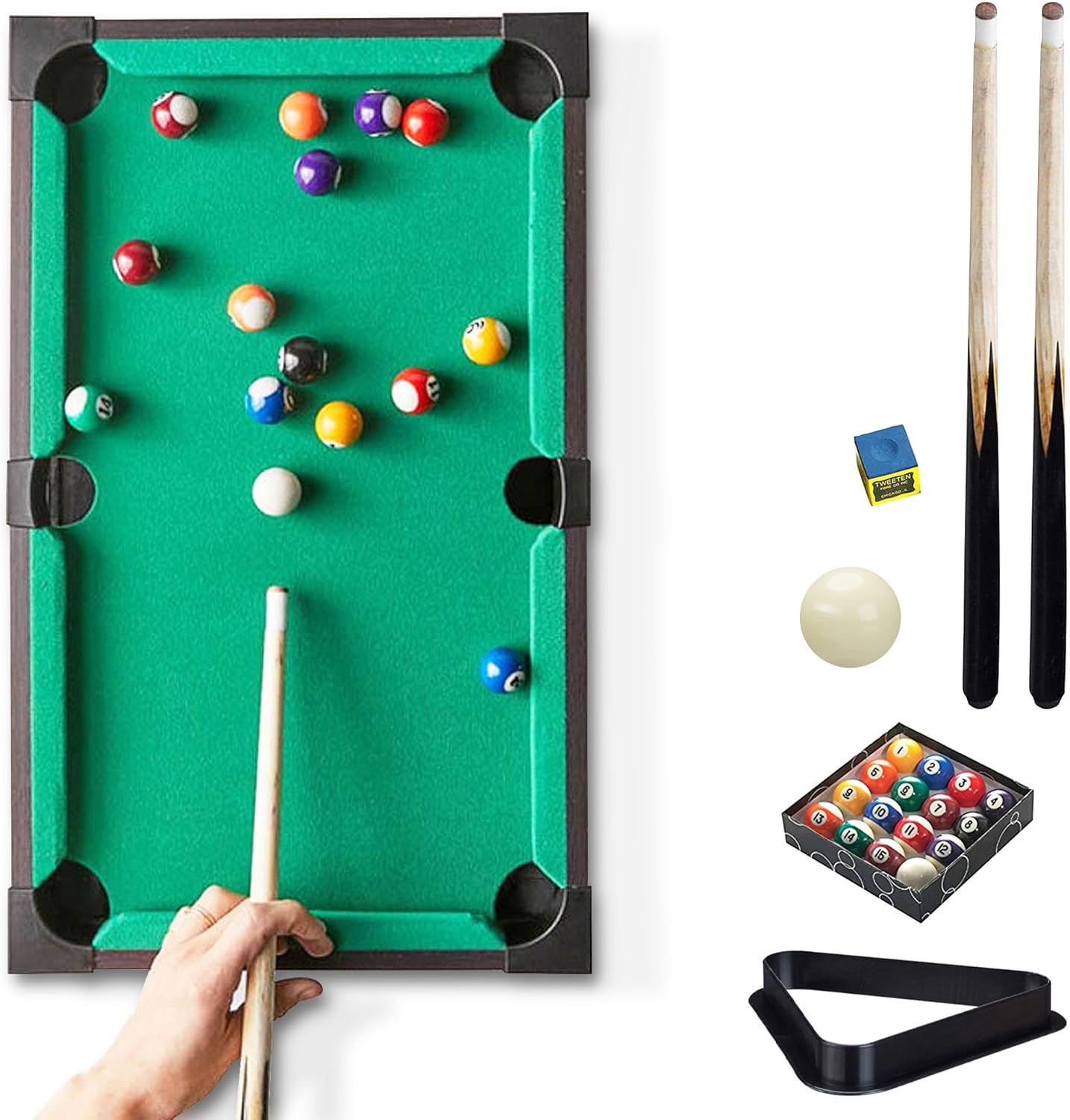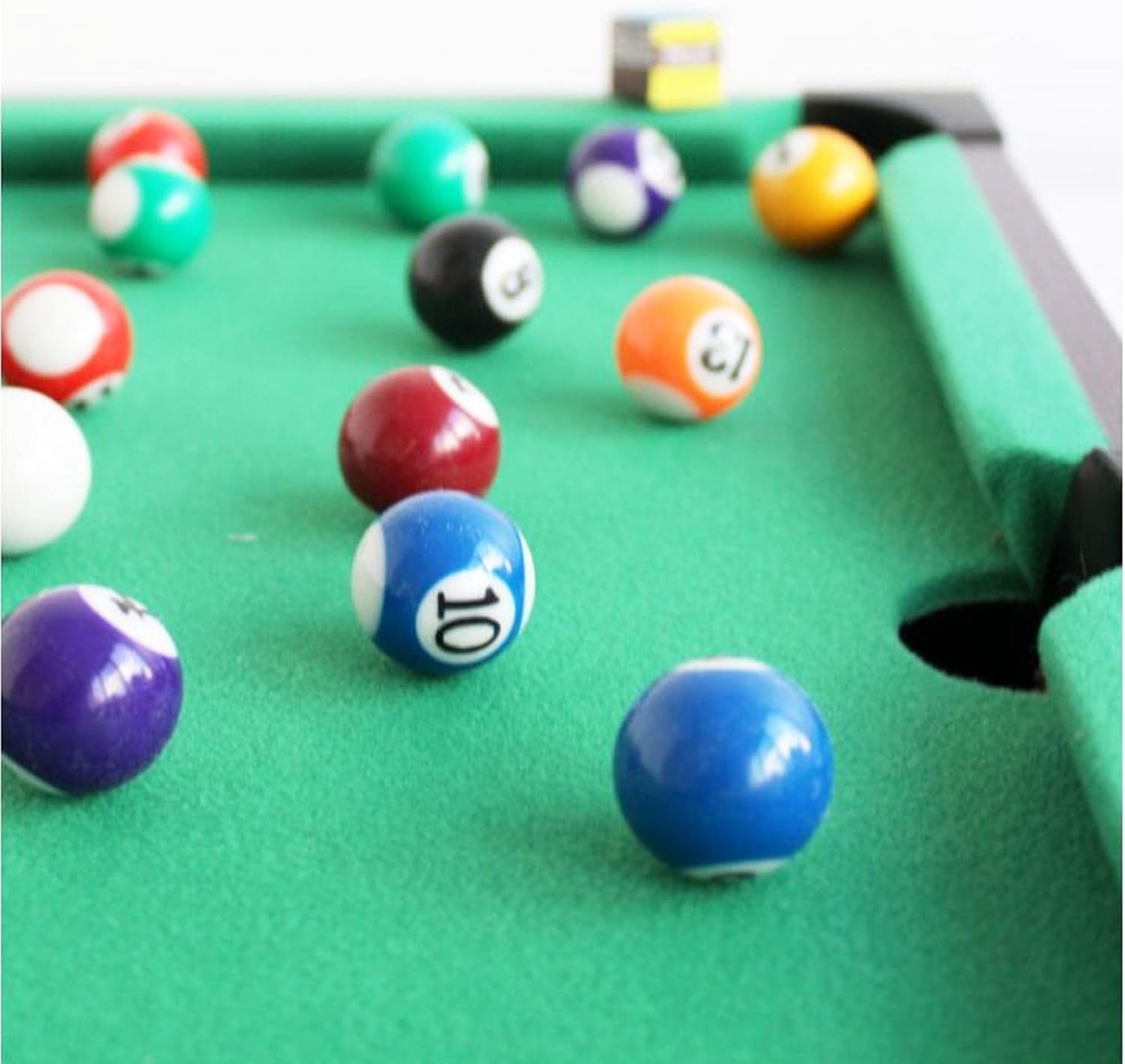 🎱 CONVENIENTE - Sposta questo mini tavolo da biliardo a casa ovunque. Questo tavolo da biliardo ha tutto per divertire i bei momenti con gli amici o la famiglia. Questo mini biliardo ha tutti i dettagli per creare un classico tavolo da biliardo. 🎱 MOBILE - Posizionalo, ad esempio, sul tavolo da pranzo, sul supporto desiderato e alla giusta altezza. Gioca alle feste in vacanza o in ufficio mentre sei seduto con i tuoi figli e i tuoi amici o in ufficio. 🎱 Accessori - completo come un grande mini biliardo è dotato di un set di 16 bilie (compresa quella bianca), 1 triangolo, 1 gesso e 2 stecche. 🎱 REALISTICO - Il biliardo americano è dotato di tappetino in feltro verde per un'eccellente sensazione di corsa e comfort di gioco. Ritrova tutte le sensazioni di un vero tavolo da biliardo con il minimo ingombro 🎱 CARATTERISTICHE - Materiale: MDF aspetto legno
