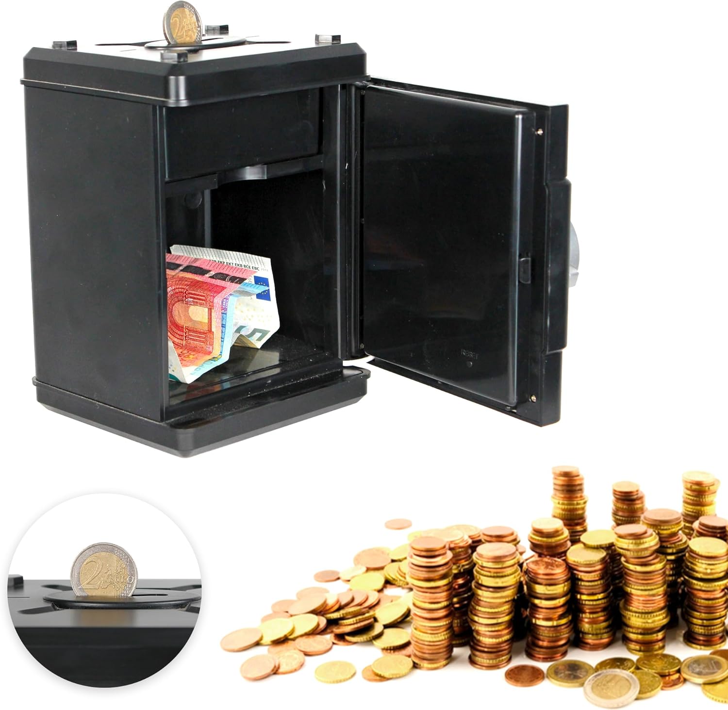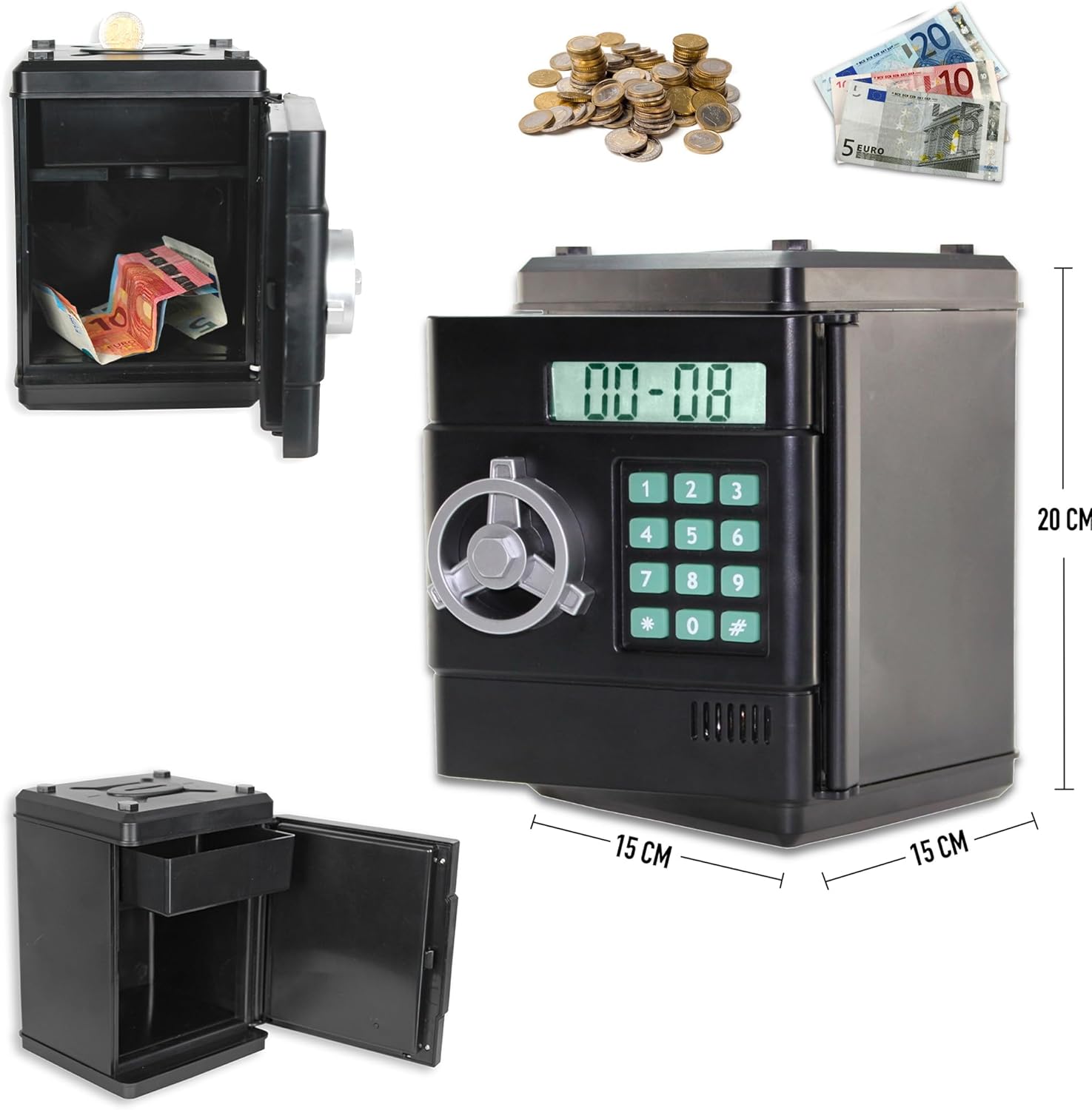 💶 CASSAFORTE ELETTRONICA - Un originale salvadanaio digitale che protegge i tuoi risparmi e i piccoli oggetti di valore. Ideale per riporre in tutta sicurezza monete, banconote, gioielli o accessori in una mini cassaforte giocosa e pratica. 💶 CODICE SICURO A 6 CIFRE – Accedi ai tuoi risparmi utilizzando solo il tuo codice personale a 6 cifre, che puoi modificare in qualsiasi momento. Un tastierino numerico con effetti sonori rende l'esperienza divertente e realistica. 💶 CONTEGGIO AUTOMATICO DELLE MONETE – Ogni moneta inserita viene riconosciuta e conteggiata elettronicamente. Il totale viene visualizzato in tempo reale sullo schermo LCD in modo da poter monitorare i tuoi risparmi settimana dopo settimana. Compatibile solo con monete Euro. 💶 PRATICO DOPPIO SCOMPARTO - Scomparto superiore per monete, scomparto inferiore per banconote, orologi, gioielli o piccoli tesori. Un salvadanaio interattivo che unisce divertimento e apprendimento a gestire il denaro. 💶 CARATTERISTICHE – Dimensioni: 13 x 13 x 19,5 cm. Materiale ABS resistente. Funzione orologio integrata quando il salvadanaio non è attivo. Funziona con 2 batterie AA (non incluse). Manuale incluso. 2 anni di garanzia.