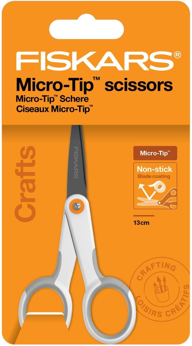 Pratiche forbici fai da te per tagli precisi e puliti attraverso materiali appiccicosi come nastro adesivo, vinile e adesivi, Adatte per mancini e destrimani Le lame in acciaio inossidabile affilate di precisione rimangono affilate a lungo, tagliano fino alla punta grazie alle lame Micro-Tip - per dettagli in filigrana e tagli precisi in spazi ristretti Rivestimento antiaderente per lame pulite quando si tagliano adesivi senza problemi Manici ergonomici Softgrip per comfort e controllo Contenuto: 1x forbici Fiskars Micro-Tip, lunghezza totale: 12,3 cm, lunghezza lama: 4,7 cm, peso: 18 g, acciaio inossidabile/plastica, bianco/arancione, art. NO. : 1070025