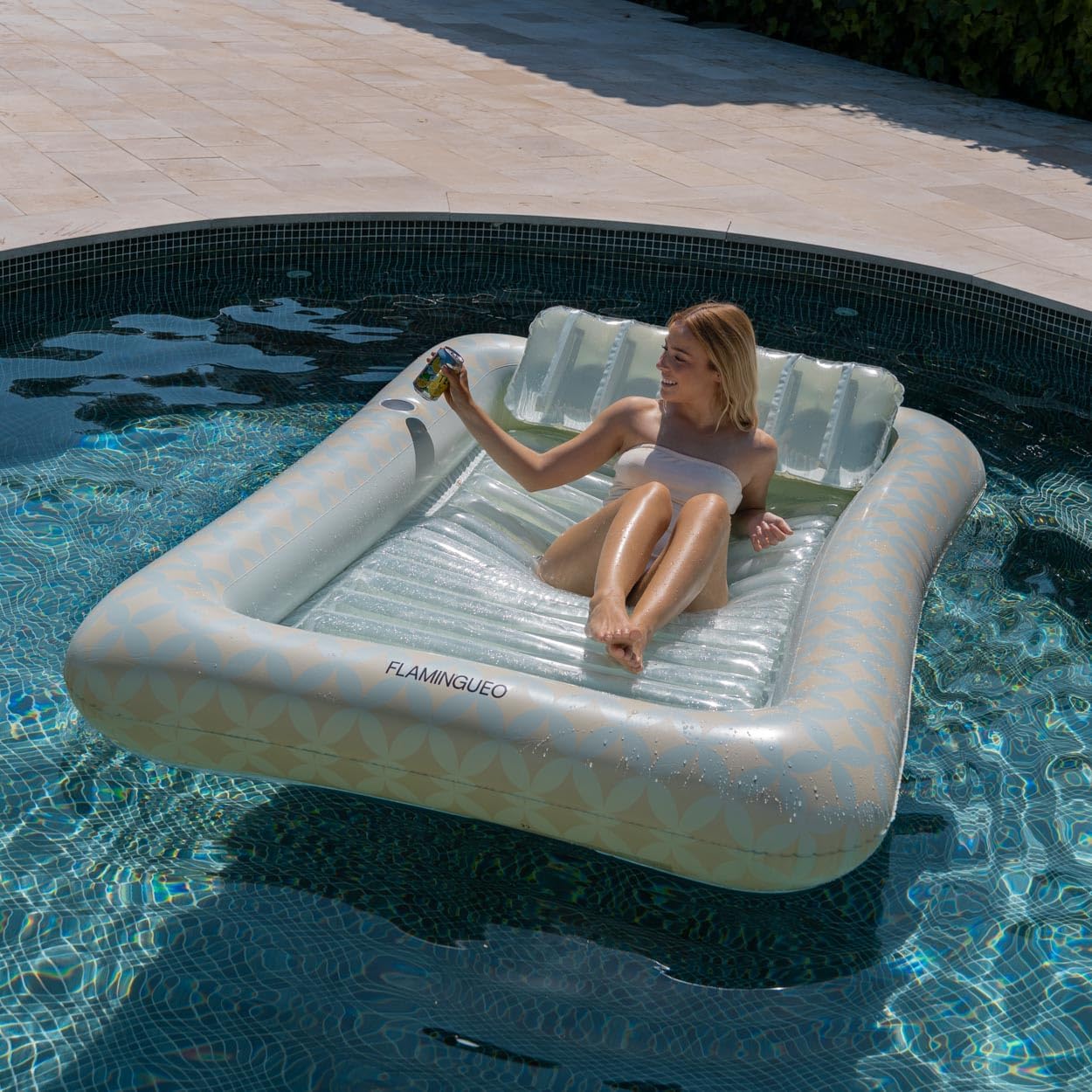 DESIGN: Il galleggiante gigante presenta una stampa geometrica, una base a coste per il massimo comfort, un sottobicchiere per goderti la tua bevanda preferita e un cuscino rimovibile. PERFETTO PER PISCINA E SPIAGGIA: il tappetino è perfetto per prendere il sole in piscina e in spiaggia, dentro e fuori dall'acqua. Riempilo con acqua per rinfrescarti mentre prendi il sole. MISURE E MATERIALE: Il tappetino da piscina ha una dimensione extra large, misura 205 x 140 x 38 cm, perfetto per la condivisione tra due persone. È realizzato in resistente PVC da 0,28 mm. DOPPIA VALVOLA DI APERTURA: Il tappetino per piscina è dotato di una valvola a doppia apertura che consente un gonfiaggio più rapido, facilitando il gonfiaggio e trattenendo l'aria più a lungo. CONSIGLI PER L'USO: Si consiglia di non lasciare il galleggiante al sole quando non in uso per evitare danni alla superficie. Può supportare un peso massimo di 125 kg.