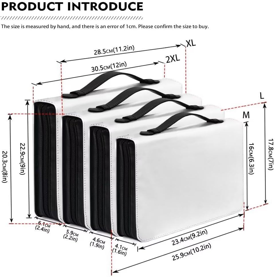 Materiale di alta qualità: la copertura per bibbia è realizzata in pelle PU resistente e impermeabile con manico resistente, durevole, leggera e facile da pulire. Questo può proteggere la vostra bibbia o elettronica da graffi, urti, luce solare, pioggia e polvere. Dimensioni adatte: la copertina per bibbia ha quattro dimensioni e si adatta a una Bibbia di dimensioni standard o grandi o a un libro di grandi dimensioni. M: 23,4 x 4,1 x 16 cm; L: 25,9 x 4,8 x 7 cm; XL: 28,4 x 5,6 x 8 cm; 2XL: 30,5 x 6,1 x 9 cm. Le nostre copertine bibliche hanno più tasche. Le tasche interne possono tenere organizzati bibbia, penne, quaderni, diari di preghiera, bollettini della chiesa, biglietti di preghiera e altri oggetti. Multifunzionale: non è solo una borsa per la Bibbia, ma può anche essere utilizzata quotidianamente come borsa tote bag, copertina tascabile, borsa per il trucco o valigetta per tablet. La copertina della Bibbia può essere utilizzata anche come organizer per riviste, astuccio colorato, borsa organizer elettronica, valigetta o borsa per cosmetici. La borsa Bibbia è dotata di un nastro integrato che puoi usare come segnalibro per la tua prossima lettura. Facile da trasportare: le coperture per bibbia sono molto leggere con un manico resistente, puoi portare questa borsa per la Bibbia in chiesa, scuola, biblioteca, sala studio per lo studio della Bibbia, il culto o la preghiera. Le cerniere si incontrano al centro e si chiudono senza intoppi fino alla parte superiore, rendendo comodo appoggiare la Bibbia piatta. Regalo perfetto: abbiamo progettato coperture per bibbia per adattarsi a una varietà di persone, ideali per lo studio della chiesa, la preghiera o l'uso quotidiano. Le nostre copertine bibliche sono il regalo perfetto per amici, familiari, pastori, professionisti, viaggiatori, studenti, insegnanti e chiunque ami leggere e studiare la Bibbia.