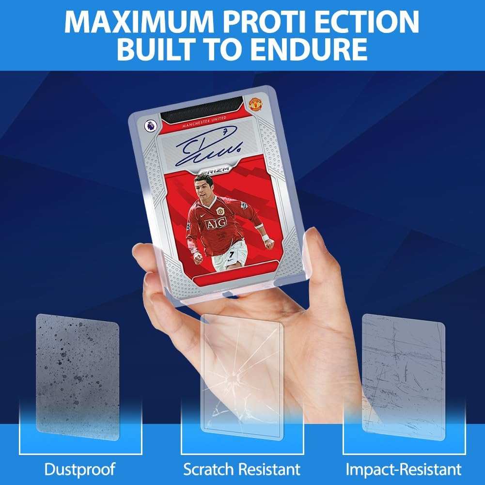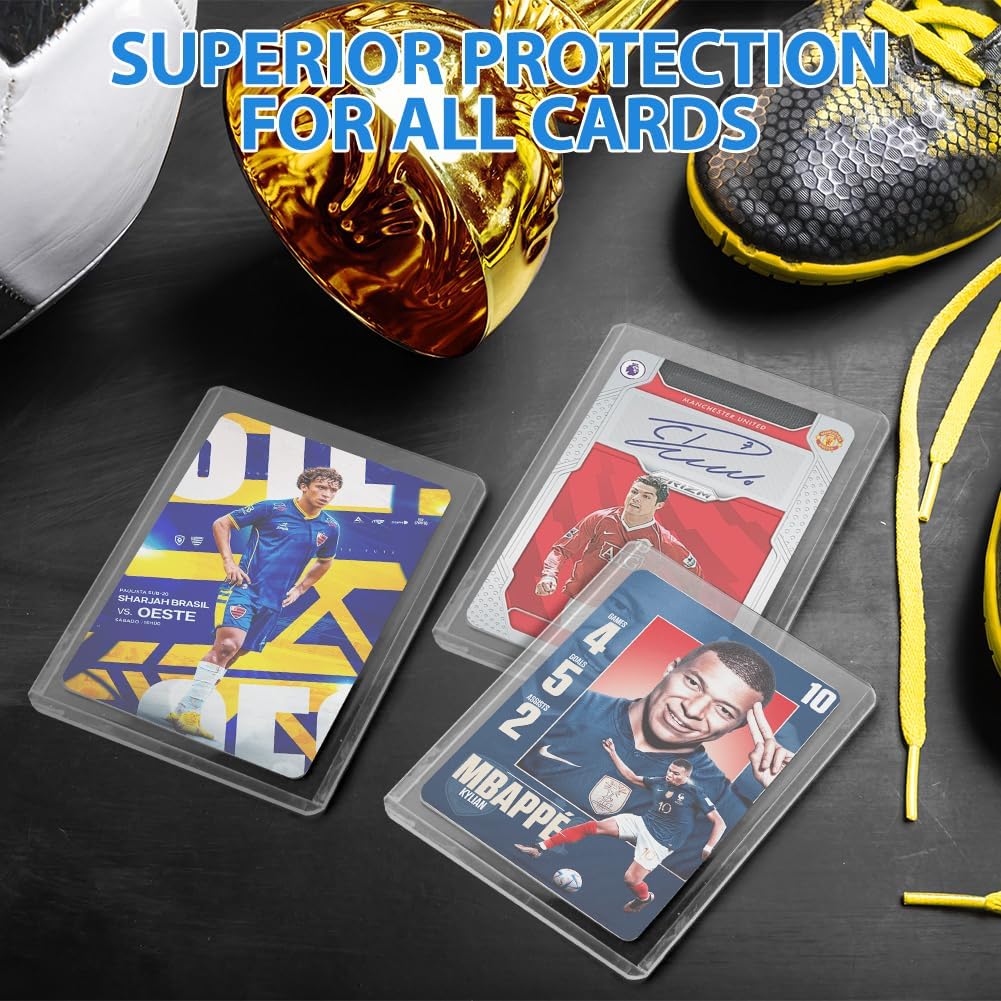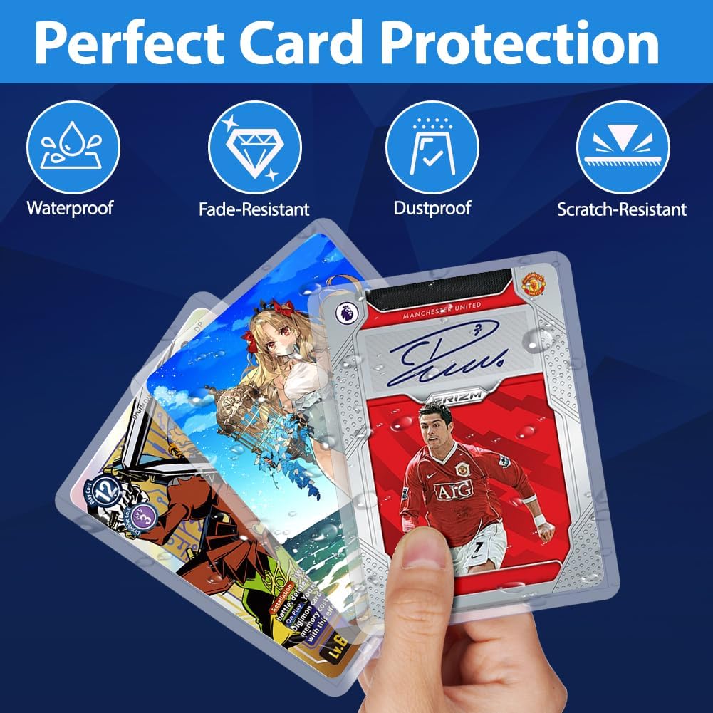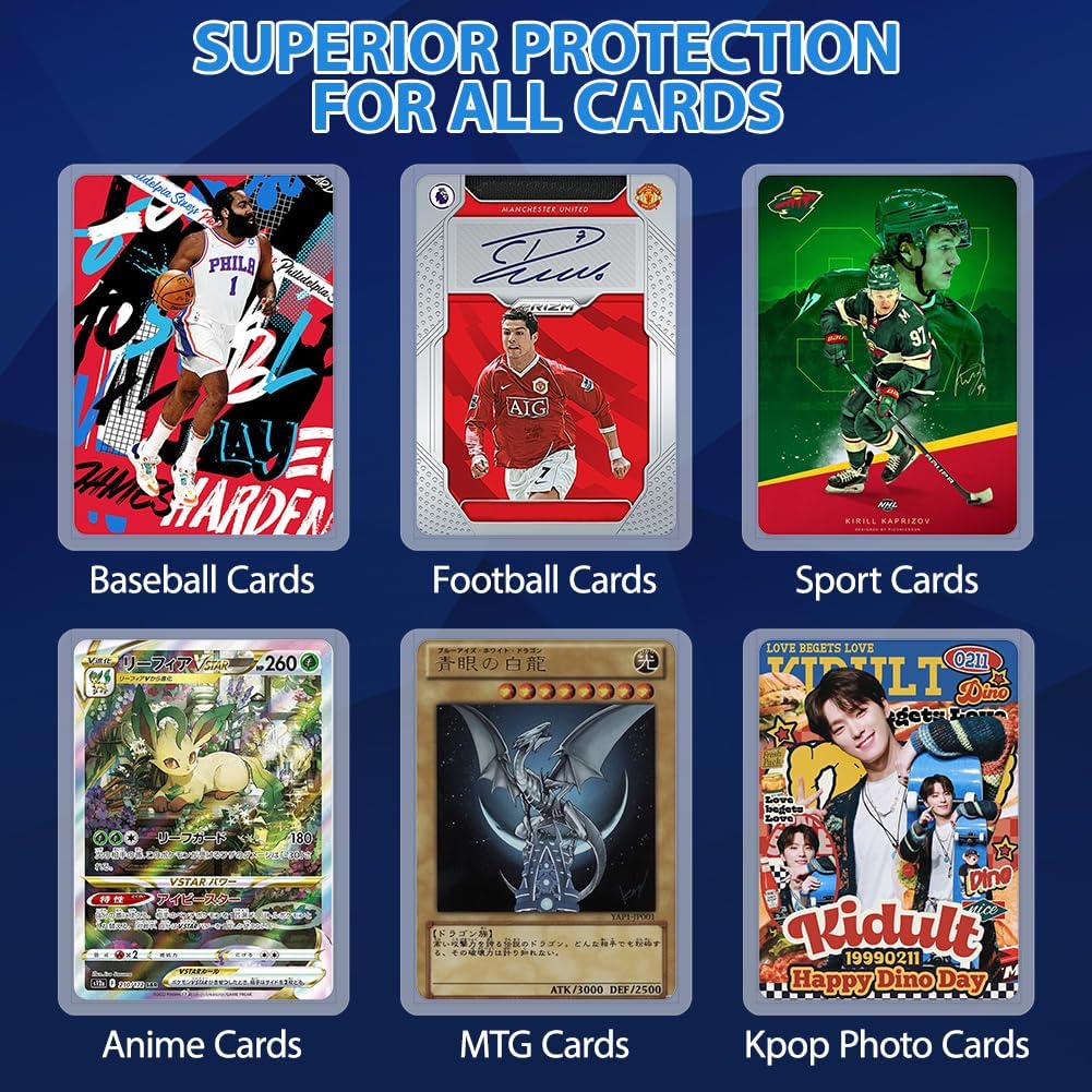 【Protezione Superiore】Realizzate con materiali PP di alta qualità, queste custodie rigide per carte sono abbastanza robuste da fornire un'eccellente protezione contro graffi, usura e strappi. Mantieni le tue preziose carte da collezione in perfette condizioni per gli anni a venire. 【Vestibilità Perfetta】Le nostre protezioni per carte da calcio misurano 69*97 mm, progettate per adattarsi a carte da gioco collezionabili di dimensioni standard, offrendo una vestibilità comoda e sicura. Impediscono alle carte di scivolare fuori e garantiscono un mescolamento e una manipolazione fluidi durante il gioco. 【Visibilità Chiara】Il design trasparente delle custodie consente una visione chiara della grafica e dei dettagli delle tue carte. Puoi apprezzare appieno la bellezza delle tue carte da collezione mantenendole ben protette. Queste custodie sono trattate con tecnologia antistatica, che aiuta a ridurre l'attrazione di polvere e detriti, mantenendo le tue carte pulite. 【Facile da Installare】Riceverai 100 bustine rigide. Queste custodie per carte sono progettate in modo pratico con un design aperto in alto, che è comodo per inserire ed estrarre le carte e può evitare efficacemente il peso causato dalla piegatura delle carte. Ideale per i collezionisti che spesso maneggiano e proteggono le carte. 【Uso Versatile】Perfette per collezionare qualsiasi tipo di carta standard, come carte sportive, carte da baseball, carte da calcio, Yu-Gi-Oh, Magic The Gathering e altro ancora. Che tu sia un giocatore occasionale o un collezionista serio, queste bustine sono un accessorio indispensabile.