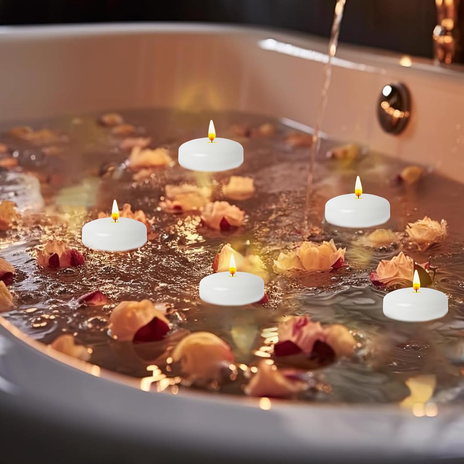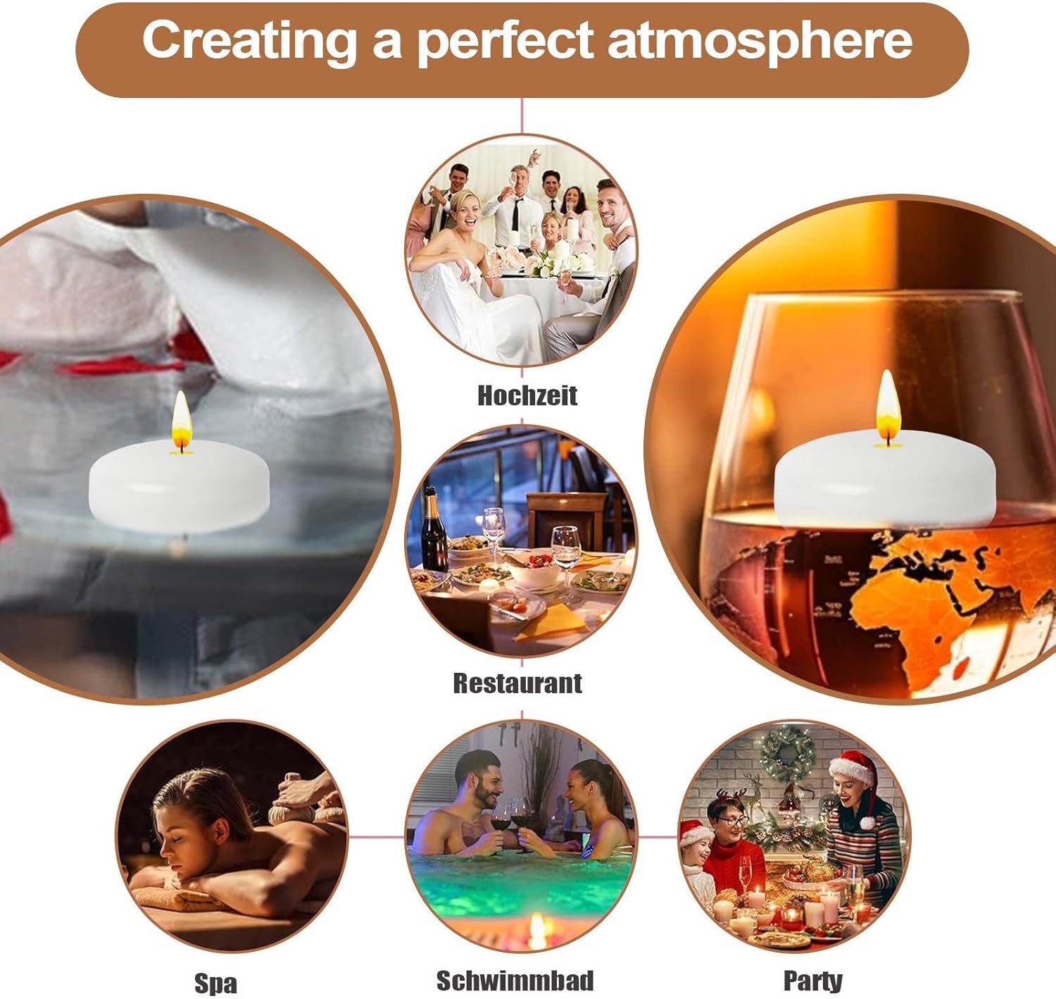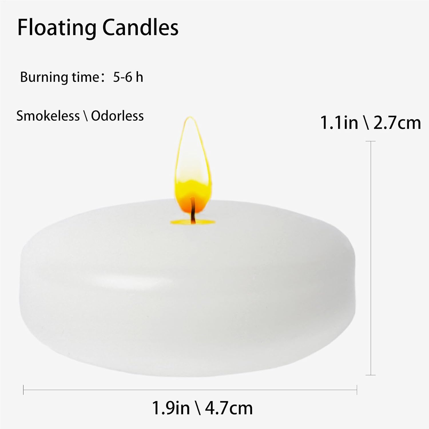 Floating Candles: These small round floating candles are designed to add a soft, romantic glow to any water-based setting, creating an elegant ambiance that is perfect for enhancing the atmosphere during special occasions, celebrations, or intimate gatherings Small Round Floating Water Candles: Compact in size but big on , these round candles effortlessly float on water, creating a mesmerizing effect in your vase, bowl, or pool, and offering a unique touch of elegance for decor or centerpiece arrangements Candlelight Interior Centerpieces: Ideal for use as interior decor, these floating candles make beautiful centerpieces for tables at weddings, dinners, or parties, adding warmth and sophistication to the setting, while casting a gentle, flickering glow that elevates the mood For Valentine's Day, Christmas Parties: Perfect for romantic settings like Valentine’s Day or festive events such as Christmas parties, these candles provide a captivating touch to your themed decorations, creating a cozy, atmosphere for your guests to enjoy Weddings Dinners: Enhance the beauty of your wedding or dinner event with these floating candles, creating an unforgettable visual effect that complements floral arrangements, glass vases, or water features, ensuring your special day is filled with elegance and charm