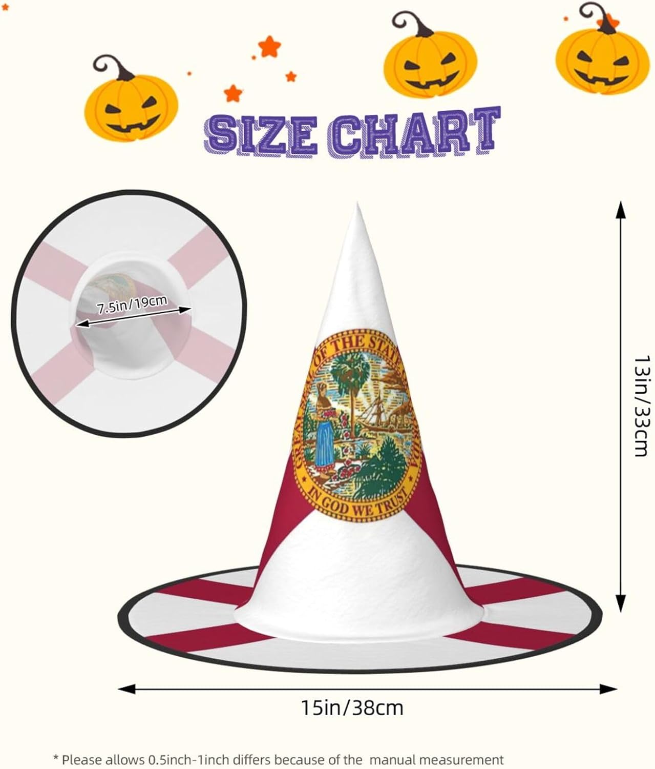 Realizzati in tessuto Oxford superiore, i nostri cappelli con stampa bandiera dello stato della Florida garantiscono durata e longevità. Il design unico consente di ridurre al minimo la parte superiore del cappello e i bordi di essere attorcigliati e piegati, rendendo i cappelli salvaspazio e facilmente portatili. Ogni cappello con stampa bandiera della Florida è di dimensioni generose per adattarsi alla maggior parte delle persone ed è leggero per un uso confortevole. Si prega di leggere la tabella delle taglie prima di effettuare l'ordine. Il design versatile dei nostri cappelli da strega di Halloween con stampa bandiera dello stato della Florida li rende perfetti per varie occasioni. Sono lavabili in lavatrice e ad asciugatura rapida per una facile manutenzione.