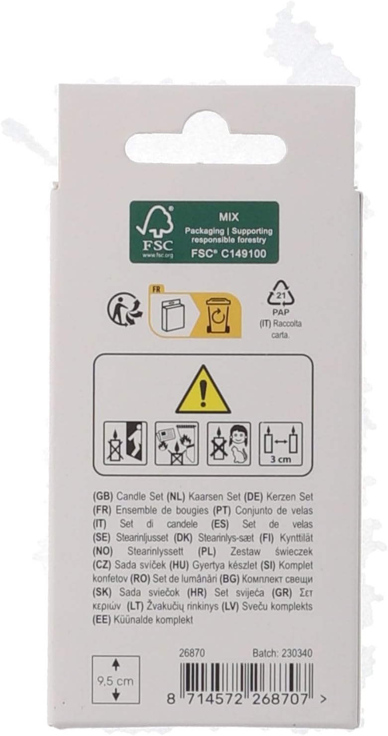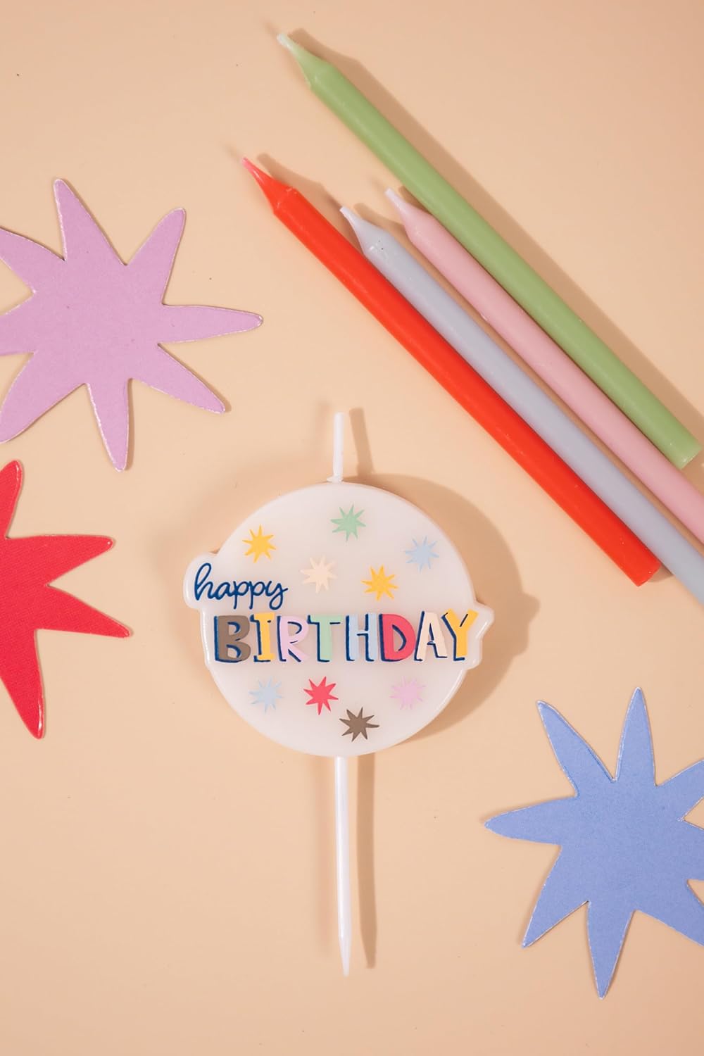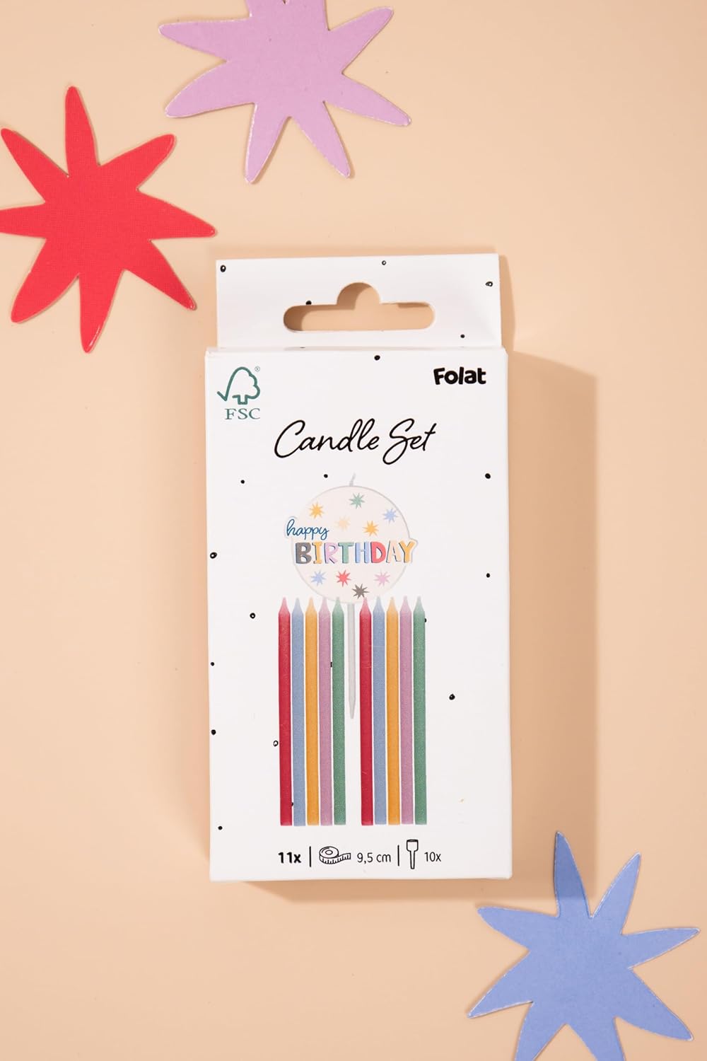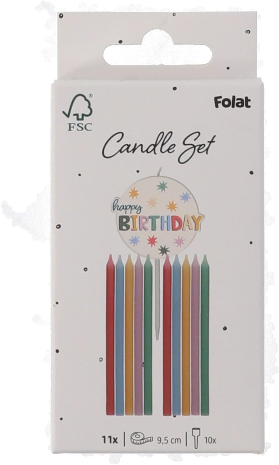 Esprimere un desiderio! Set candele - Starburst - 9,5 cm - 11 pezzi. Contiene: 11 candele. Ad esempio da utilizzare durante le seguenti occasioni di festa / celebrazione: Compleanno. 10 candele colorate dritte e 1 candela rotonda su un bastoncino (di plastica) con scritto "Happy BIRTHDAY". Le candele sono alte 9,5 cm. Include 10 supporti. Queste candele fanno parte della collezione Starburst di Folat. Questo articolo è fatto di cera.