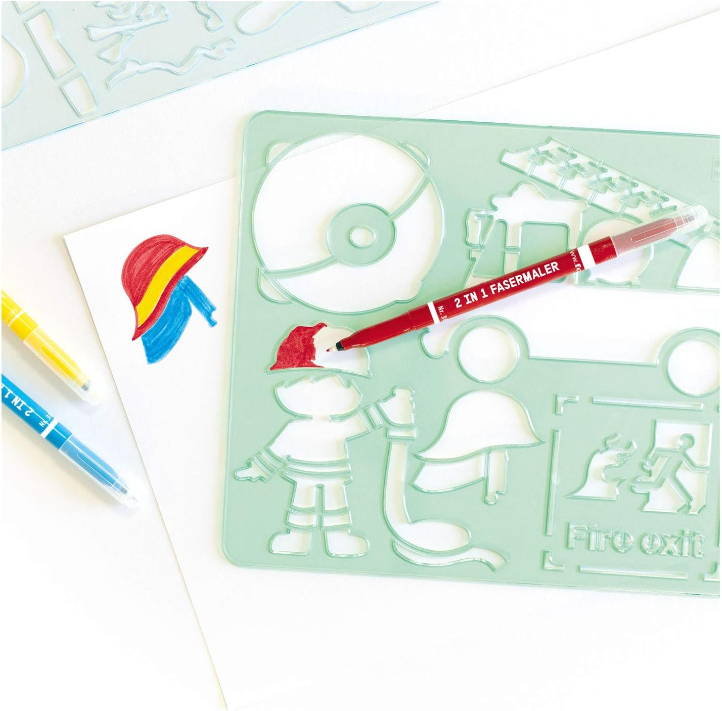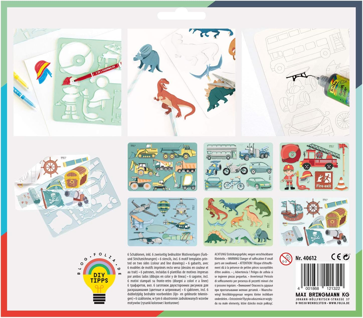 Set di 6 stencil per disegnare eventi avventurosi. Contiene 6 stencil, con 6 modelli stampati su entrambi i lati. Stencil con modelli ritagliati di auto da corsa, nave dei pirati, dinosauro, elicottero e molto altro ancora. Aiuto per bambini per colorare e creare immagini creative. Facile da usare con pastelli, pennarelli e pennarelli.