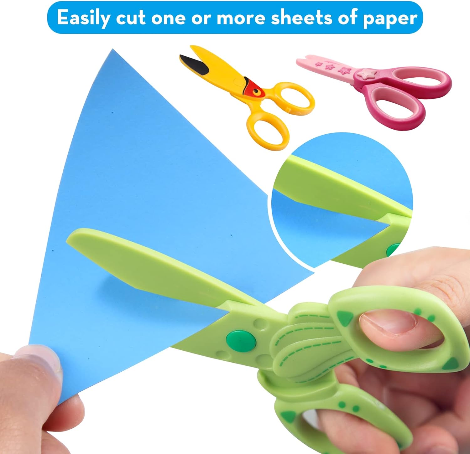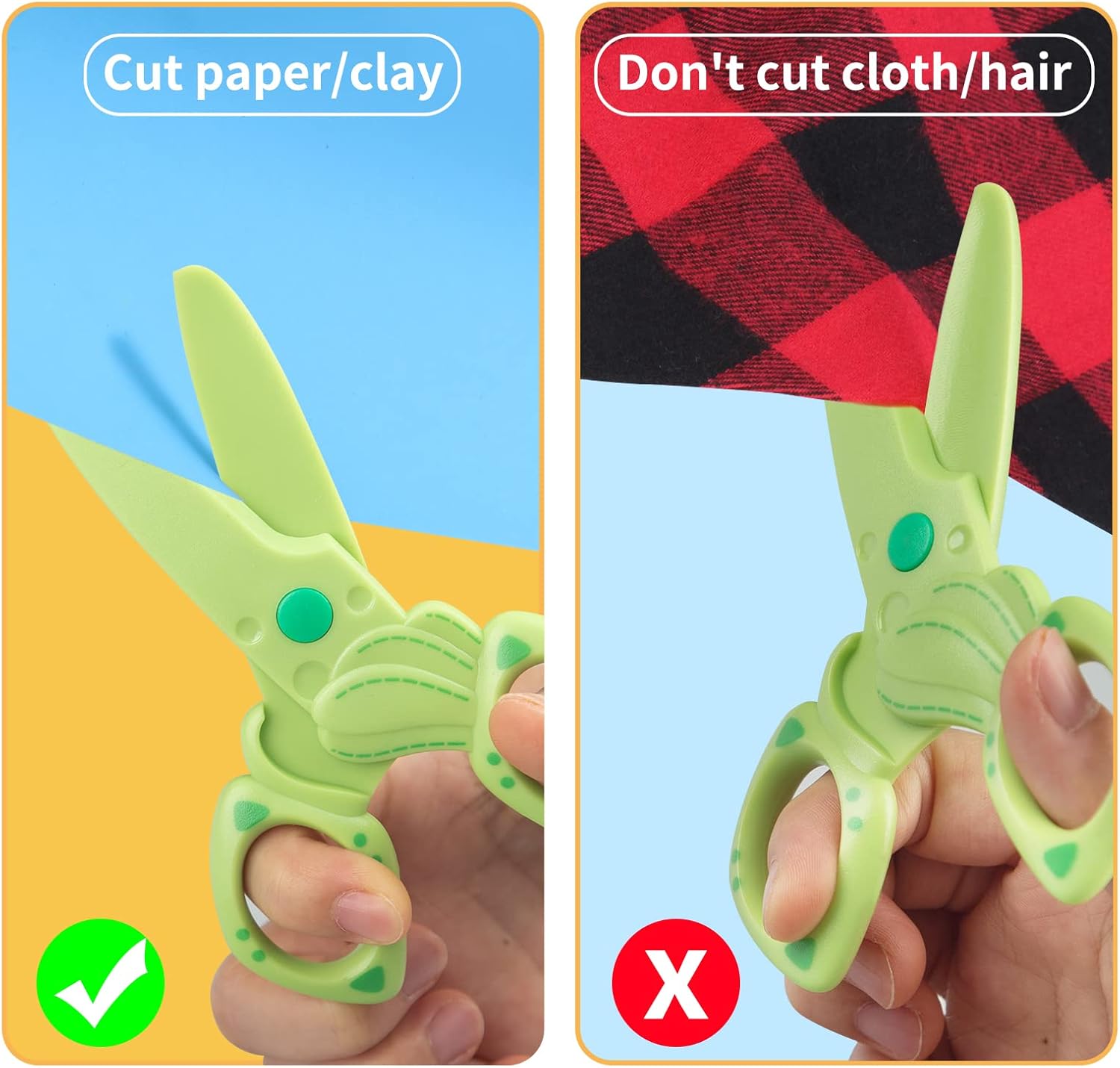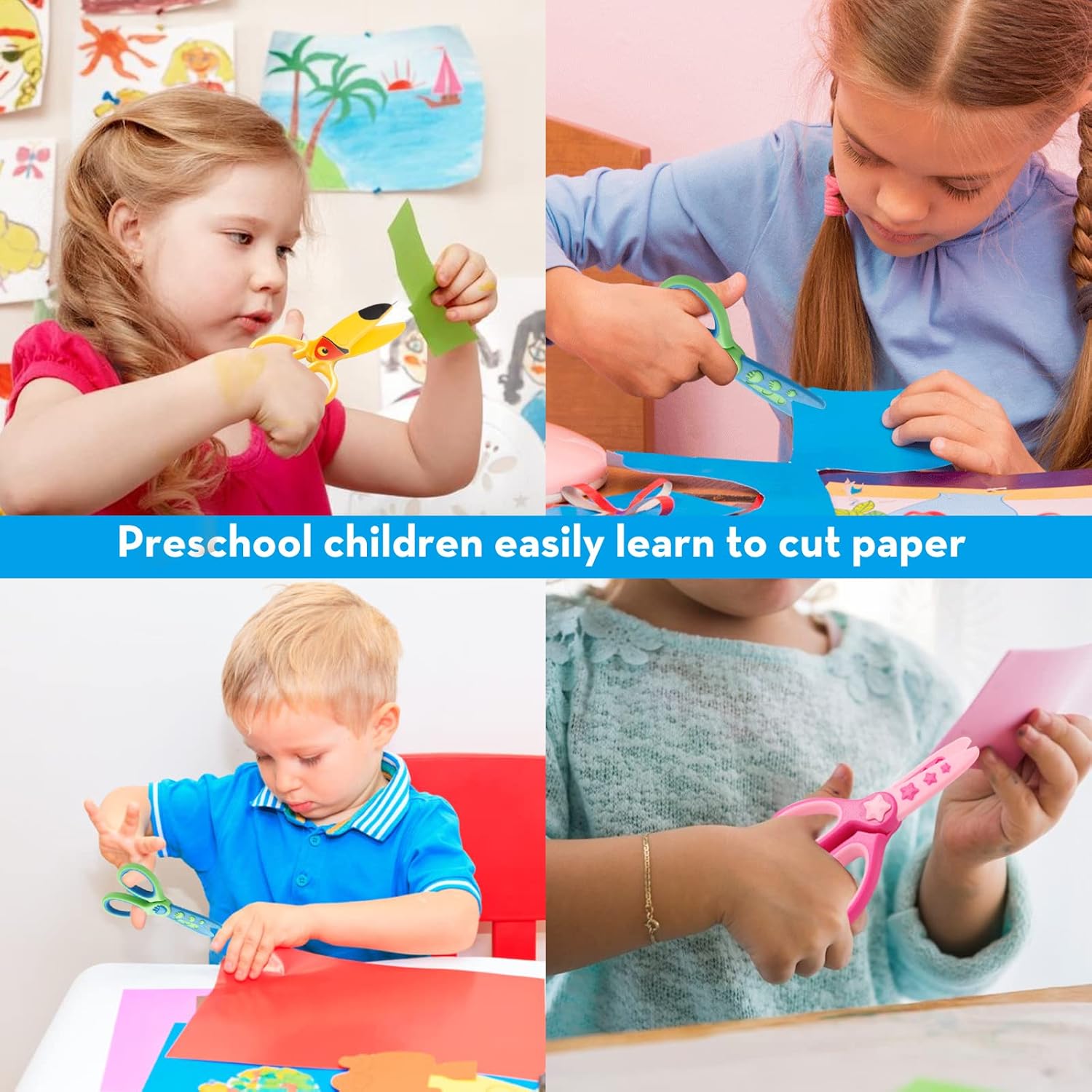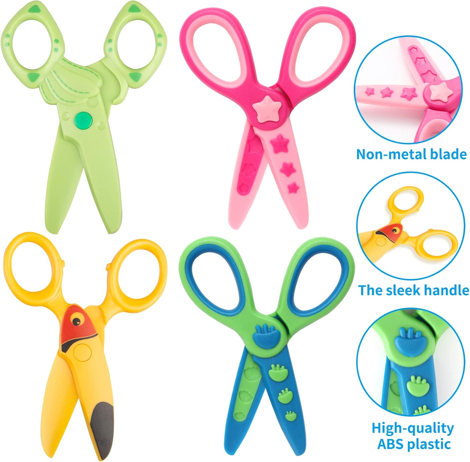 QUALIT SICURO: le forbici per bambini sono realizzate in plastica ABS di alta qualità e una lama non metallica e hanno superato un rigoroso processo di test e certificazione. Queste forbici possono tagliare solo carta e cartone. Il manico sottile è umanizzato e non è facile danneggiare la pelle dei bambini. Design carino e divertente: le nostre forbici di sicurezza per bambini sono disponibili in colori vivaci e brillanti, alla moda e attraenti, accattivanti per i bambini e ideali per promuovere la capacità di riconoscimento del colore dei bambini. Queste forbici possono attirare facilmente l'attenzione dei bambini e farle concentrare sull'artigianato. Design di dimensioni corrette: misura 11 x 6,3 cm / 4,7 x 2,5 pollici, ogni paio di forbici di sicurezza in plastica con comoda impugnatura si adatta alle mani piccole, può essere utilizzato con la mano sinistra e destra, solo per bambini dai 3 anni in su. Ampiamente utilizzato: può essere utilizzato per scuole e uffici. Perfetto per scrapbooking fai da te, biglietti di auguri e opere d'arte per bambini. Un buon aiuto per persone pratiche, sviluppo dell'intelligenza e più pratica per bambini e adulti. Contenuto della confezione: 4 forbici di sicurezza per bambini, in totale 4 diverse forme di design, un numero sufficiente, una ricca selezione di stili che possono soddisfare le vostre diverse esigenze e sostituzioni.