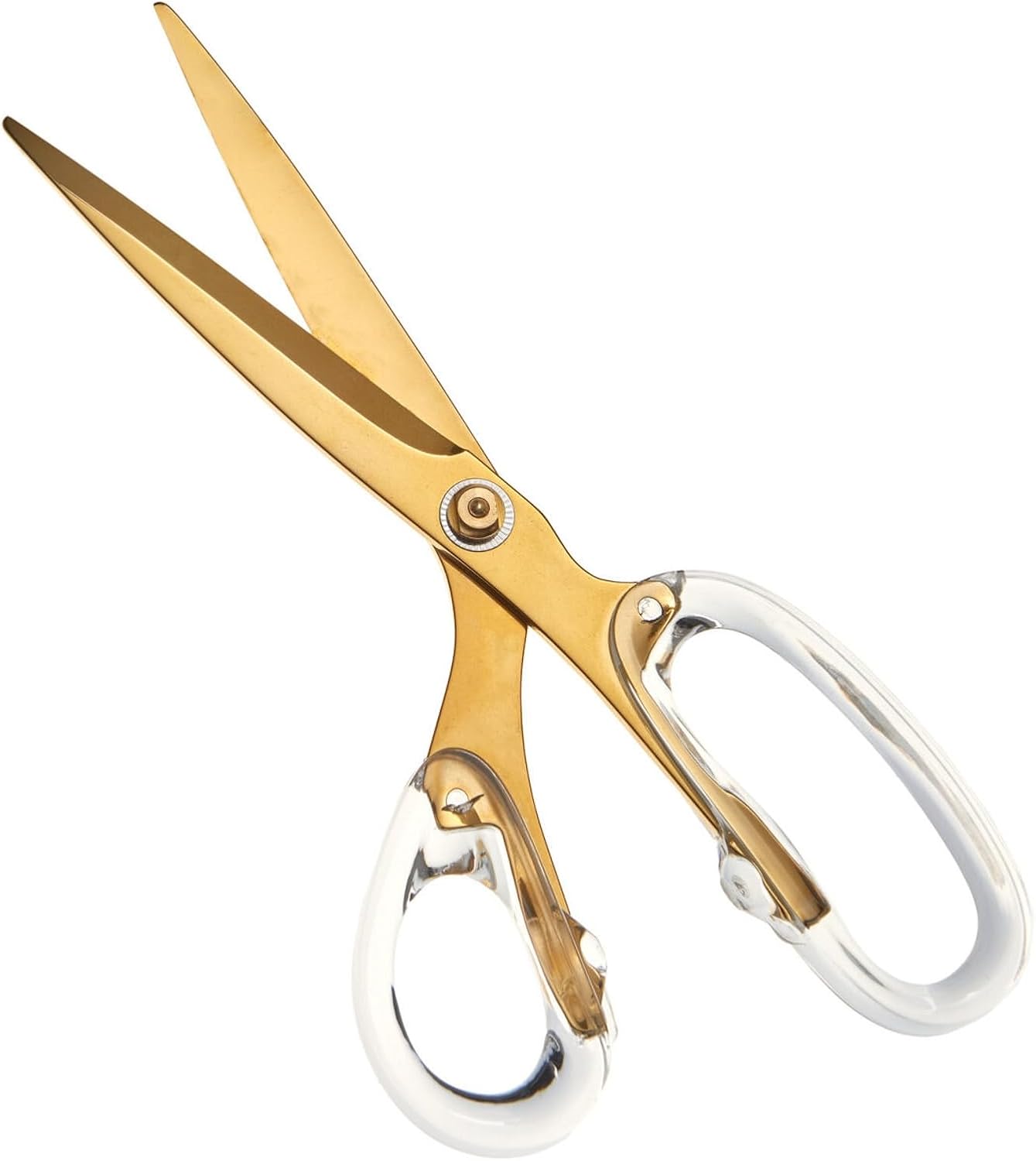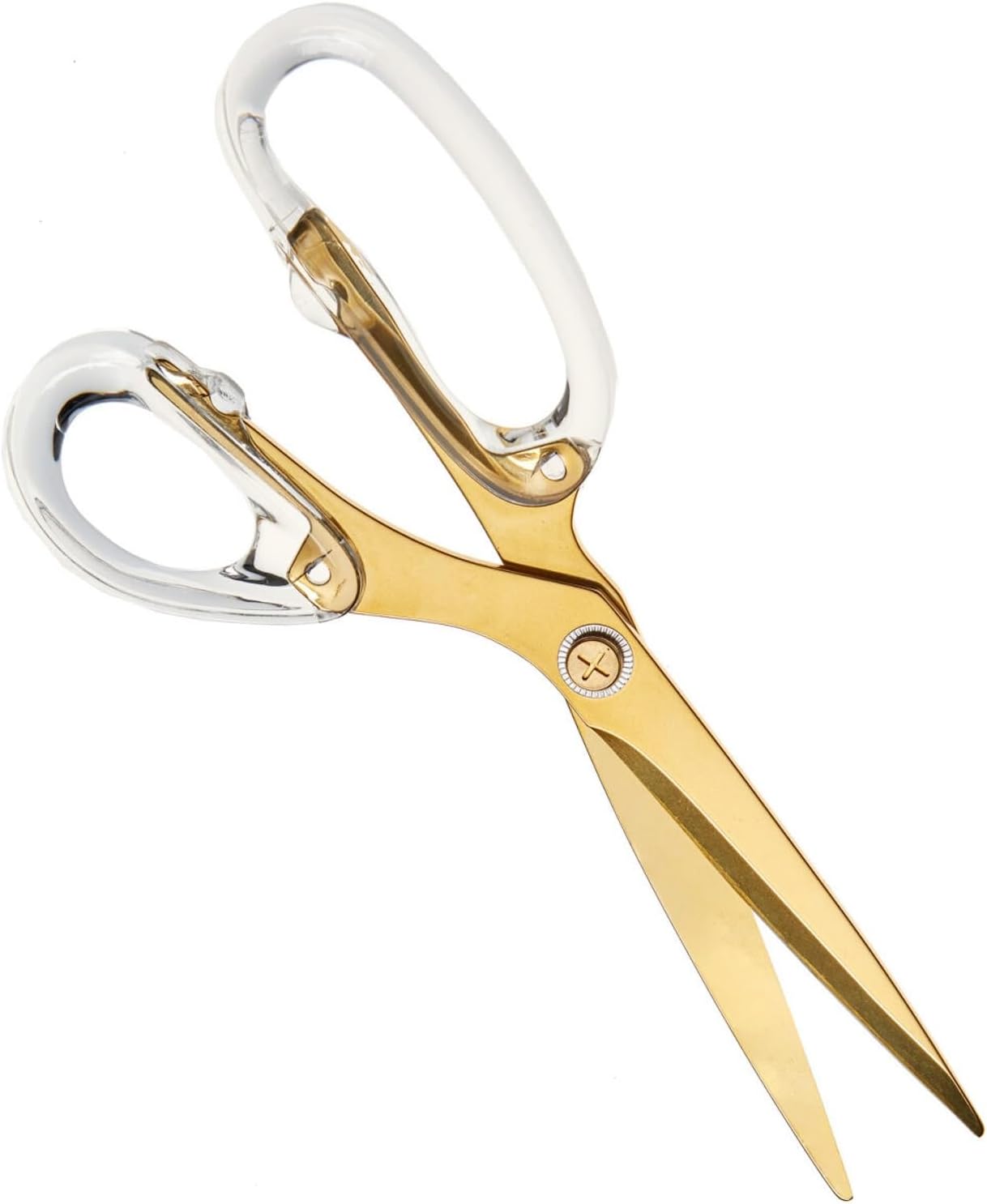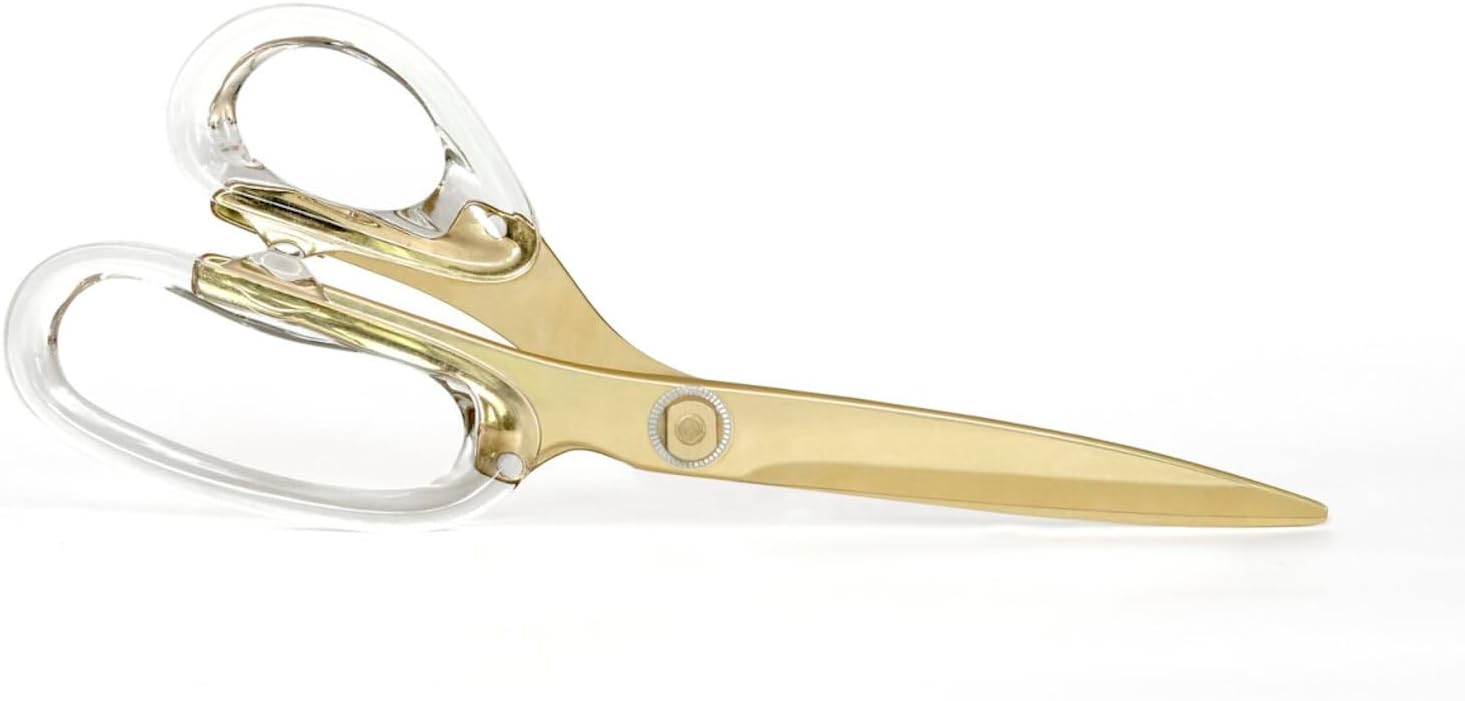 Dimensioni: 9" Materiali: metallo, acrilico Forbici resistenti con cesoie color oro e manici in acrilico che possono ospitare entrambe le mani sulla ruota sinistra e destra