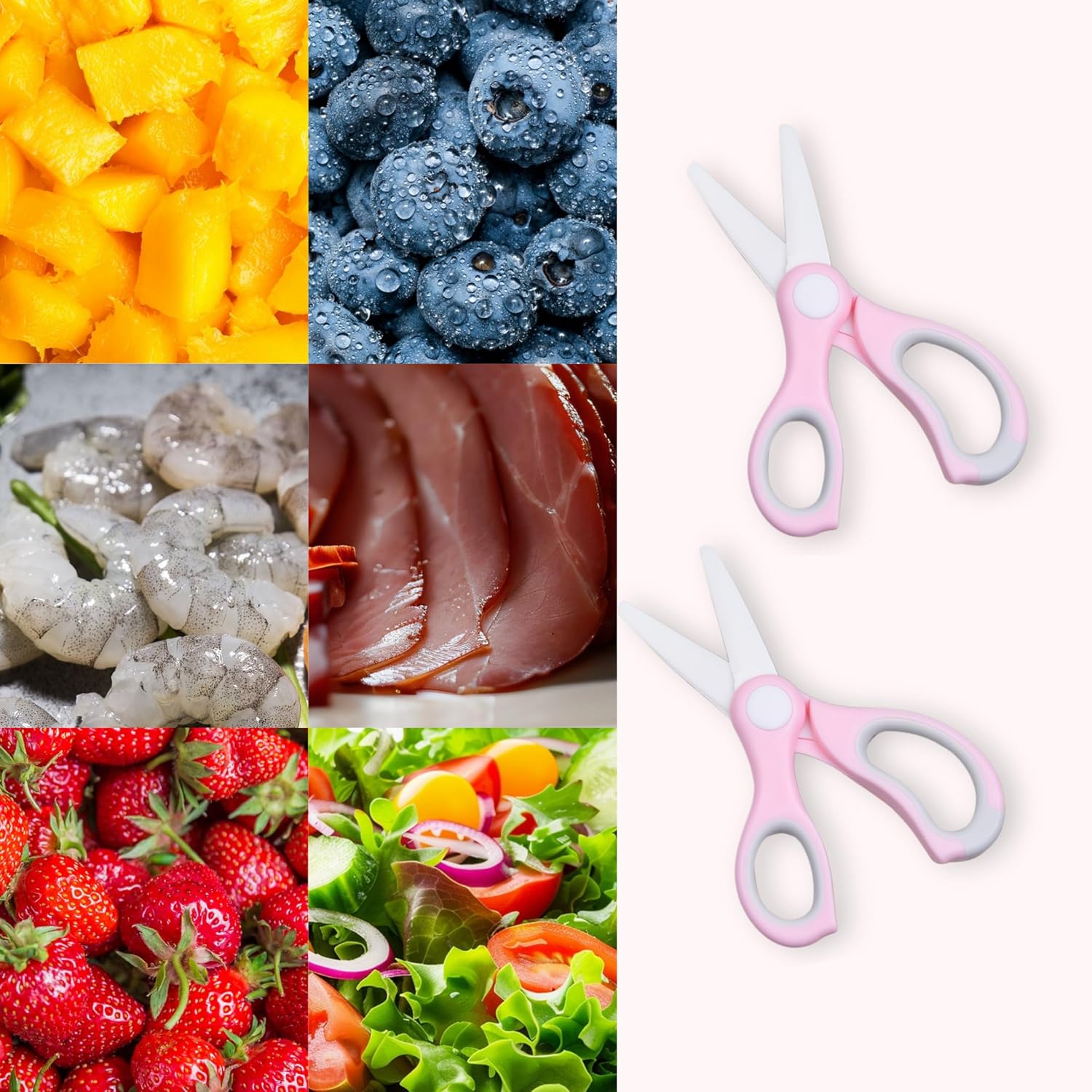 2 forbici in ceramica per alimenti per bambini: forbici in ceramica facili da usare e adatte agli alimenti che possono tagliare facilmente carne, pollo, verdure, frutta e altri tipi di alimenti morbidi come le tagliatelle. La confezione include 2 forbici per pappe in ceramica (rosa), 2 coperchi protettivi e una custodia. Taglierina per alimenti sicura e facile da usare: taglia il cibo con precisione e accuratezza. La lama in ceramica non porosa non trattiene macchie o odori, rendendo le forbici facili da pulire e disinfettare. Ogni paio di forbici è lungo circa 15 cm (5,9 pollici), la lama è circa 6,5 cm (2,5 pollici). facile, divertente e piacevole per tutti. Cesoie compatte e portatili: questi strumenti sono compatti, leggeri e comodi da portare ovunque. Vengono forniti con una custodia protettiva e possono essere trasportati facilmente poiché si adattano a borse e borse da viaggio.