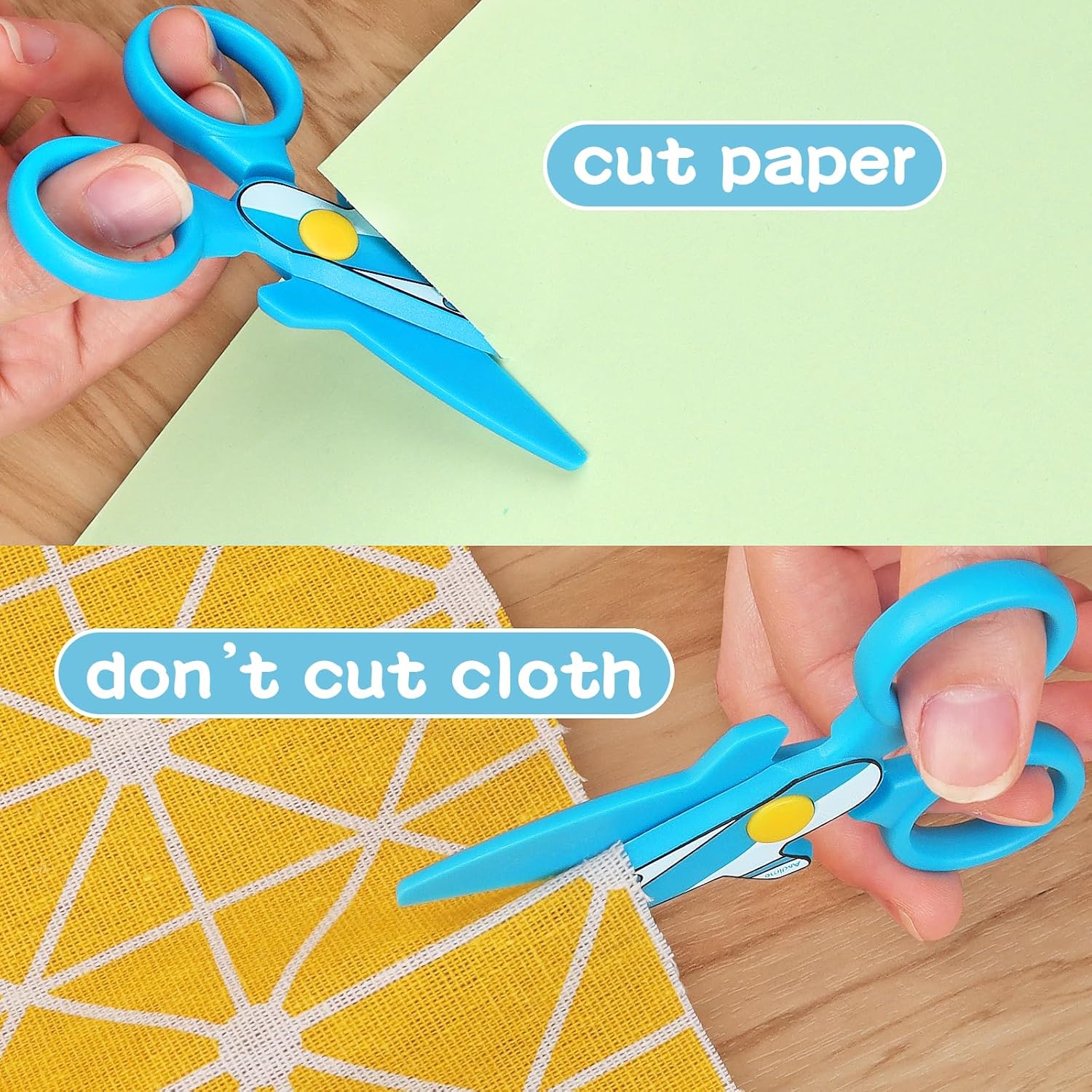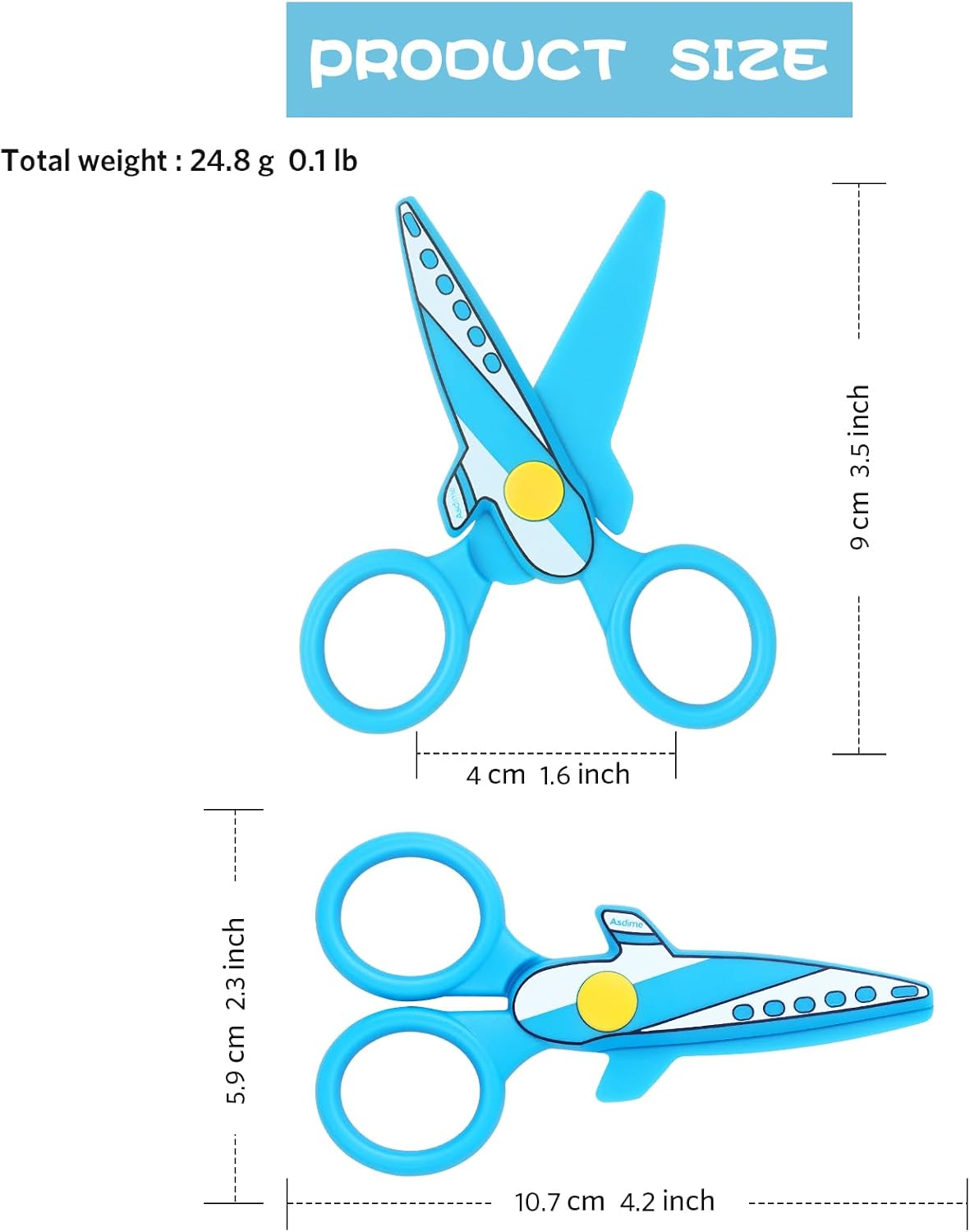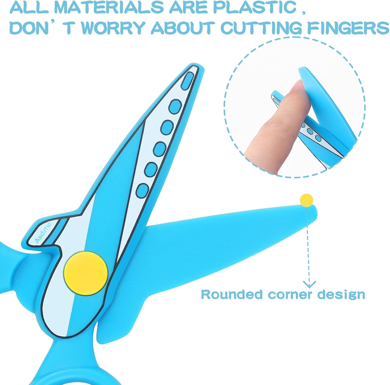 Forbici per bambini realizzate in plastica, punta smussata. Il bambino non sarà in grado di tagliare facilmente le dita durante l'uso. Le forbici sono adatte solo per tagliare carta o carte sottili. Forbici di sicurezza progettate con aspetto aeroplano. Due diverse composizioni di colori vivaci, attirano l'attenzione del bambino li rendono più felici quando si fanno artigianato. Forbici prescolari per uso domestico o scolastico, adatte per tagliare carta e carte sottili. Dimensioni: 10,8 cm, peso: 12,5 g. Aspetto elegante e carino, colori vivaci, design sicuro e affidabile, perfetto da regalare ai bambini Se avete domande circa l'articolo, non esitate a contattarci, saremo lieti di servirvi.