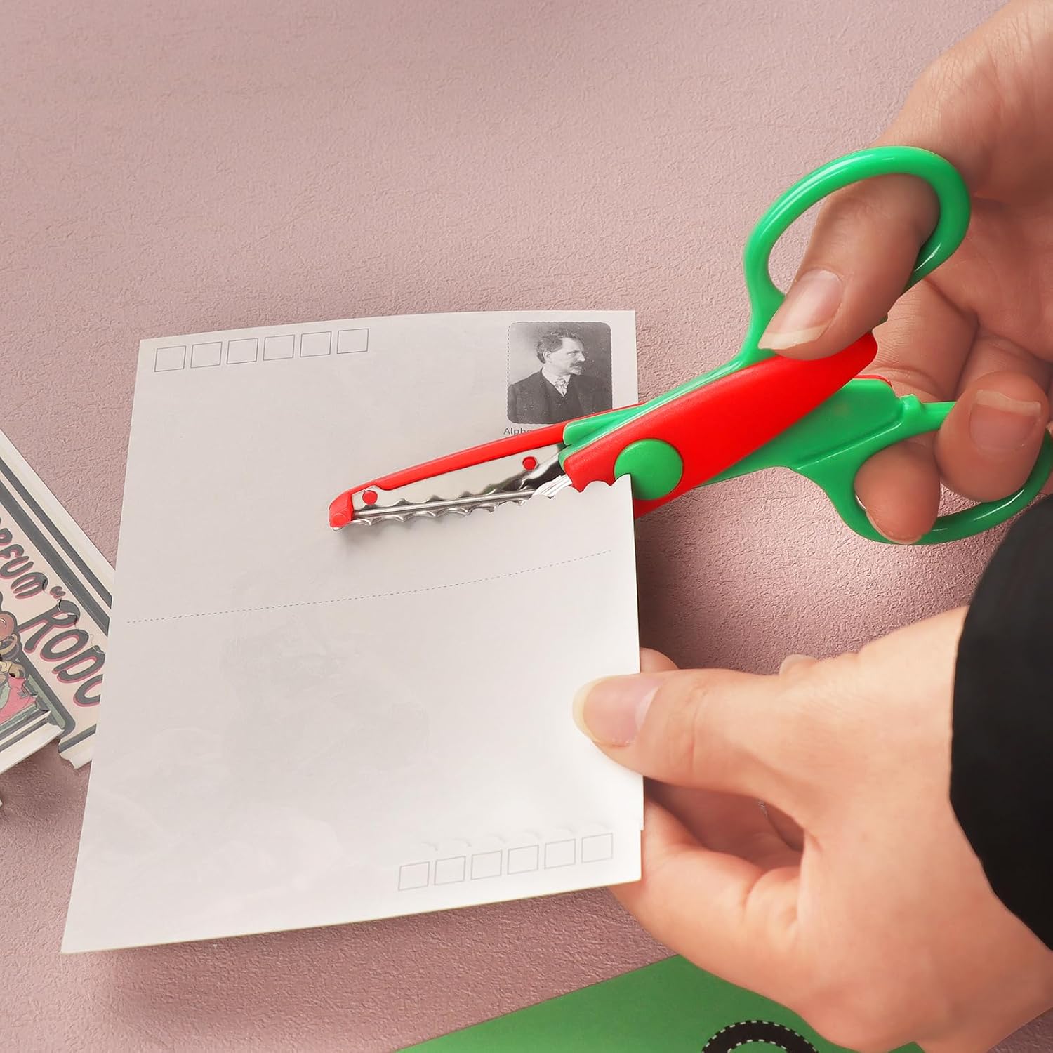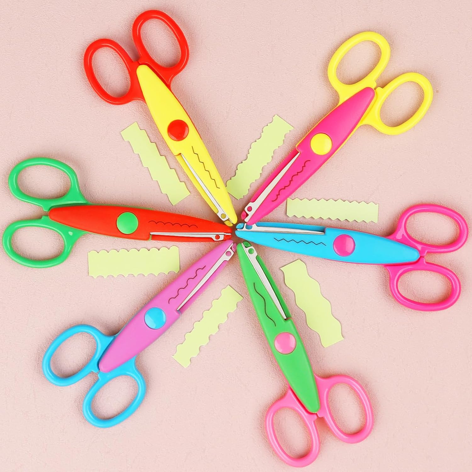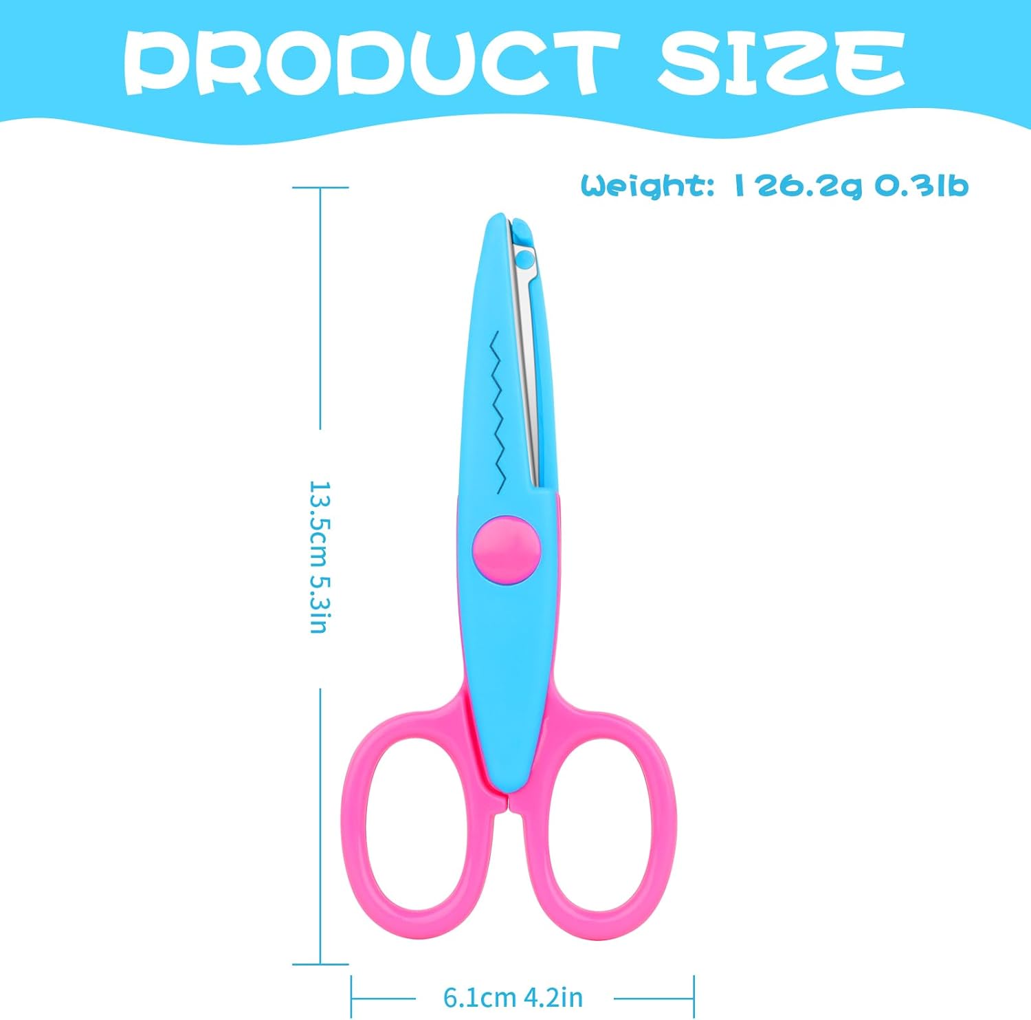 Avrai 6 forbici per bambini in diversi colori, divertenti tagli di carta, ognuna misura 13,5 cm e pesa 20 grammi. Queste forbici presentano colori vivaci e accattivanti come rosa, rosso, giallo, verde e viola che piacciono ai bambini Ogni paio di forbici può ritagliare forme diverse tra cui onde grandi, onde piccole, grandi forme frastagliate, piccole forme frastagliate, ingranaggi stampati e forme del castello. Varie forme possono stimolare l'immaginazione e la creatività del tuo bambino Le forbici colorate per bambini sono realizzate in acciaio inossidabile e plastica di alta qualità, robuste e durevoli. Le forbici per bambini, possono dare ai tuoi bambini visivi, promuovere efficacemente la loro percezione del colore e aumentare l'interesse dell'artigianato dei bambini Confortevoli e morbide al tatto, progettate per il comfort di tutti i bambini, forbici di sicurezza, si prega di notare che le forbici non sono adatte a bambini di età inferiore ai 3 anni Ampia gamma di usi: le graziose forbici per bambini sono perfette per lezioni d'arte prescolari, scuola domestica, corsi di artigianato, ecc., adatte per tagliare la carta o giocare a Cali, album fai da te, biglietti di auguri, album fotografici, ecc., possono facilmente attirare l'attenzione dei bambini, sono un buon aiuto per insegnanti e studenti nella classe di artigianato, ed è anche un buon set per coltivare l'interesse dei bambini per le arti