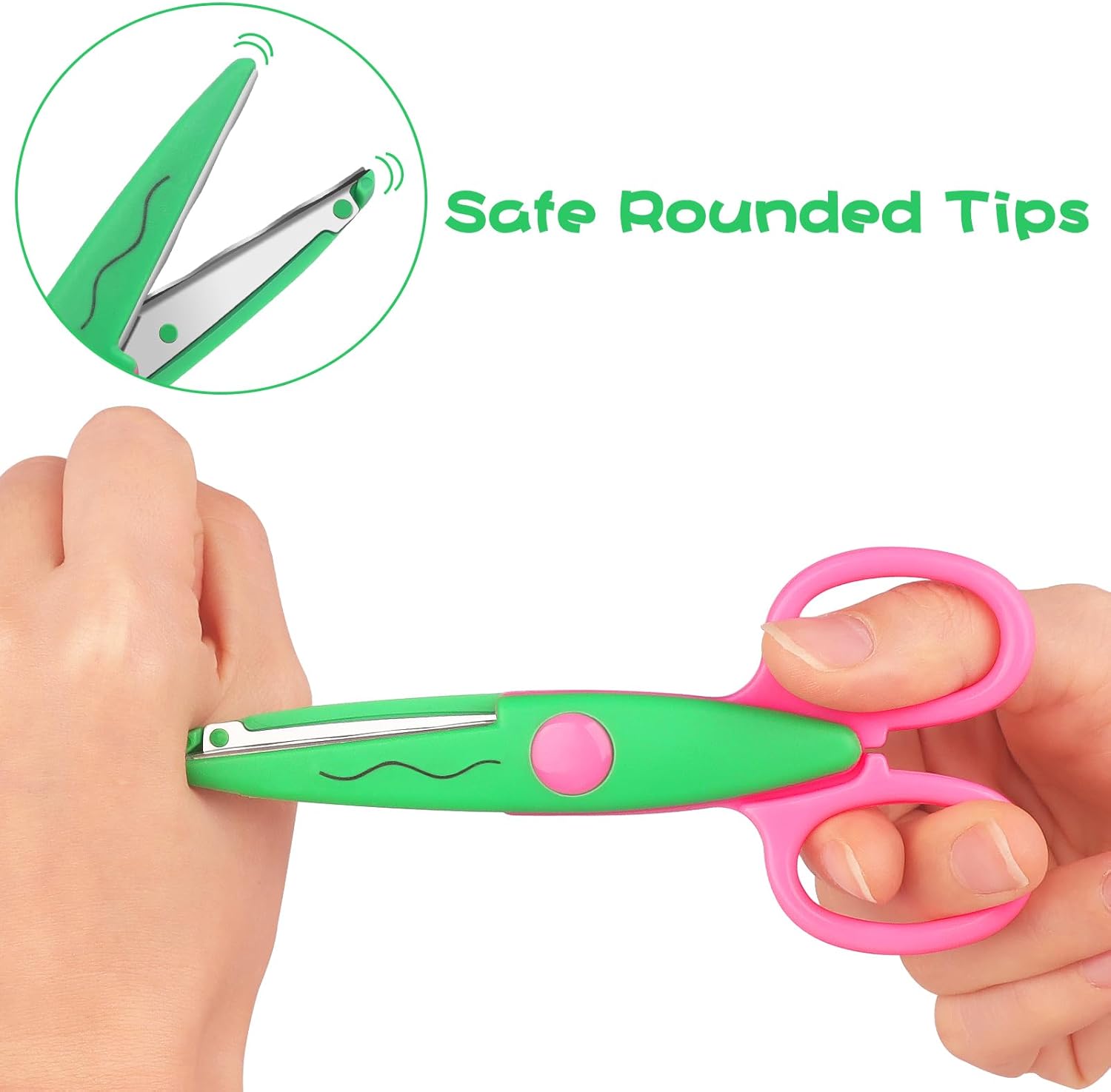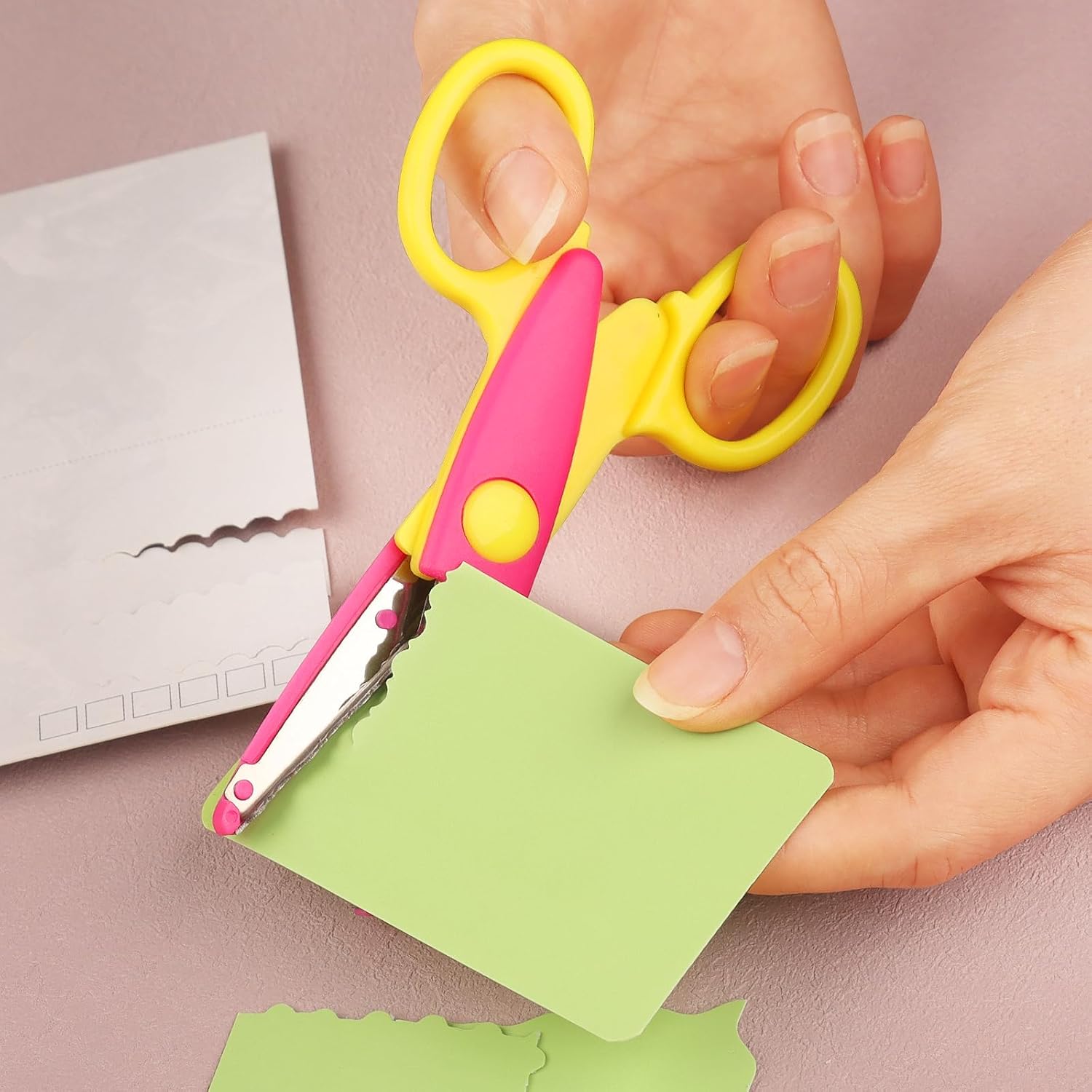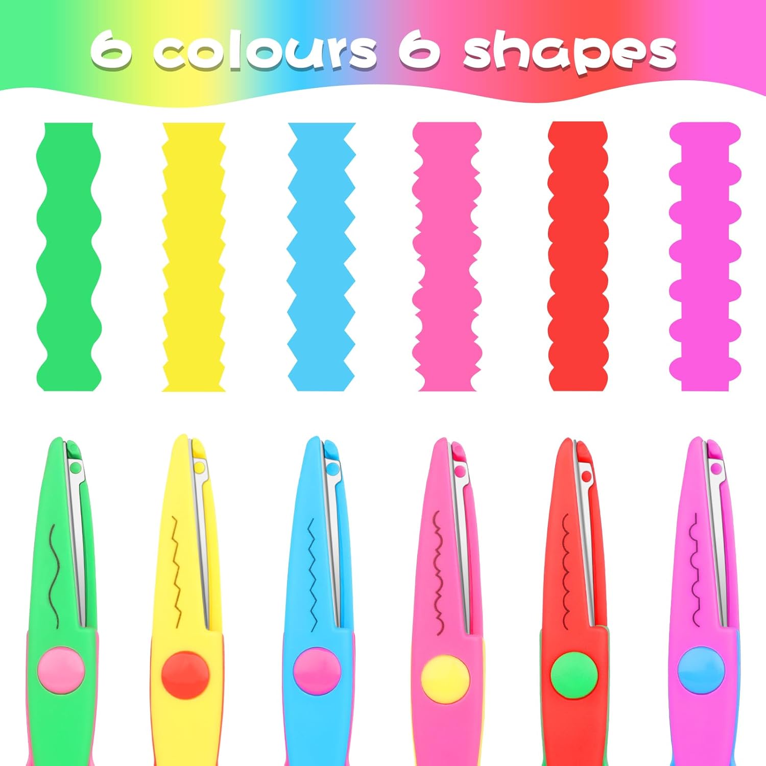 Avrai 6 forbici per bambini in diversi colori, divertenti tagli di carta, ognuna misura 13,5 cm e pesa 20 grammi. Queste forbici presentano colori vivaci e accattivanti come rosa, rosso, giallo, verde e viola che piacciono ai bambini Ogni paio di forbici può ritagliare forme diverse tra cui onde grandi, onde piccole, grandi forme frastagliate, piccole forme frastagliate, ingranaggi stampati e forme del castello. Varie forme possono stimolare l'immaginazione e la creatività del tuo bambino Le forbici colorate per bambini sono realizzate in acciaio inossidabile e plastica di alta qualità, robuste e durevoli. Le forbici per bambini, possono dare ai tuoi bambini visivi, promuovere efficacemente la loro percezione del colore e aumentare l'interesse dell'artigianato dei bambini Confortevoli e morbide al tatto, progettate per il comfort di tutti i bambini, forbici di sicurezza, si prega di notare che le forbici non sono adatte a bambini di età inferiore ai 3 anni Ampia gamma di usi: le graziose forbici per bambini sono perfette per lezioni d'arte prescolari, scuola domestica, corsi di artigianato, ecc., adatte per tagliare la carta o giocare a Cali, album fai da te, biglietti di auguri, album fotografici, ecc., possono facilmente attirare l'attenzione dei bambini, sono un buon aiuto per insegnanti e studenti nella classe di artigianato, ed è anche un buon set per coltivare l'interesse dei bambini per le arti