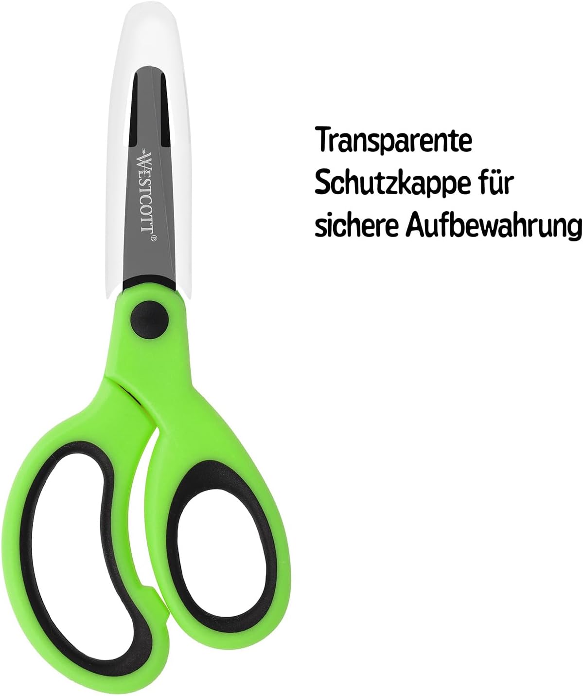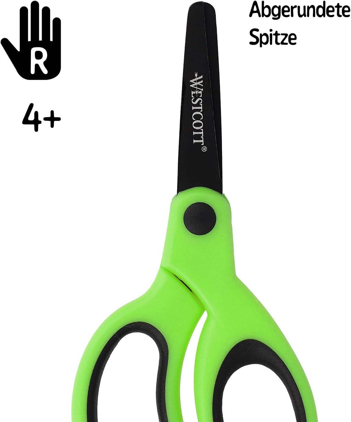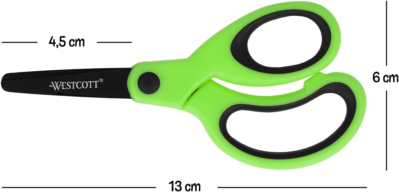 Impugnatura ergonomica e confortevole con impugnatura morbida: l'impugnatura morbida appositamente sviluppata offre alle mani piccole una presa sicura e confortevole, rendendo il taglio facile e confortevole. Punta arrotondata - La punta arrotondata delle forbici garantisce la massima sicurezza e protegge da infortuni, rendendole ideali per i primi tentativi di taglio dei bambini. Dimensioni compatte - Con una lunghezza di 13 cm (5"), le forbici si adattano perfettamente alle dimensioni delle mani dei bambini e facilitano il taglio preciso. Adatte per bambini dai 4 anni in su - Queste forbici per bambini sono state sviluppate appositamente per i bambini in età prescolare dai 4 anni in su, affinché possano imparare a tagliare in modo sicuro e semplice. Qualità dal 1872 - Il marchio Westcott è da oltre 140 anni sinonimo di prodotti per la casa e l'ufficio con un design inconfondibile e un rapporto qualità-prezzo senza precedenti.