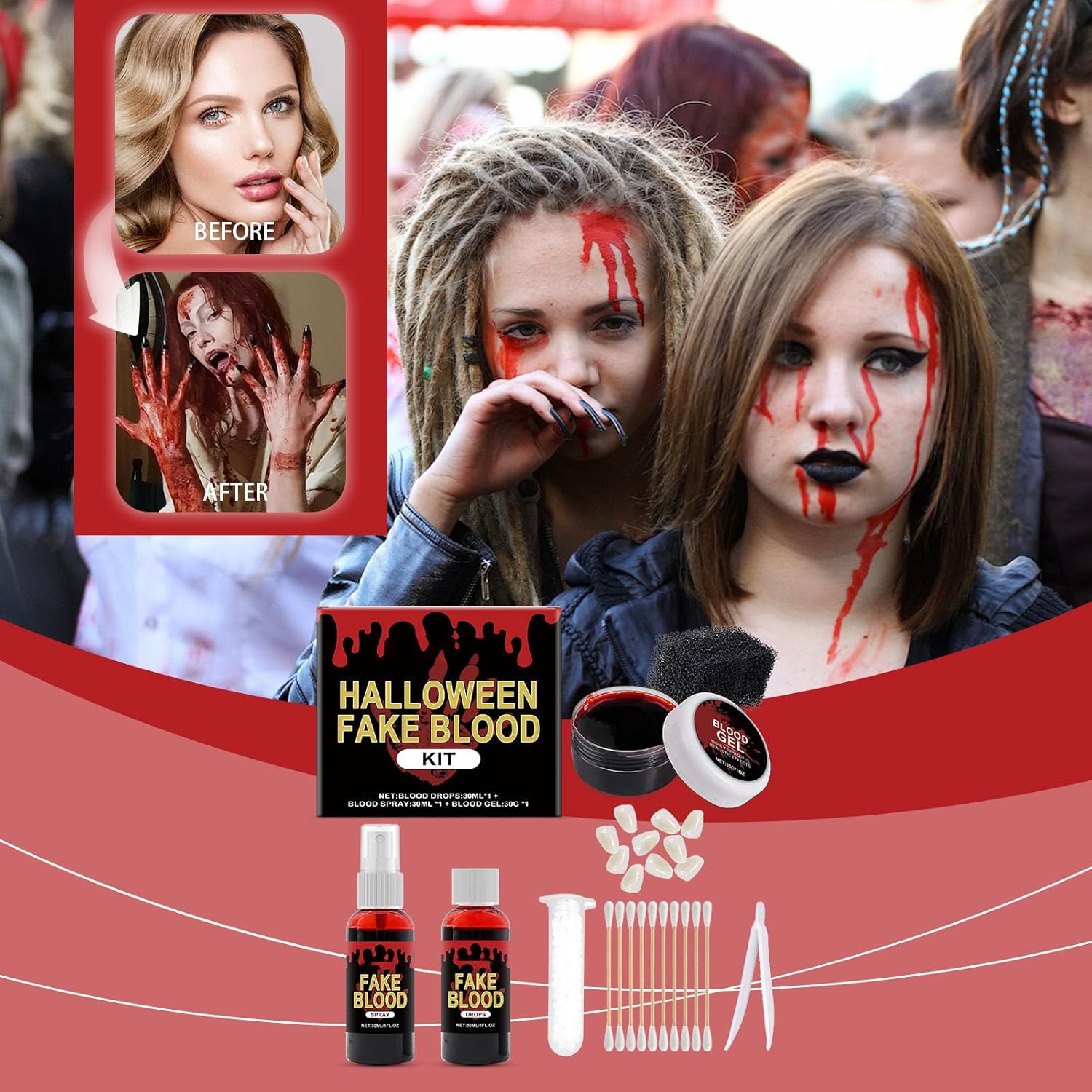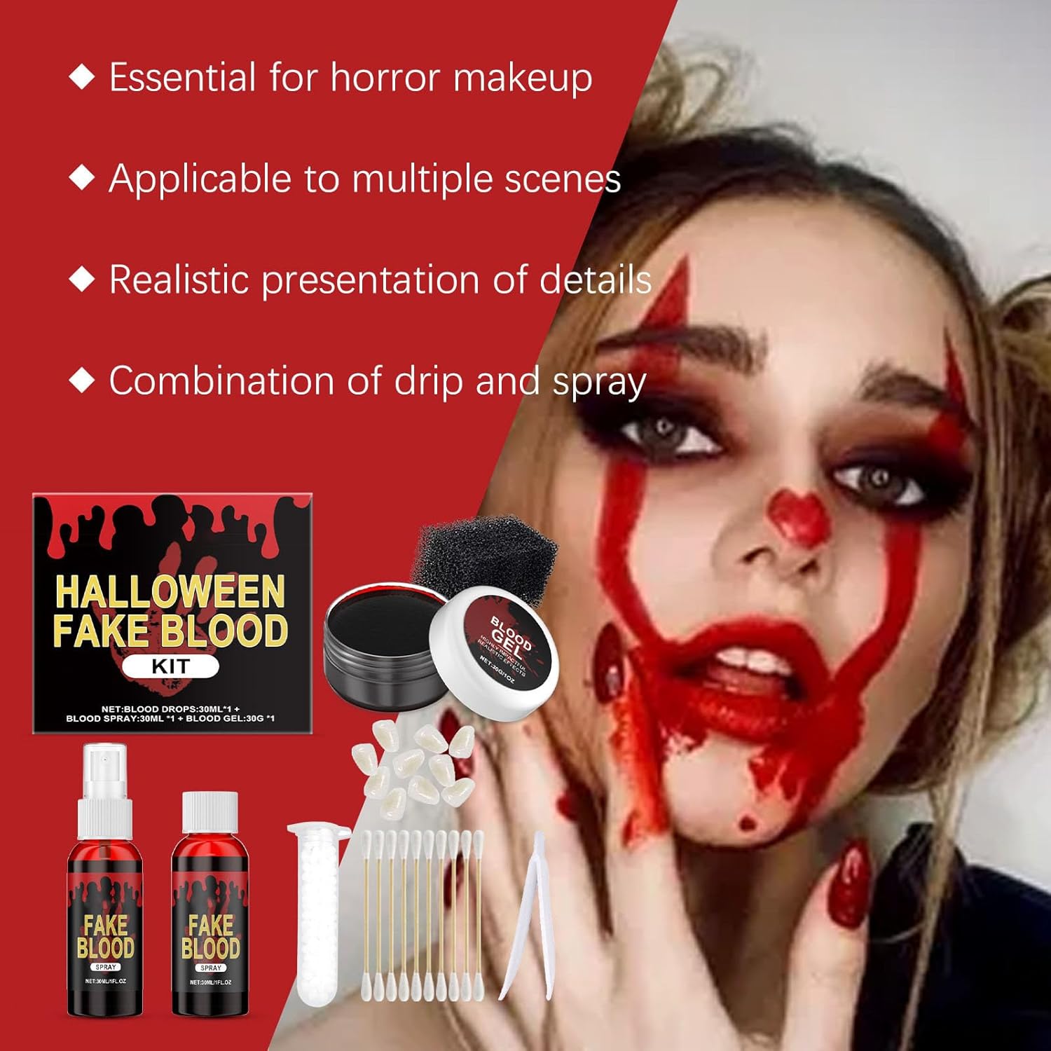 Questo set horror multiuso include applicatori di gel di sangue, strumenti e varie dimensioni di zanne per creare effetti sanguinanti di grado professionale per trucco di Halloween, eventi cosplay o spettacoli di case infestate Migliora servizi fotografici a tema, concorsi in costume o scherzi con formule lavabili e sicure per la pelle che si rimuovono facilmente utilizzando acqua calda e sapone Ideale per gli appassionati di cosplay, feste di Halloween e artisti teatrali che cercano un'estetica autentica e spaventosa con confortevole, riutilizzabile in tre livelli di nitidezza (1,3-1,7 cm Il set di sangue finto di Halloween offre sangue finto sicuro a base di malto e zanne spaventose realistiche per effetti di trucco drammatici ma delicati sui denti, per creare gocce agghiaccianti o look imbevuti di sangue Dispone di adesivo sicuro per un posizionamento sicuro senza danni, abbinato a gel sanguigno da 30 ml e spugne antigraffio per applicazioni di trucco horror strutturate e di lunga durata
