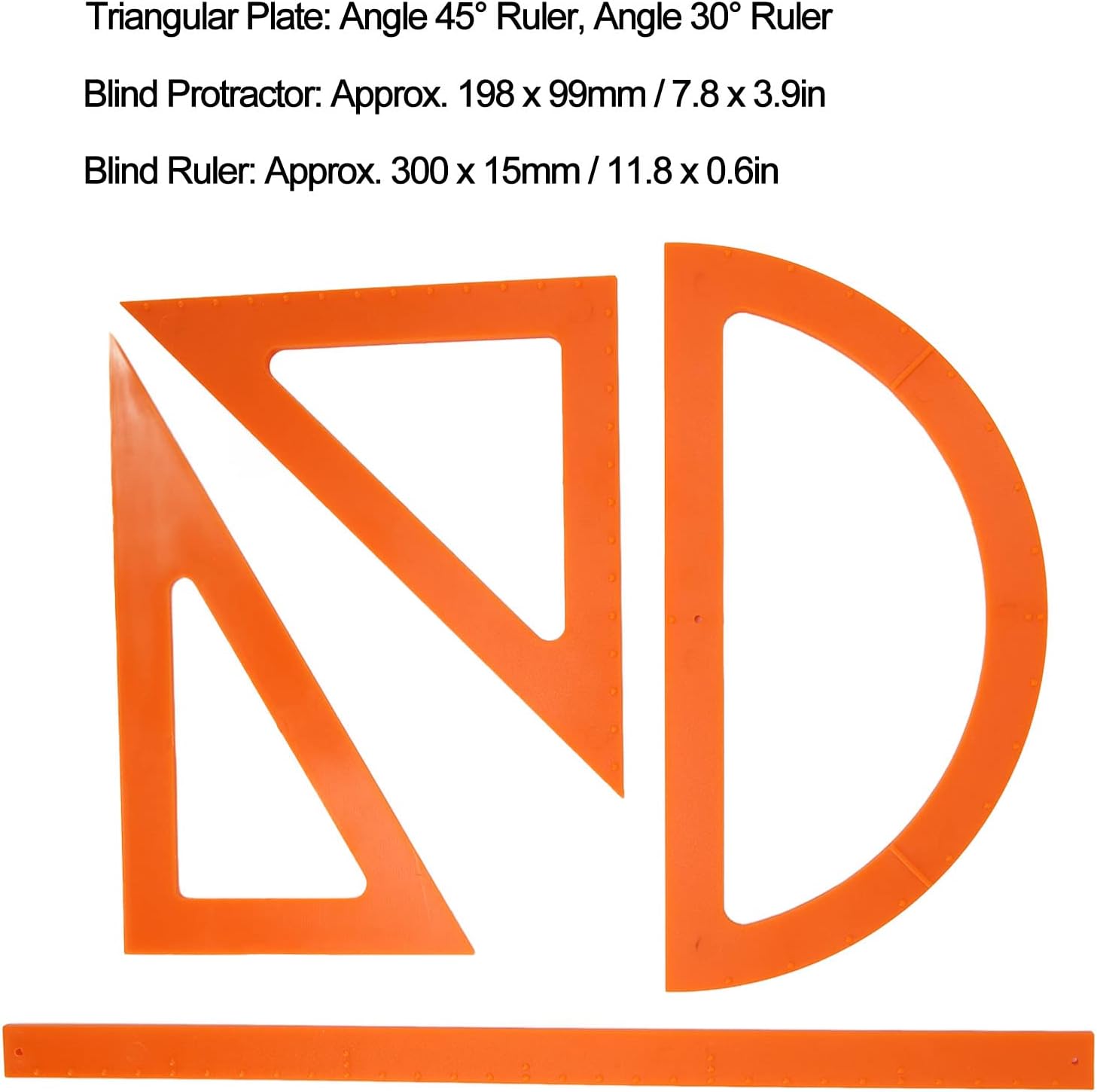Materiale ABS: set di righelli ciechi erano realizzati con materiali ABS, forti e durevoli quando si utilizza. Dati accurati: la scala per una misurazione accurata è molto accurata durante l'apprendimento e la misurazione. Facile da usare per i ciechi: con un design di bump, i ciechi e le persone con vista povera possono sentire la scala per tocco. Applicabile a: è adatto alle persone con vista e scuole per i ciechi e può imparare le conoscenze relative alla misurazione. Specifiche: tra cui 300 x 15 mm di righello cieco, 198 x 99 mm di ginnastica, piastra triangolare da 30 gradi e piastra triangolare a 45 gradi.