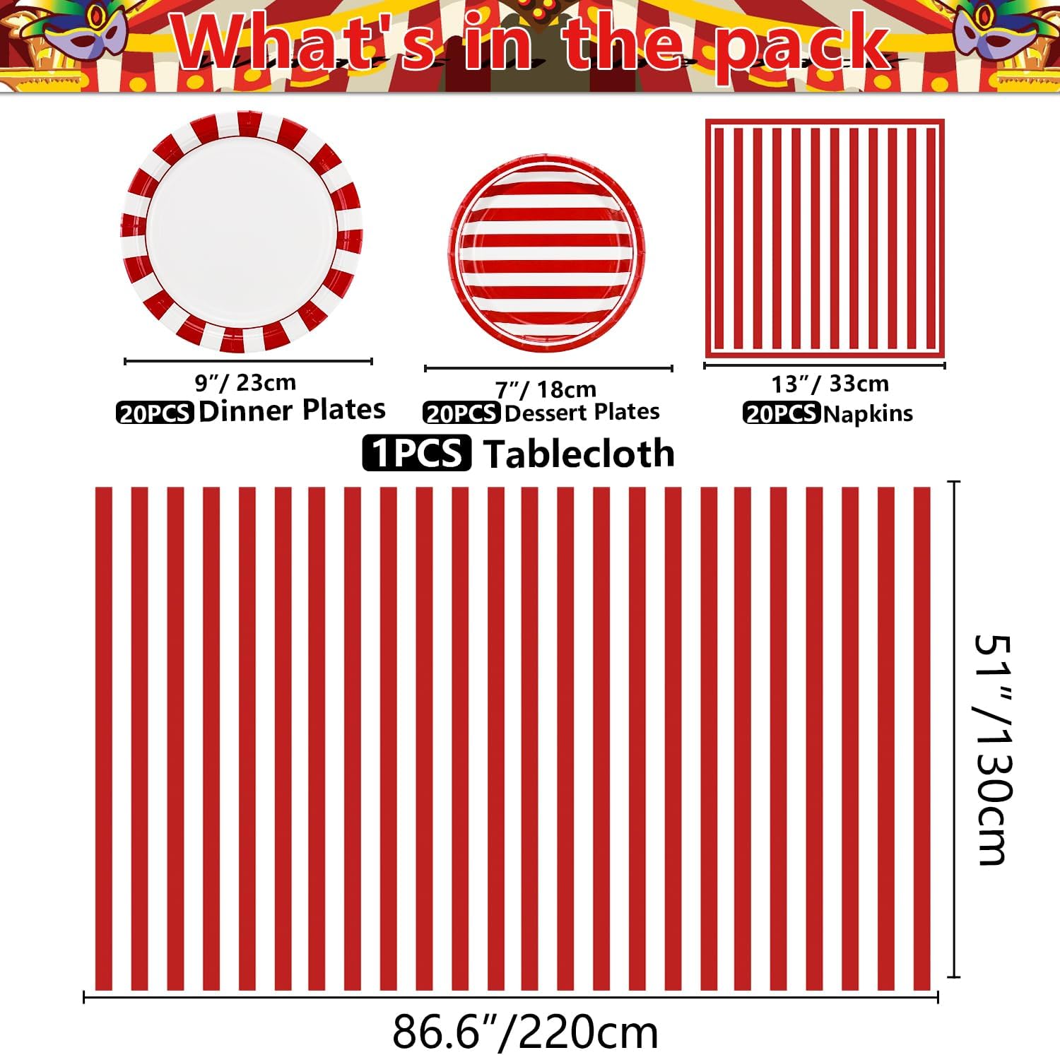 Le decorazioni per feste a tema carnevale includono: 20 piatti piani di carta, 20 piatti da dessert di carta, 20 tovaglioli di carnevale, 1 tovaglia a righe rosse e bianche. Totale 61 pezzi, potrebbe servire 20 ospiti. Design classico a righe rosse e bianche: tutti i pezzi della confezione sono progettati con strisce rosse e bianche, questo design unico è il display perfetto per la tua festa di carnevale, Natale o altre festività. Il colore accattivante e il design a strisce potrebbero creare facilmente un'atmosfera felice e fare un'impressione sui tuoi ospiti. 【Ampiamente usato】: ottimo tocco come forniture per feste di carnevale, decorazioni per feste di compleanno, decorazioni per carnevale scolastico, forniture natalizie, baby shower, feste di vacanza, barbecue, eventi interni ed esterni o qualsiasi altro evento a tema circo per bambini e adulti. Alta qualità: questi piatti e tovaglioli per feste di carnevale sono realizzati in carta spessa, leggeri e sicuri. Le tovaglie di carnevale sono realizzate in plastica, impermeabile, durevole e resistente alle macchie, potrebbe proteggere bene il tavolo. Dimensioni perfette: il diametro del piatto di carta è di 23 cm, il piatto da dessert di carta misura 18 cm, il tovagliolo per feste misura 33 x 33 cm, la tovaglia a righe rosse e bianche misura 137 x 274 cm, la tovaglia rettangolare di grandi dimensioni si adatta alla maggior parte dei tavoli.