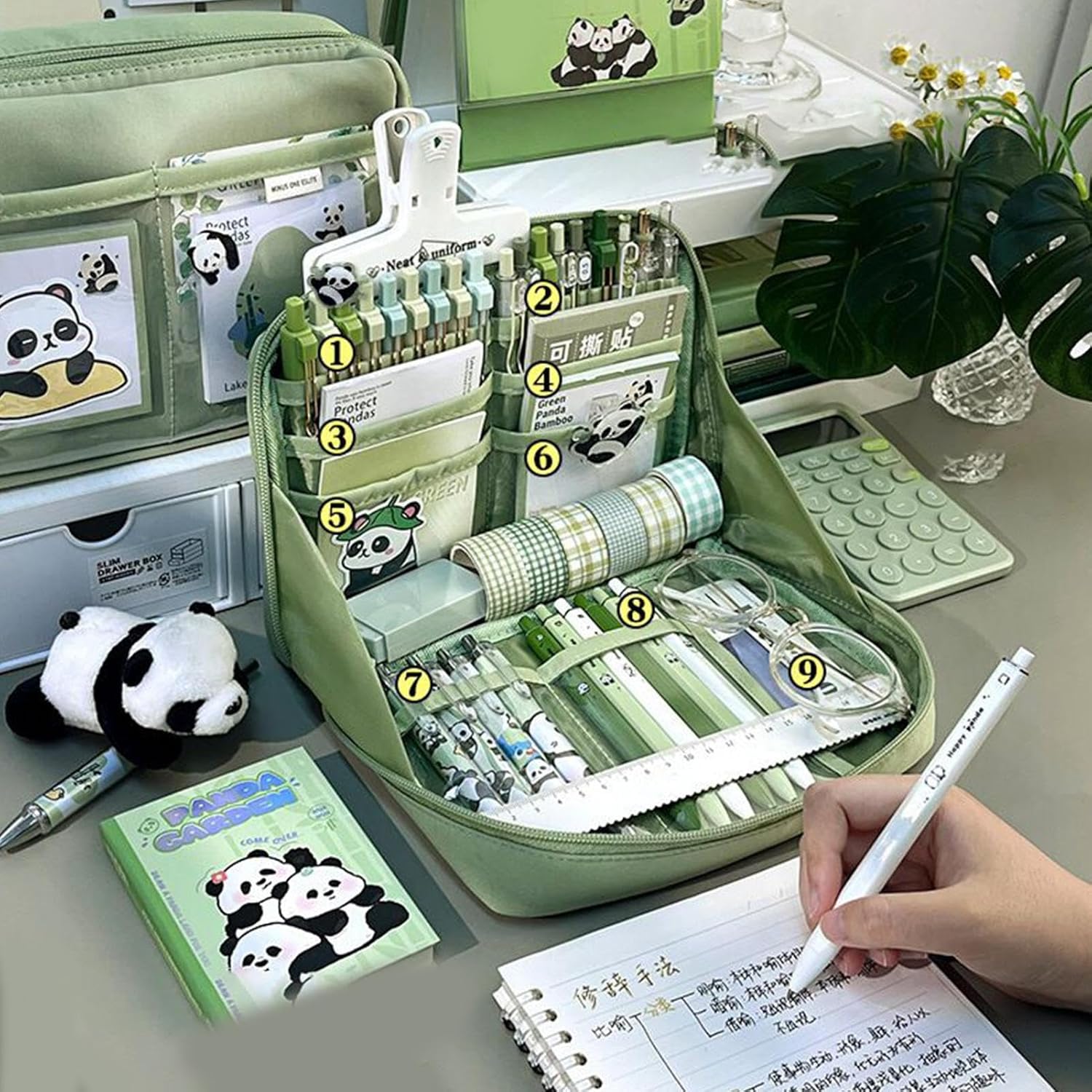 Pratico kit tematico: include penne panda e nastri correttori, questo set offre soluzioni di forniture funzionali che facilitano naturalmente le attività educative e i progetti creativi Penne versatili: progettate per prendere appunti, diari e creazioni. Simpatica forma panda con scrittura fluida, mentre evidenziatori e penne colorate aggiungono tocchi vibranti per l'uso quotidiano Stimola l'immaginazione: adesivi decorativi a tema panda personalizzano quaderni e forniture scolastiche con piacere, risvegliando la creatività artistica in modo giocoso e piacevole. Accessibilità Ottimizzata: design ergonomico con guide fluide che consentono un accesso immediato alle forniture. I divisori traforati mantengono ogni articolo al suo posto, fornendo visibilità immediata del contenuto, ideale per una rapida conservazione in classe. Scelta regalo ideale: set regalo progettato per esprimere i vostri migliori auguri, scelta perfetta per la festa di compleanno o compleanno. La sua eleganza e portabilità creano un'esperienza memorabile per i giovani scolari ad ogni utilizzo.
