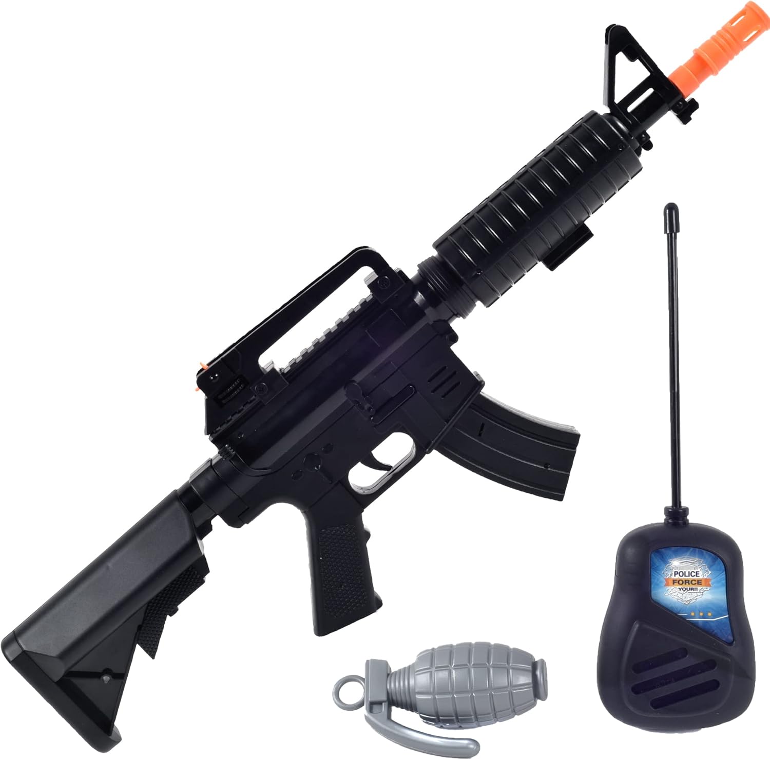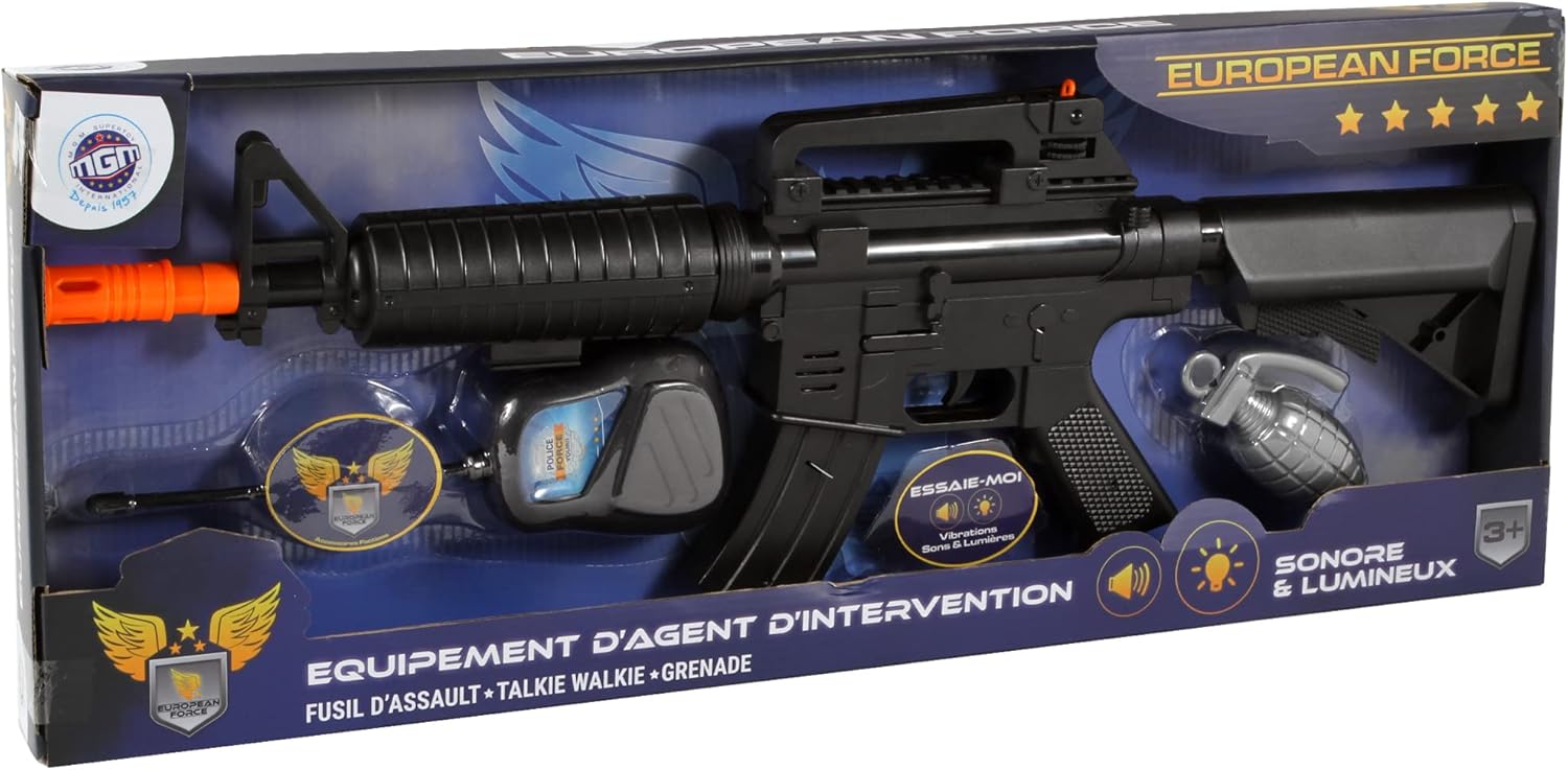IL TUO NUOVO GIOCATTOLO: questa mitragliatrice per bambini è un ottimo modo per incoraggiare l'immaginazione divertendosi. Grazie a questo giocattolo, potranno rivivere le battaglie dei loro eroi preferiti da soli o con gli amici CONTENUTO: Questo gioco contiene 1 mitragliatrice sonica e leggera, 1 Malkie talkie e 1 granata. Sono fatti di plastica. La mitragliatrice funziona con 2 batterie AA sostituibili in dotazione. COSTUMI LUNGA VITA: Quando i bambini giocano, spesso sognano di diventare eroi intrepidi. Grazie a questo mitragliatore potrai aiutare tuo figlio a vivere questi sogni e a sentirsi un vero soldato! GIOCATTOLI SENZA TEMPO: Intramontabili ed essenziali, i travestimenti sono al centro del divertimento, permetteranno ai tuoi bambini di divertirsi anche in tua assenza. LE TUE PISTOLE, PRONTE? ANDARE! : La marca European Force del gruppo MGM propone una gamma di giocattoli ispirati all'universo militare, per permettere ai bambini di divertirsi creando scenari di missione e salvataggio. Gioca come gli adulti!